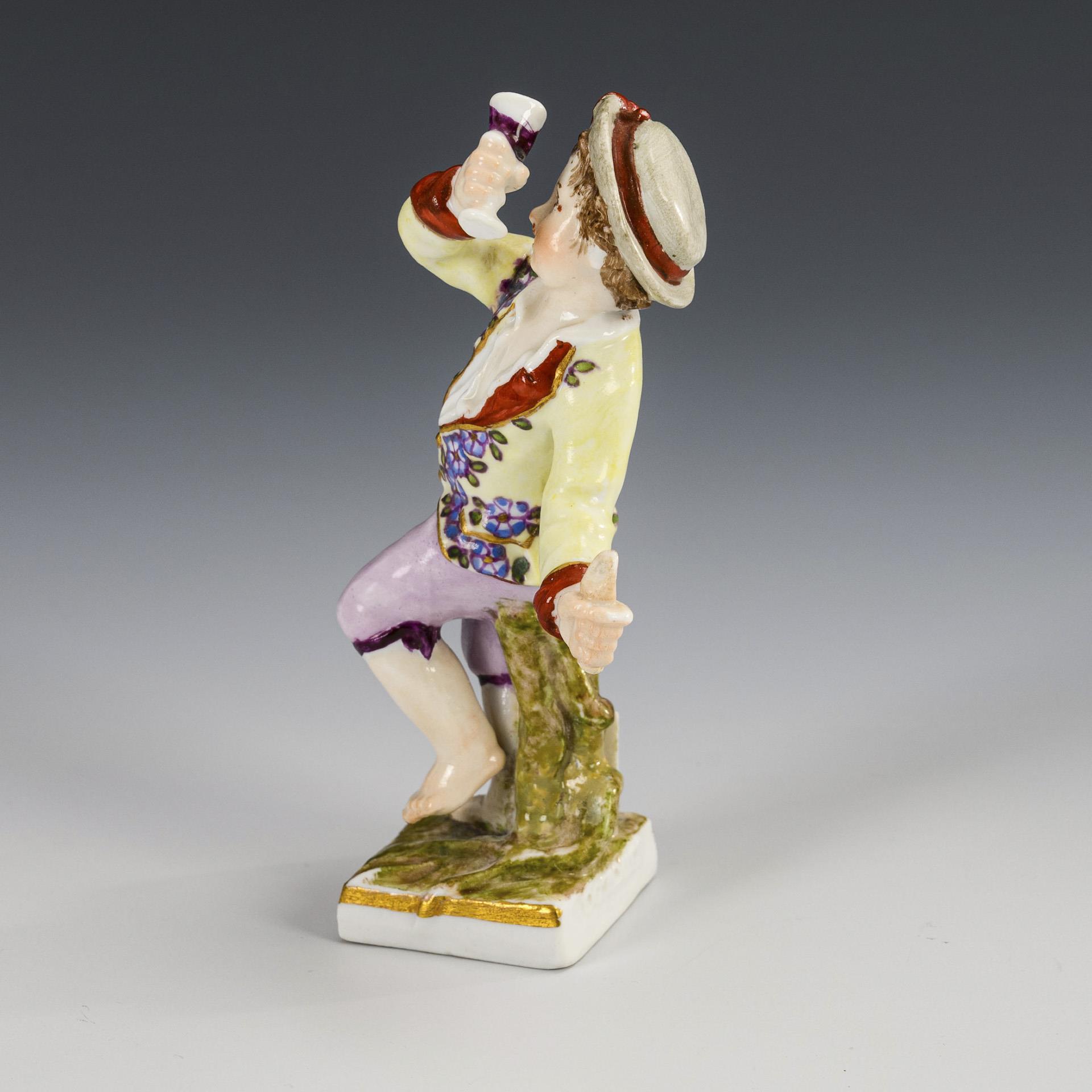 An einem Baumstamm stehender Gärtnerknabe mit Weinglas, zu seinen Füßen ein Schild mit dem Relief der Waage stehend, verso bezeichnet "Oktober". Rechtes Bein restauriert.