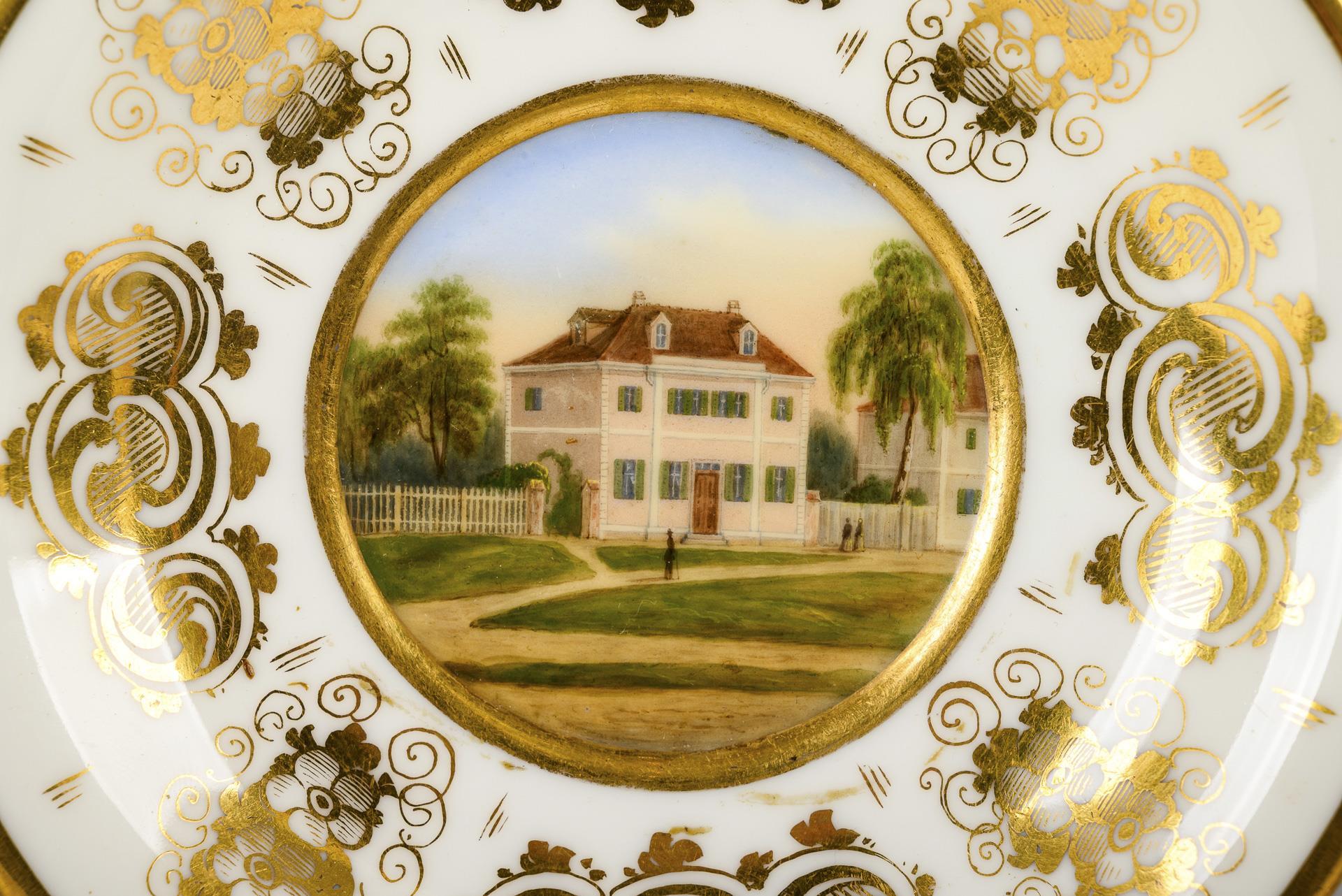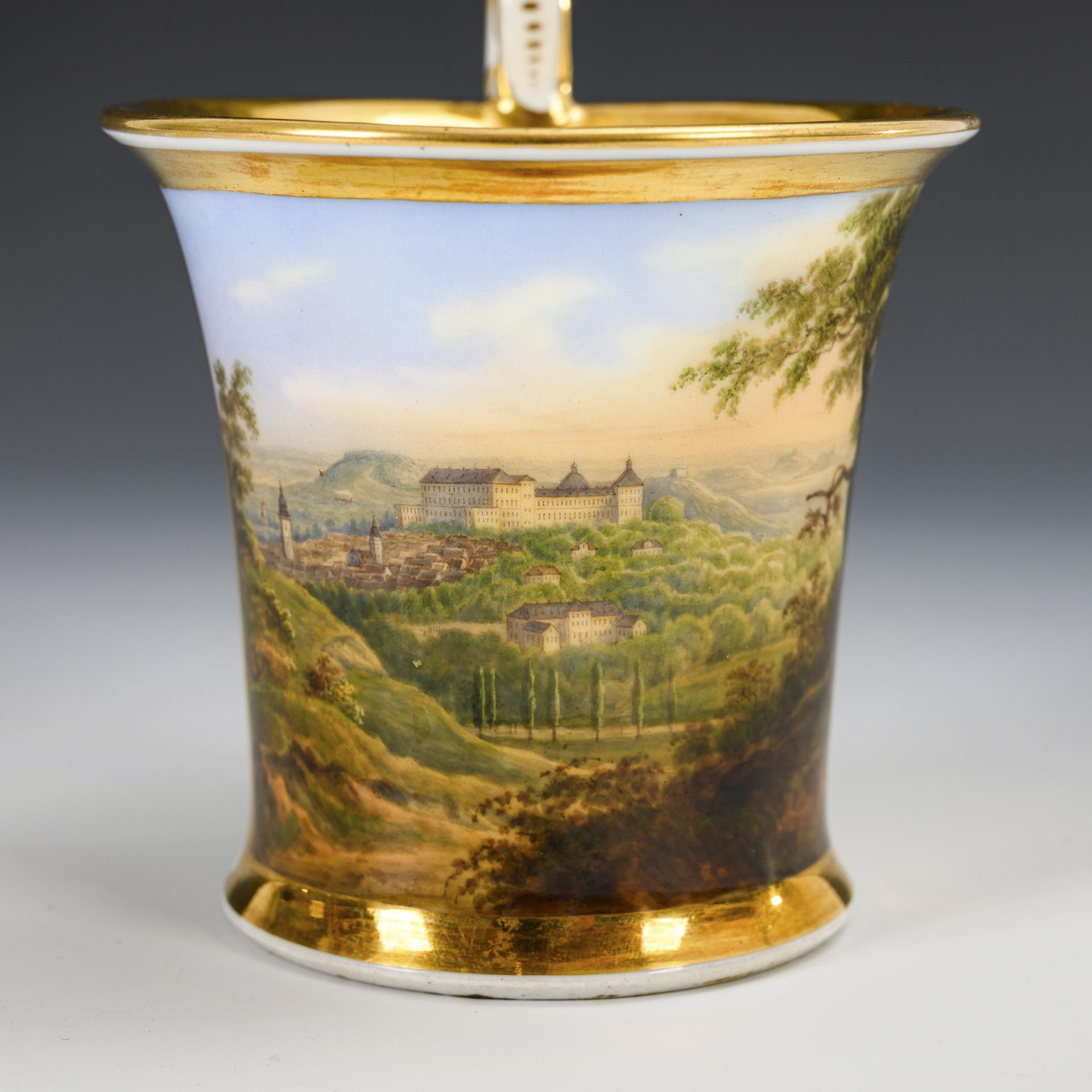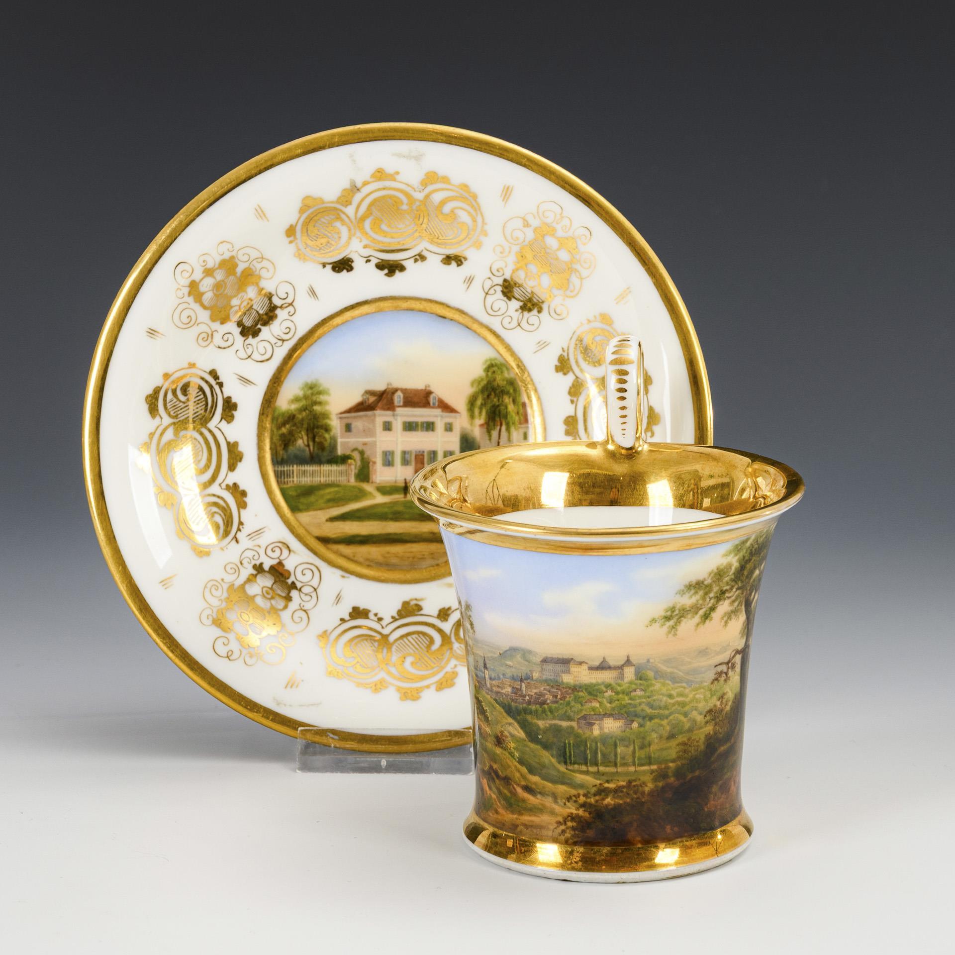 Kratertasse mit hochgeschwungenem Henkel. Schauseitig eine goldgerahmte Rechteckkartusche mit der Ansicht der Stadt Gotha, im Spiegel der Untertasse die Ansicht eines Gartenhauses.