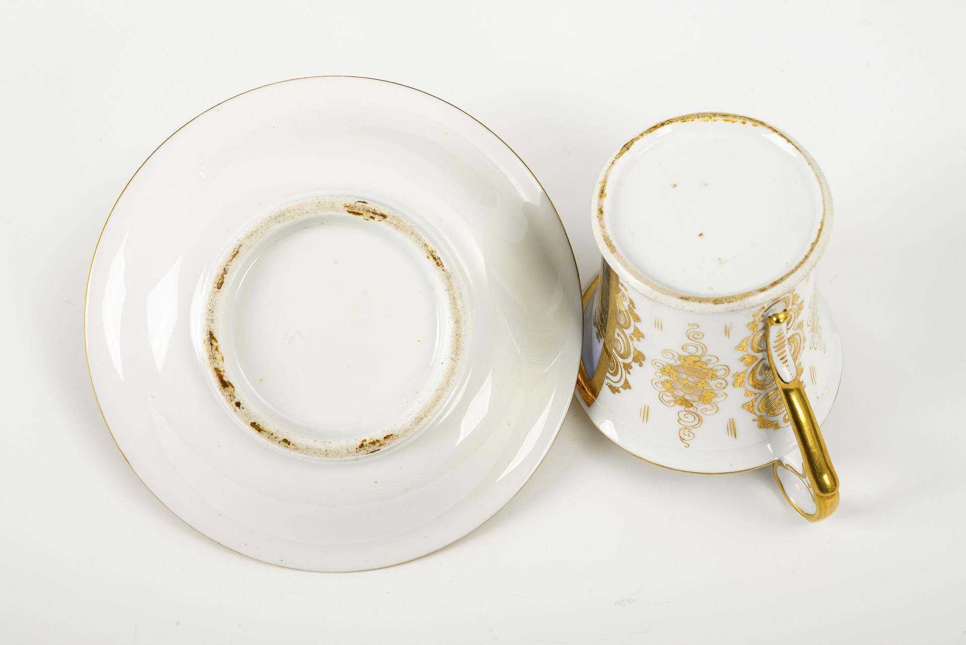 Polychrom bemalt, goldstaffiert. Tasse (H 10,5 cm), ergänzte Untertasse (Ø 15 cm). 320 g.