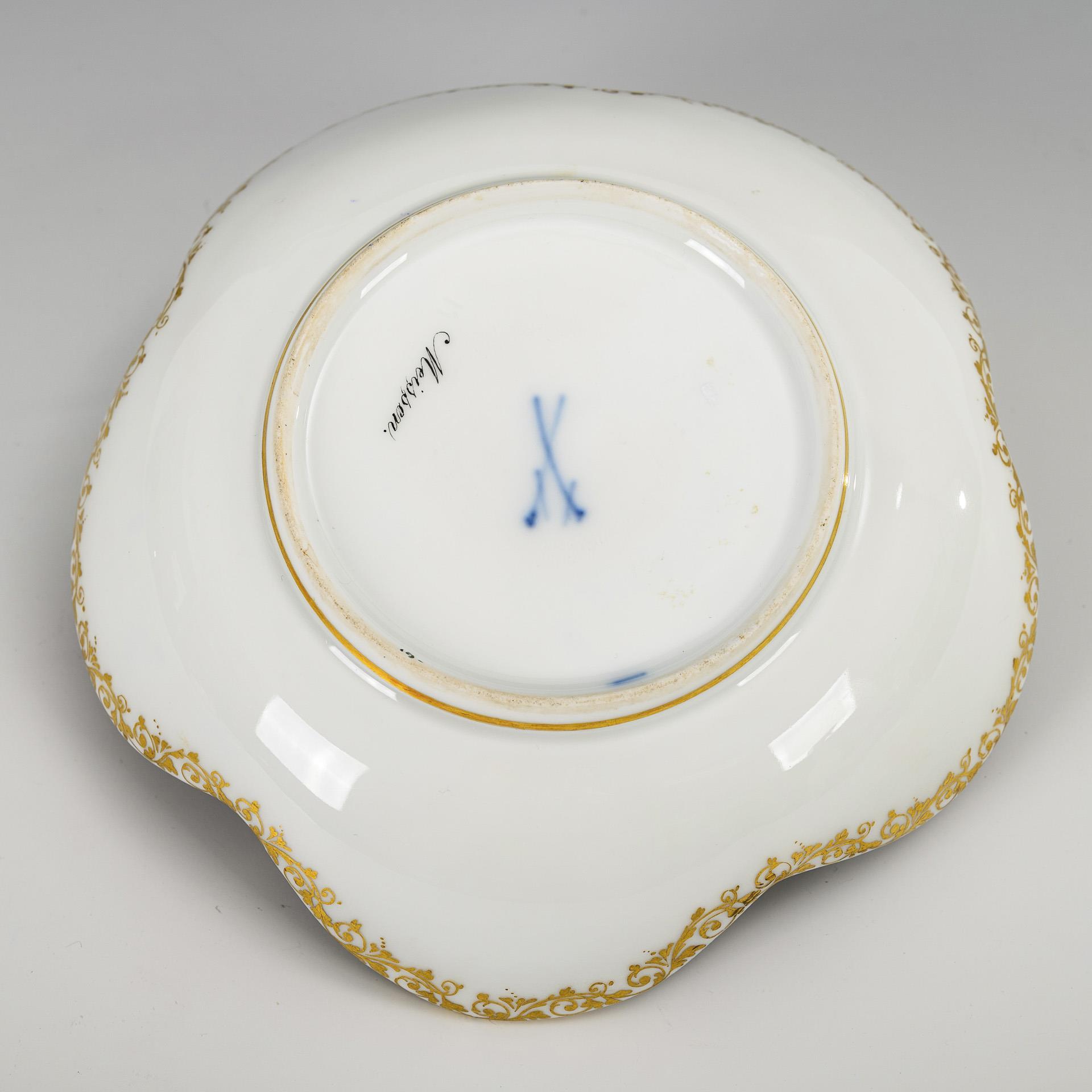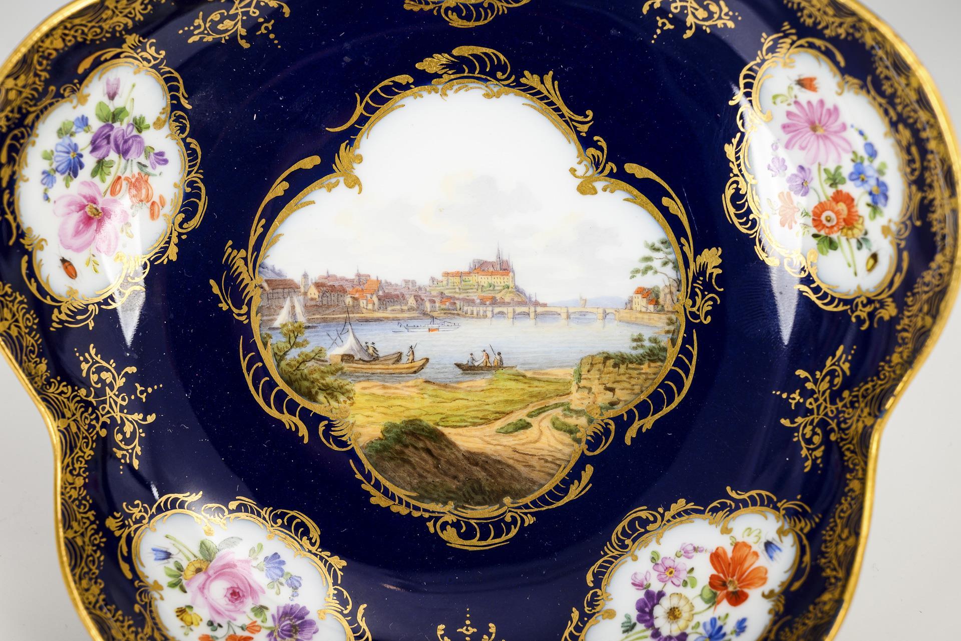 Form "Großer Ausschnitt". Kobaltblauer Fond mit ornamentaler Goldmalerei, im Spiegel eine Vierpasskartusche mit der unterseitig bezeichneten Ansicht von Meißen, auf der Fahne fünf Vierpasskartuschen mit Blumenbuketts.