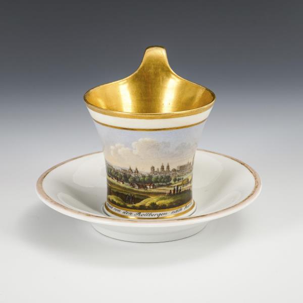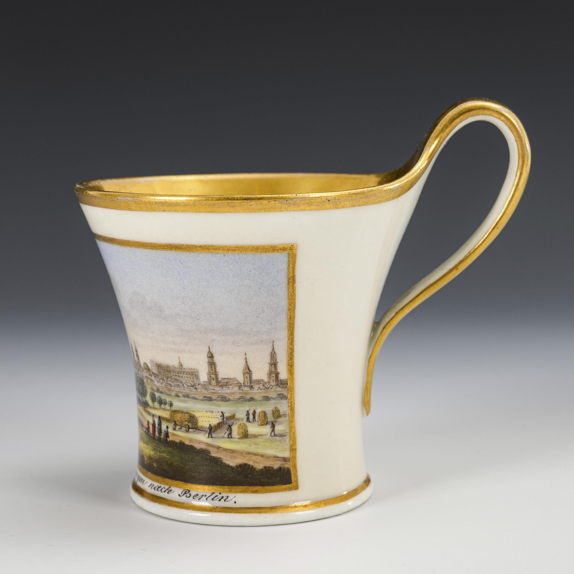 Kratertasse mit hoch geschwungenem Henkel. Schauseitig eine goldgerahmte Rechteckkartusche mit der bezeichneten Ansicht der Stadt Berlin vom Rollberg aus, innen vergoldet. Untertassengold berieben.