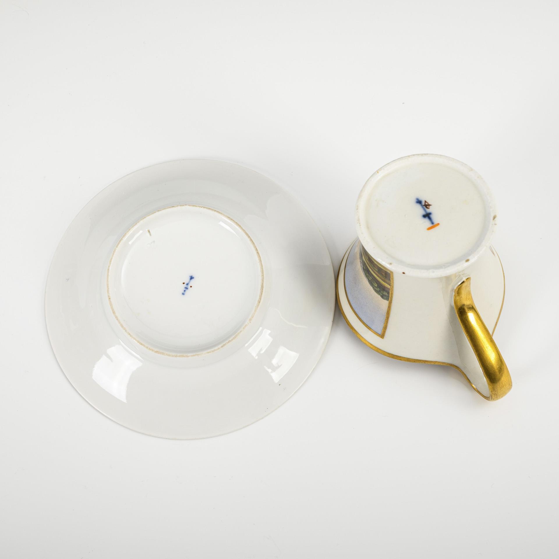 Polychrom bemalt, goldstaffiert. Tasse (H 9 cm), ergänzte Untertasse (Ø 13,5 cm). 290 g.
