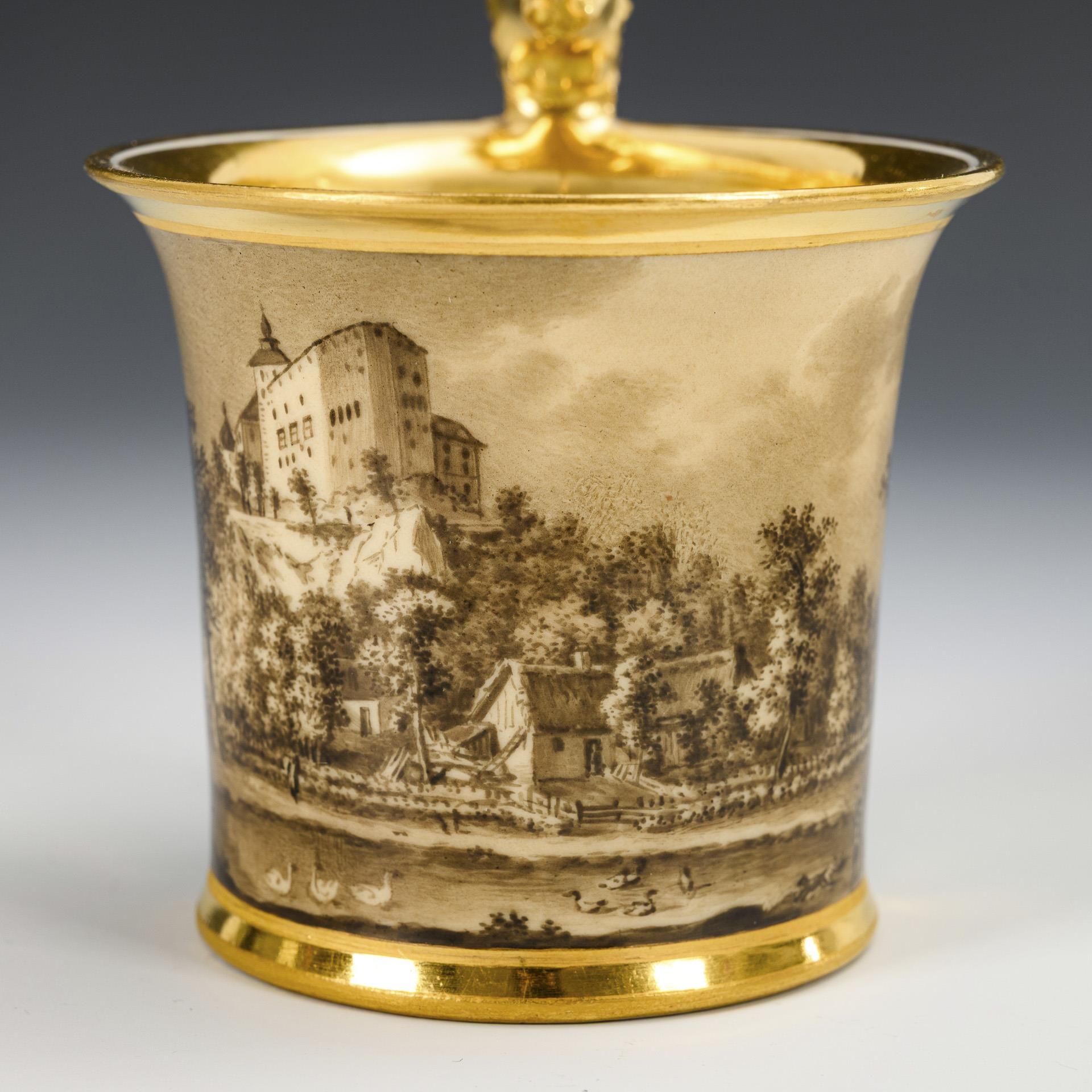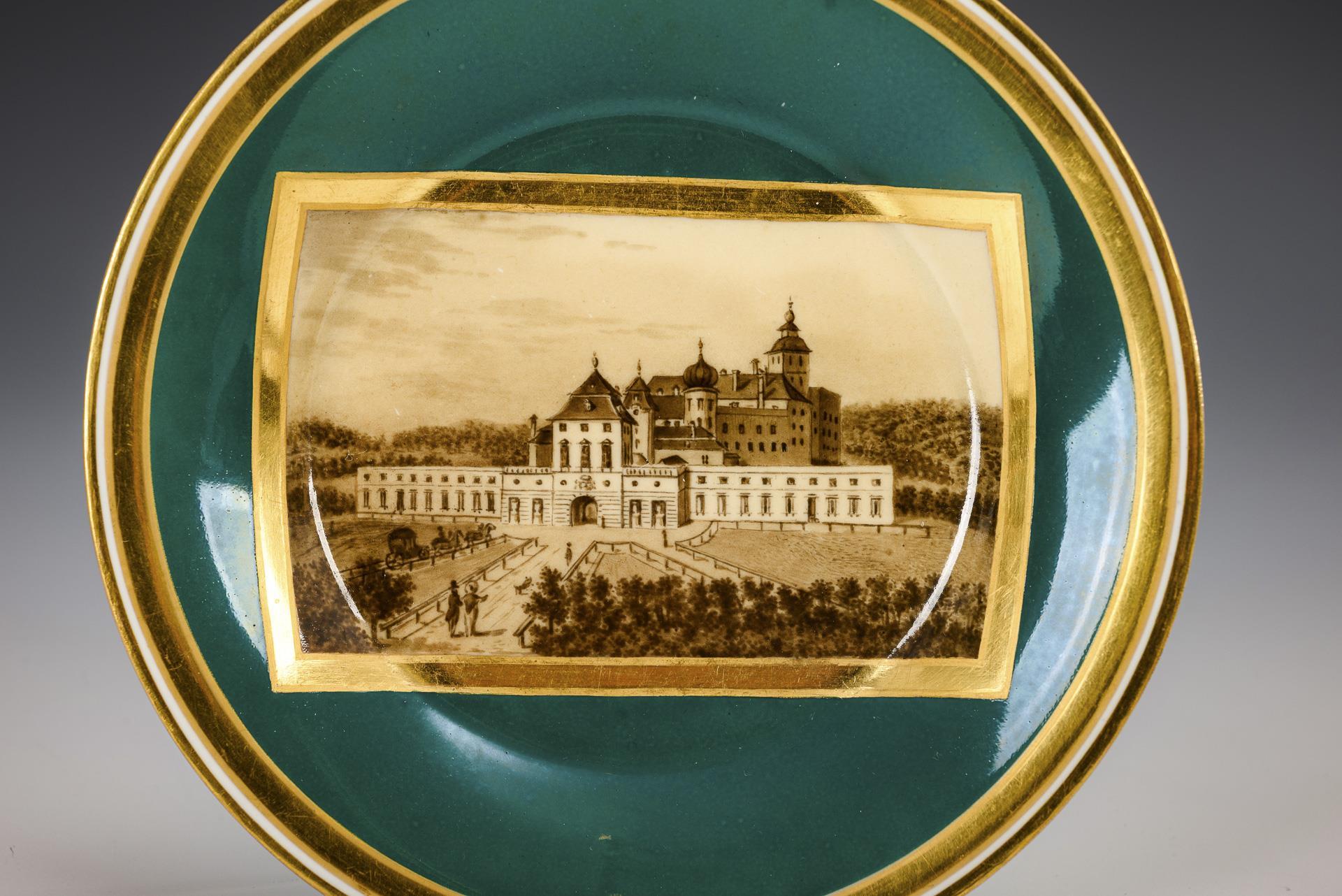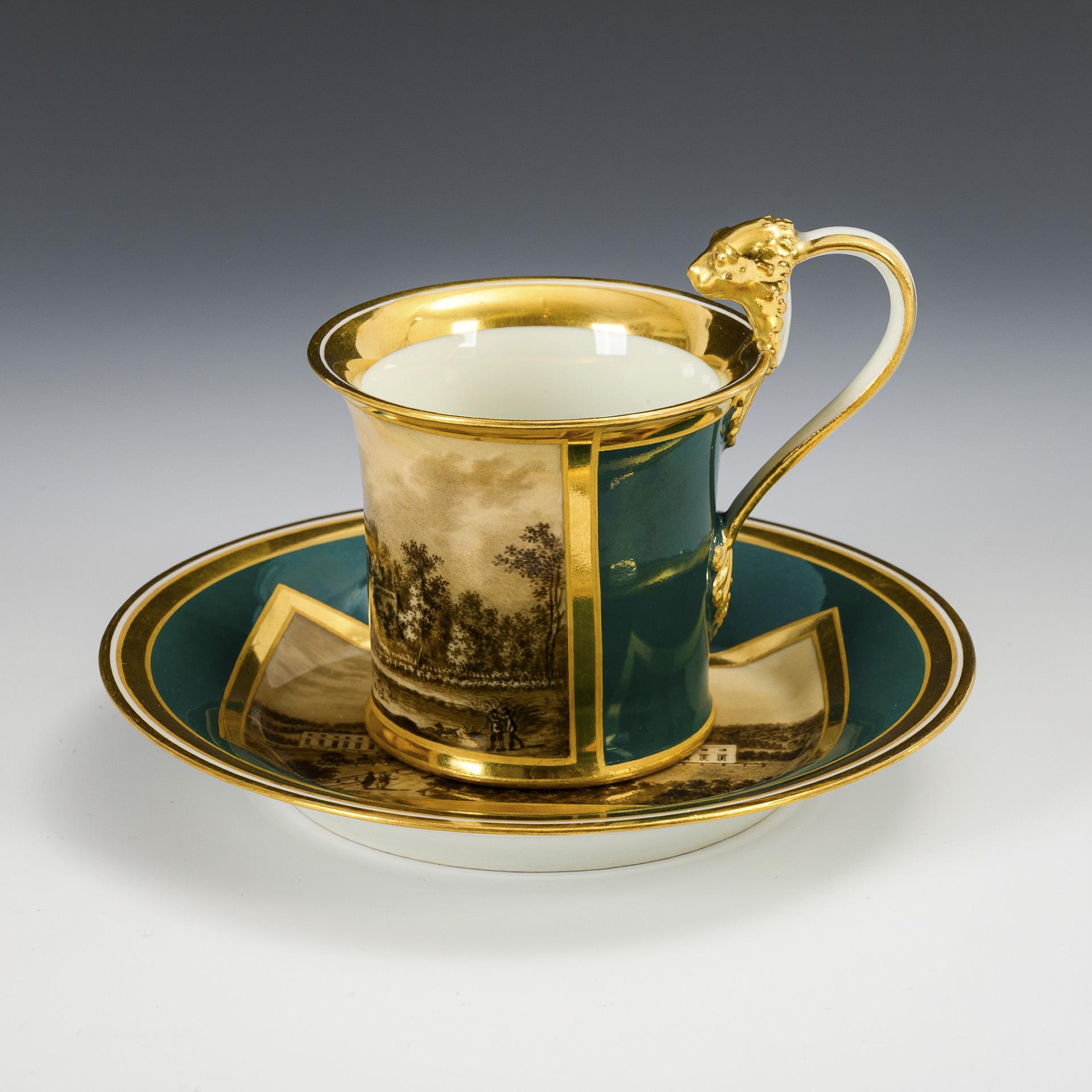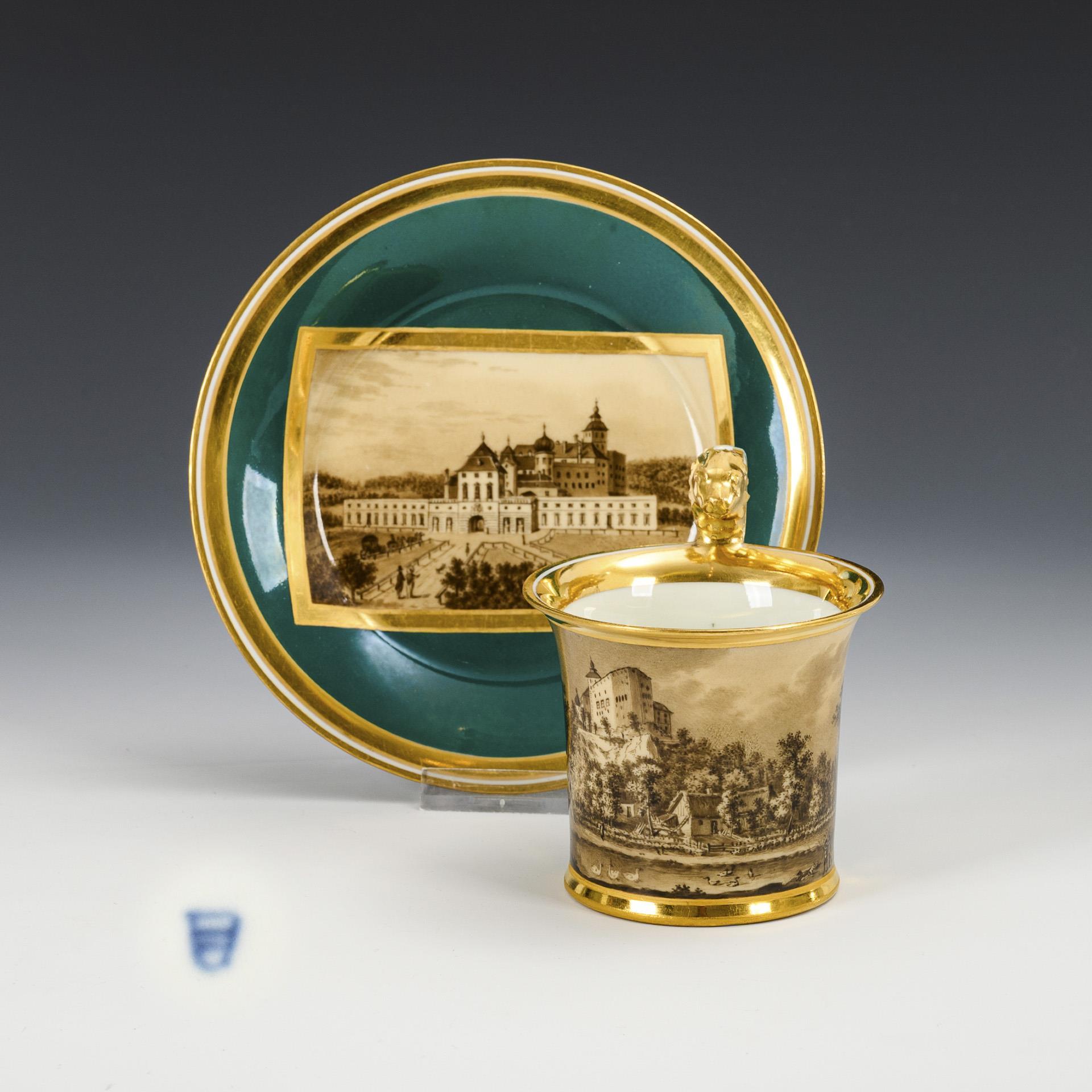 Kratertasse mit Löwenkopfhenkel. Dunkelgrüner Fond, schauseitig eine goldgerahmte Rechteckkartusche mit der sepiagemalten Ansicht einer Burg, im Spiegel der Untertasse eine Schlossansicht.