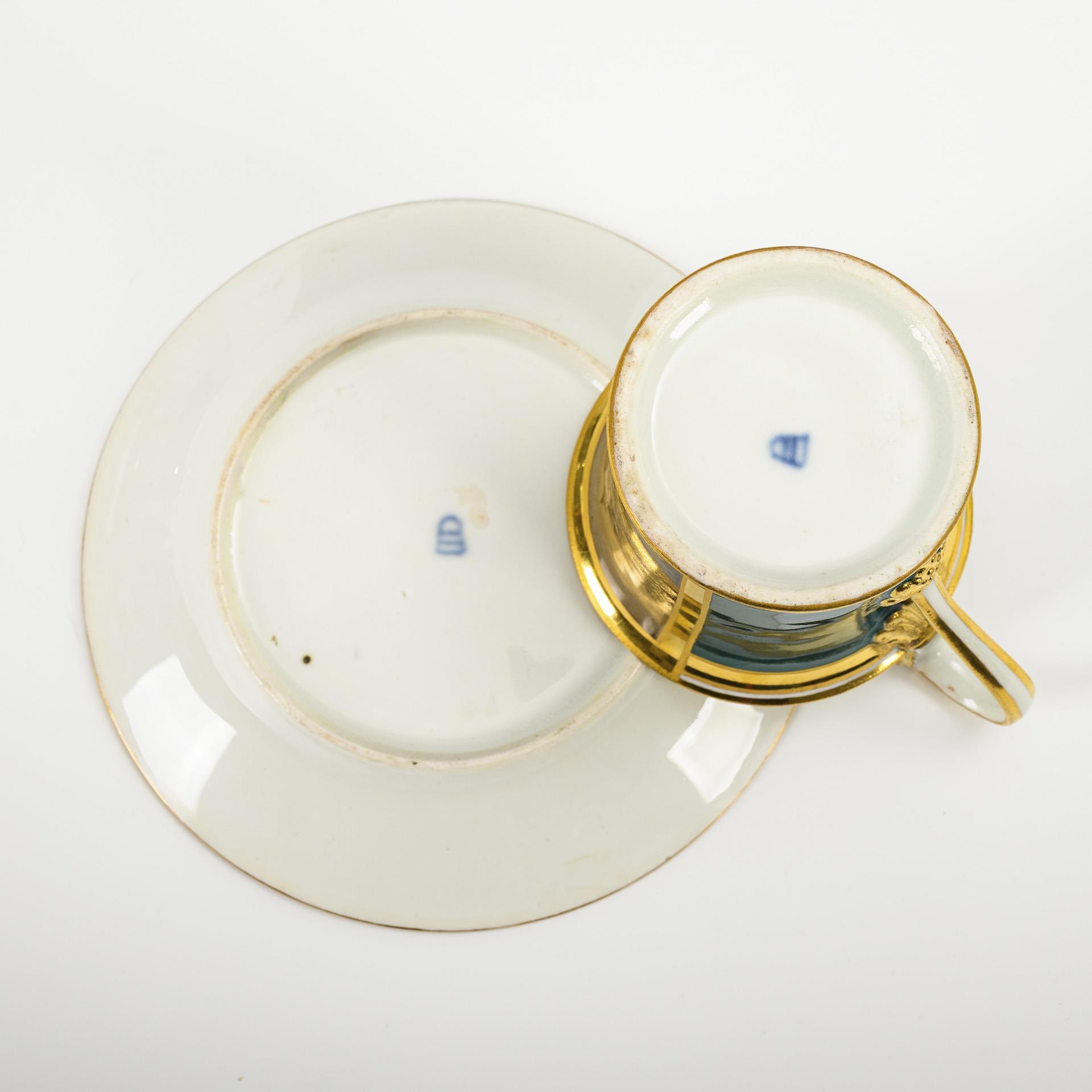 Polychrom bemalt, goldstaffiert. Tasse (H 9,5 cm) originale Untertasse (Ø 15,5 cm). 310 g.