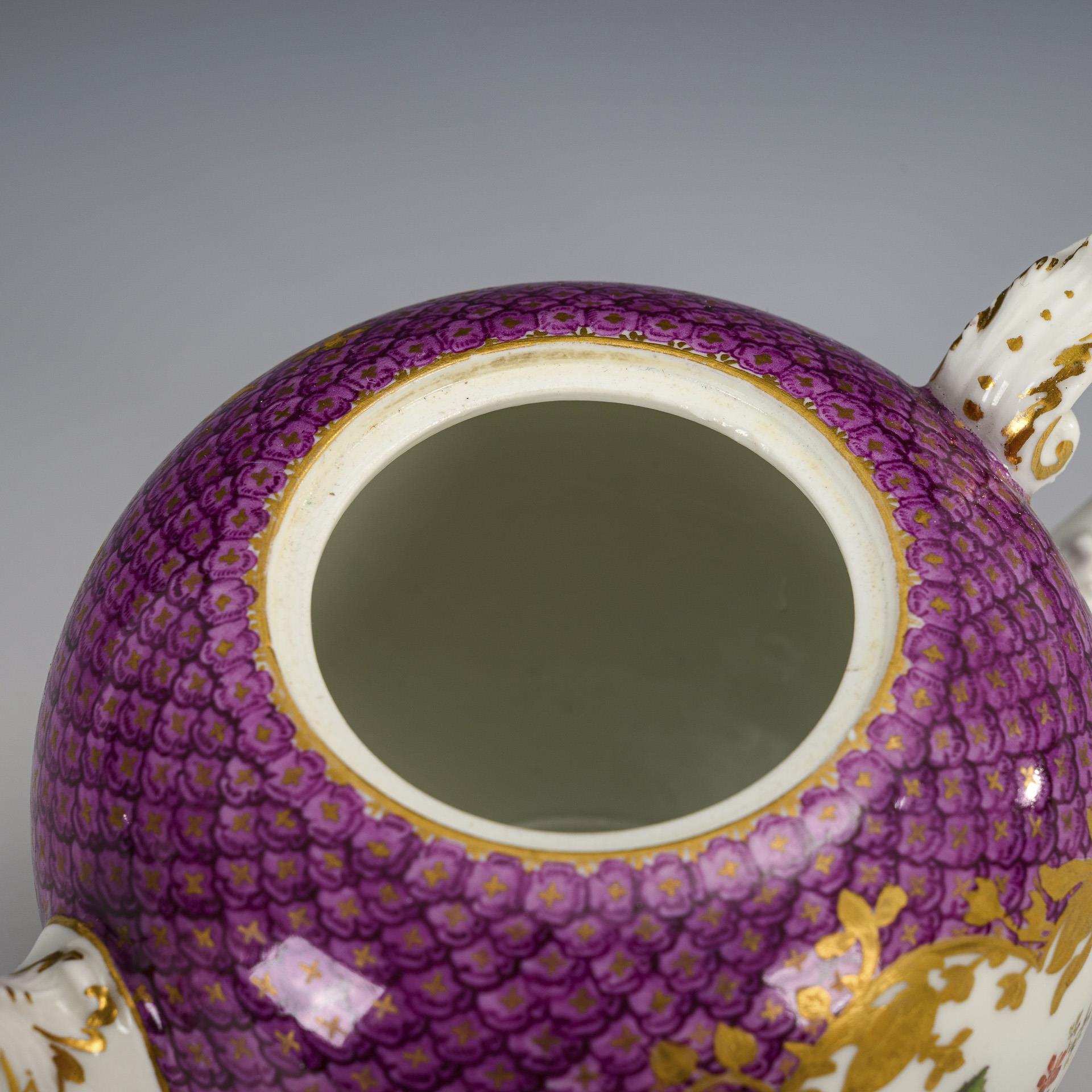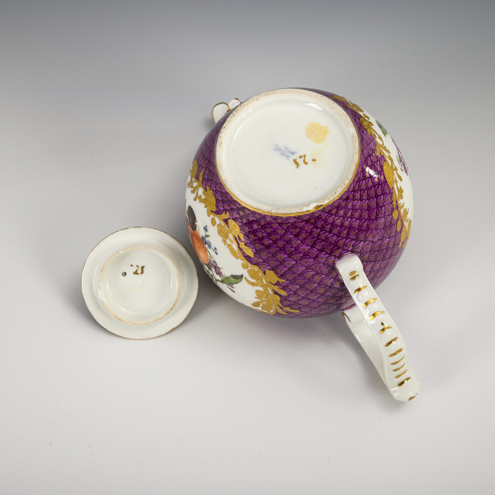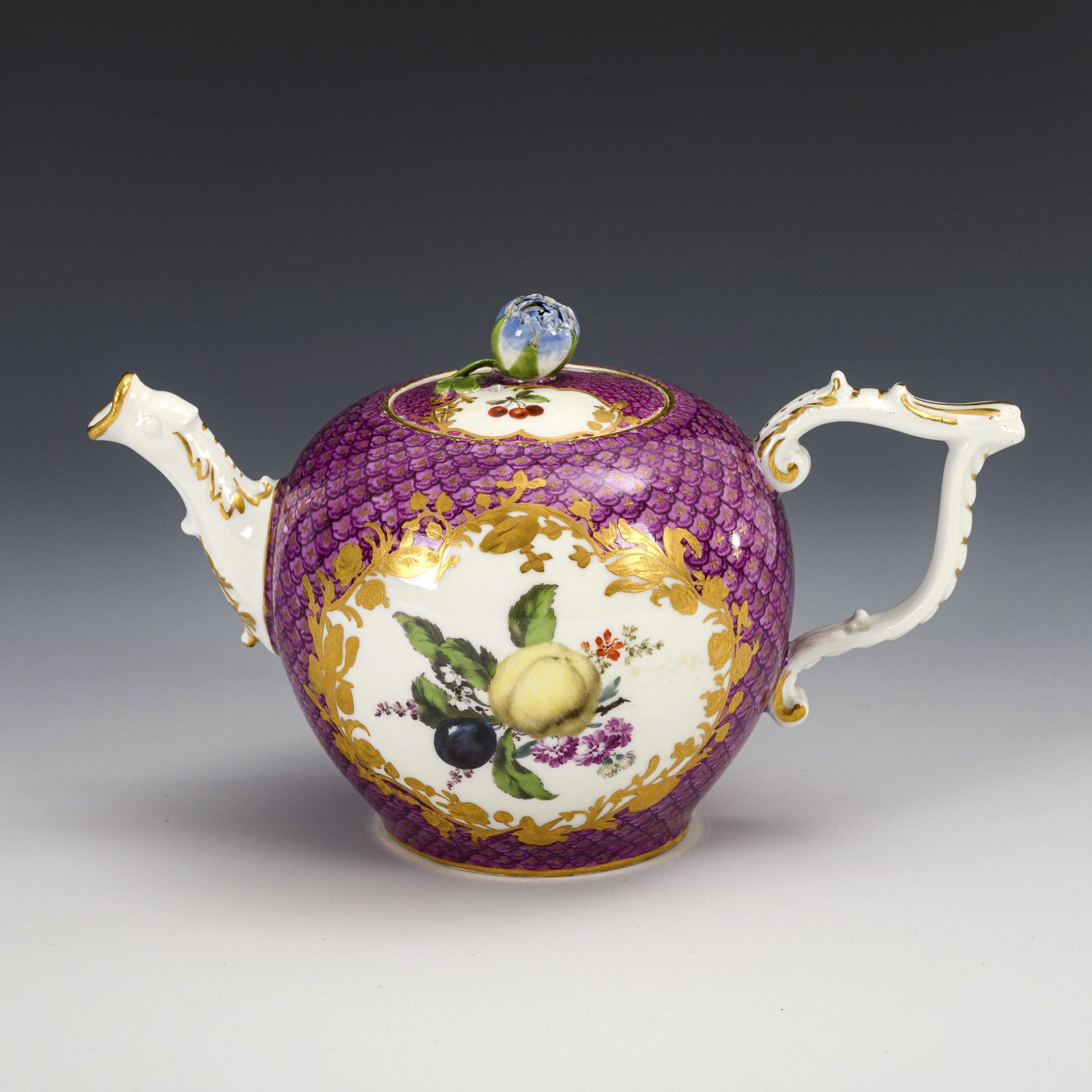 Bauchiges Kännchen mit Rocaillehenkel, Tierkopftülle und Rosenknaufdeckel. Purpurfarbener Schuppenfond, beidseitig eine floral goldgerahmte Kartusche mit kleinen Fruchtbuketts. Kleine, herstellungsbedingte Bestoßung am Stand, Bestoßung am inneren Deckelrand, Rosenknauf minimal bestoßen.
