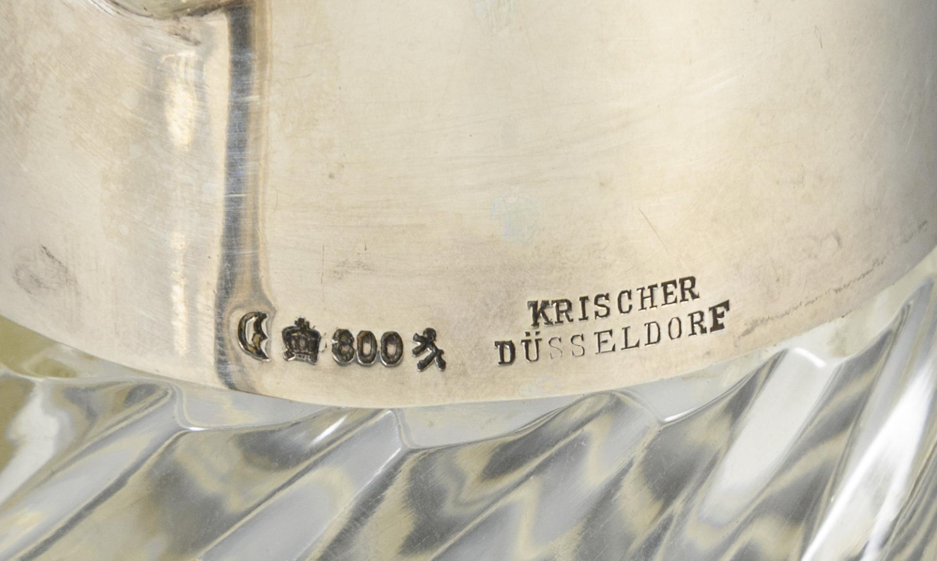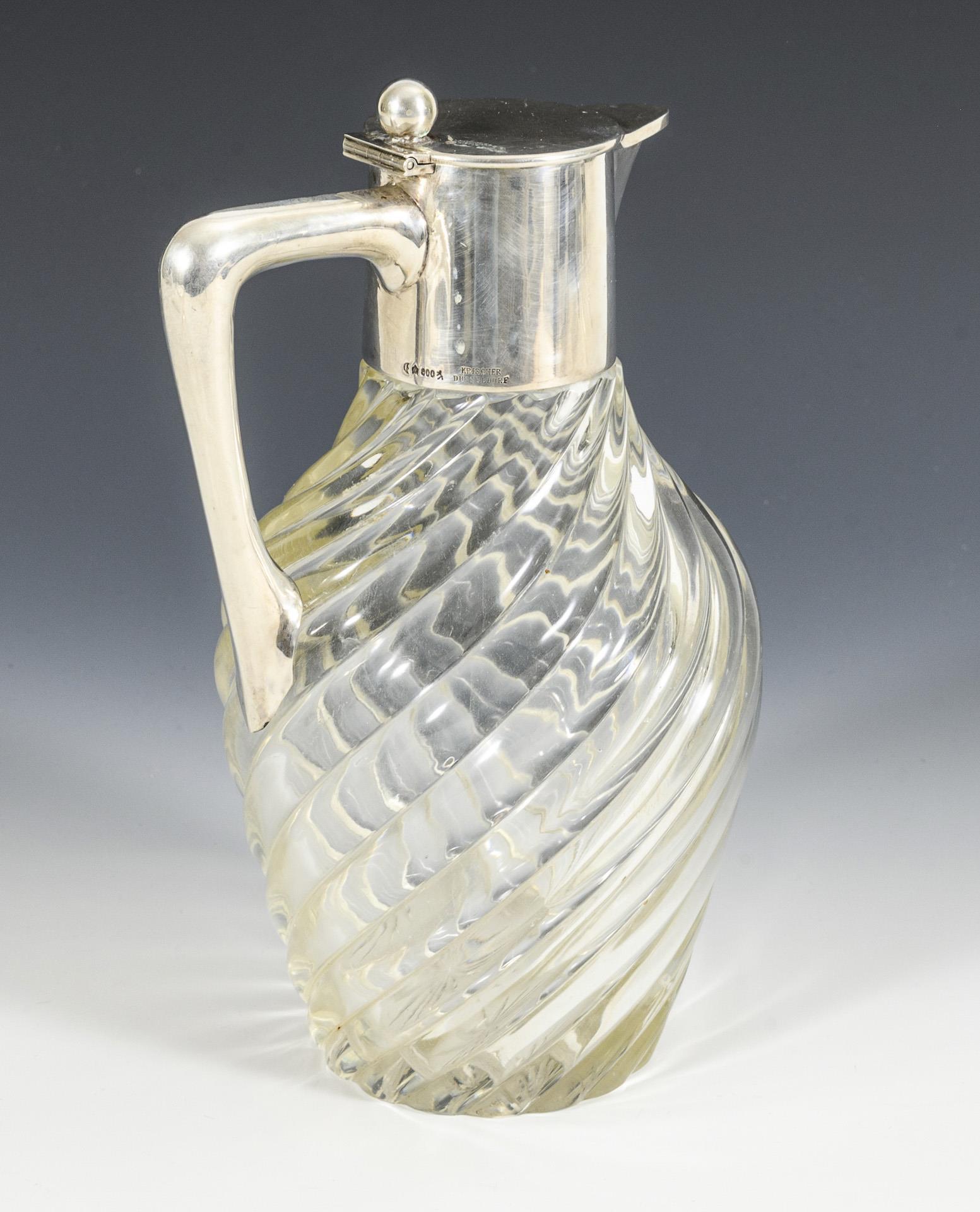 Karaffe mit spiralförmig gedrehter Wandung und flachem Scharnierdeckel (Feingehalt 800, mit Juwelierstempel Krischer, Düsseldorf), H 22,5 cm. / Runde Schale mit schmalem Silberrand (Feingehalt 925), H 9 cm, Ø 18,5 cm. Gebrauchsspuren, Kratzer.