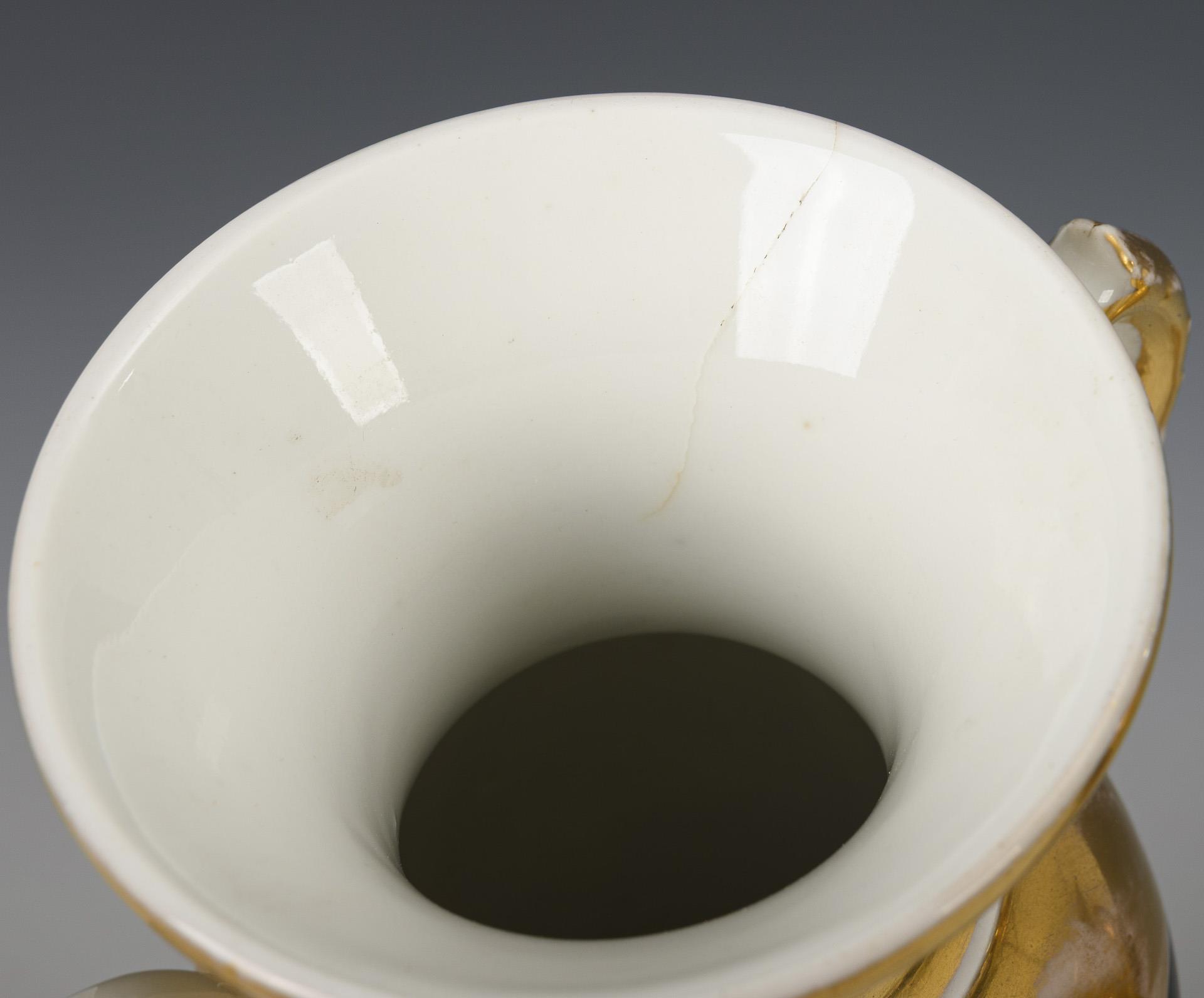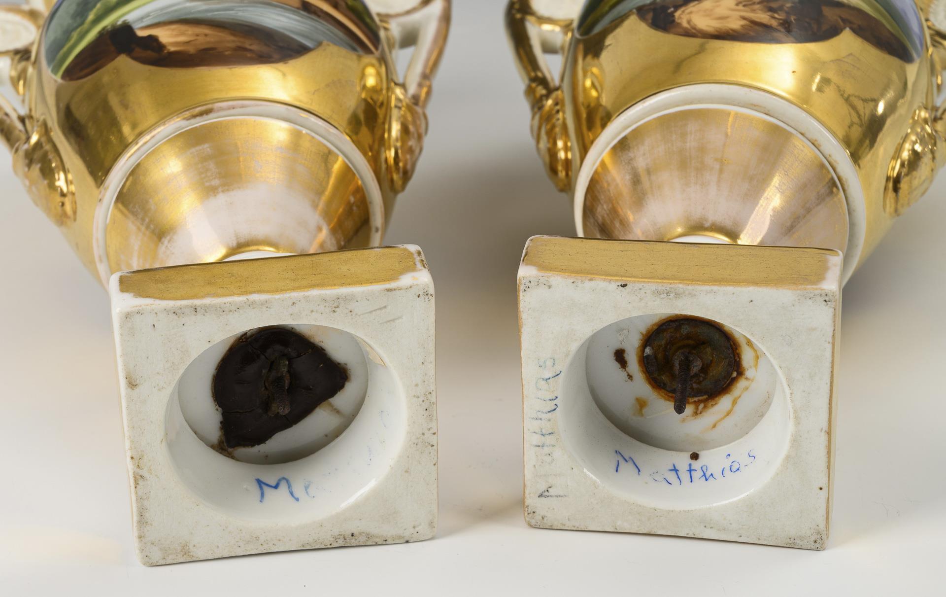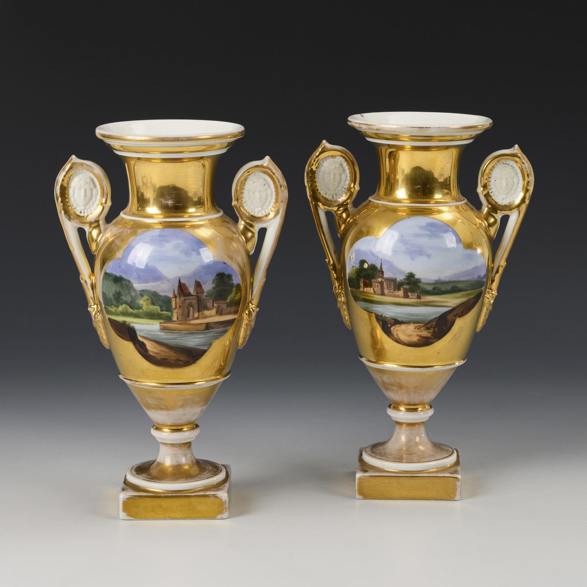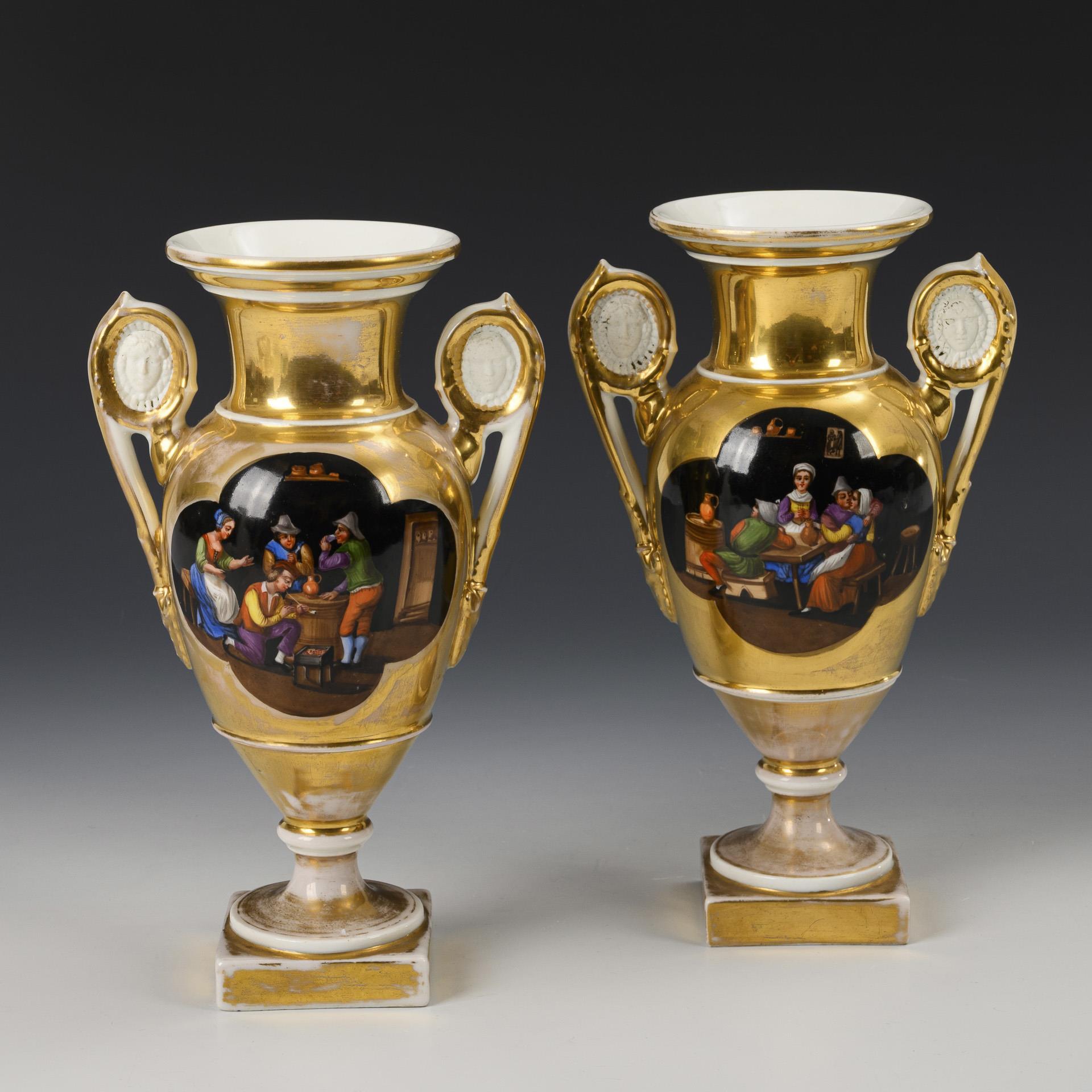 Ovoider Korpus mit zwei Biskuit-Maskaronhenkeln, Kraterhals und Rundfuß, auf Quadratplinthe. Schauseitig eine Vierpasskartusche mit jeweils der Darstellung einer Wirtshausszene, verso die Darstellung einer alpinen Landschaft mit See und Architektur. Gold teils berieben, 1x mit Randhaarriss.