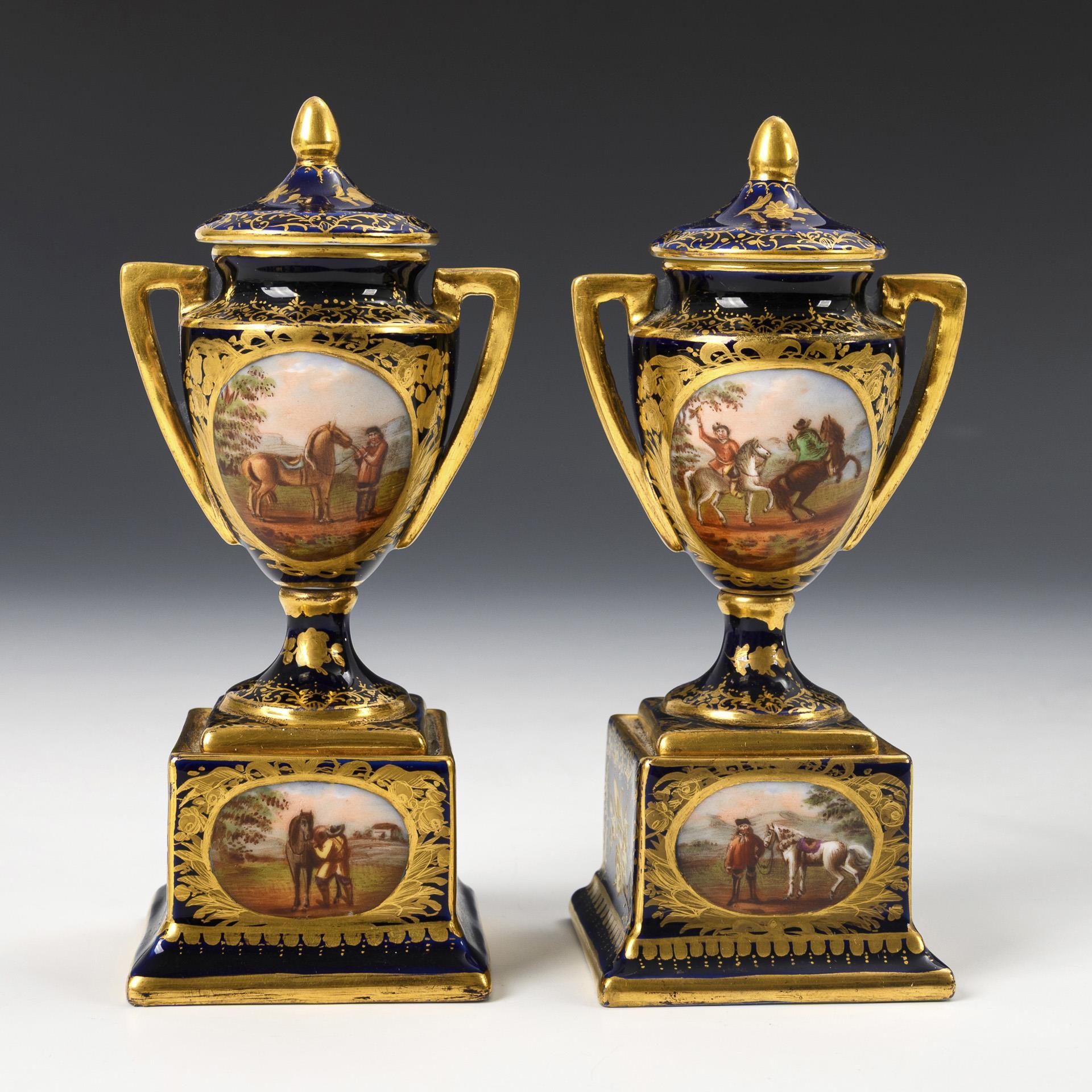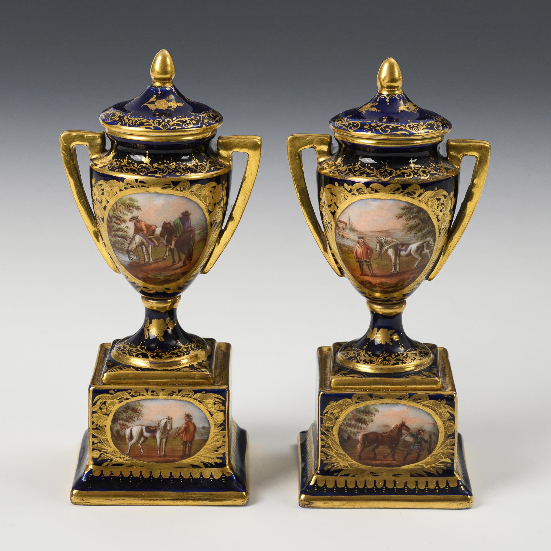 Ovoider Korpus mit zwei gewinkelten Henkeln, Knaufdeckel und Rundfuß, auf Quadratsockel. Im Wiener Stil gestaltet mit kobaltblauem Fond sowie reicher, teils radierter floraler Goldmalerei. Beidseitig auf der Amphore sowie auf dem Sockel ein Medaillon mit Pferdemotiv.