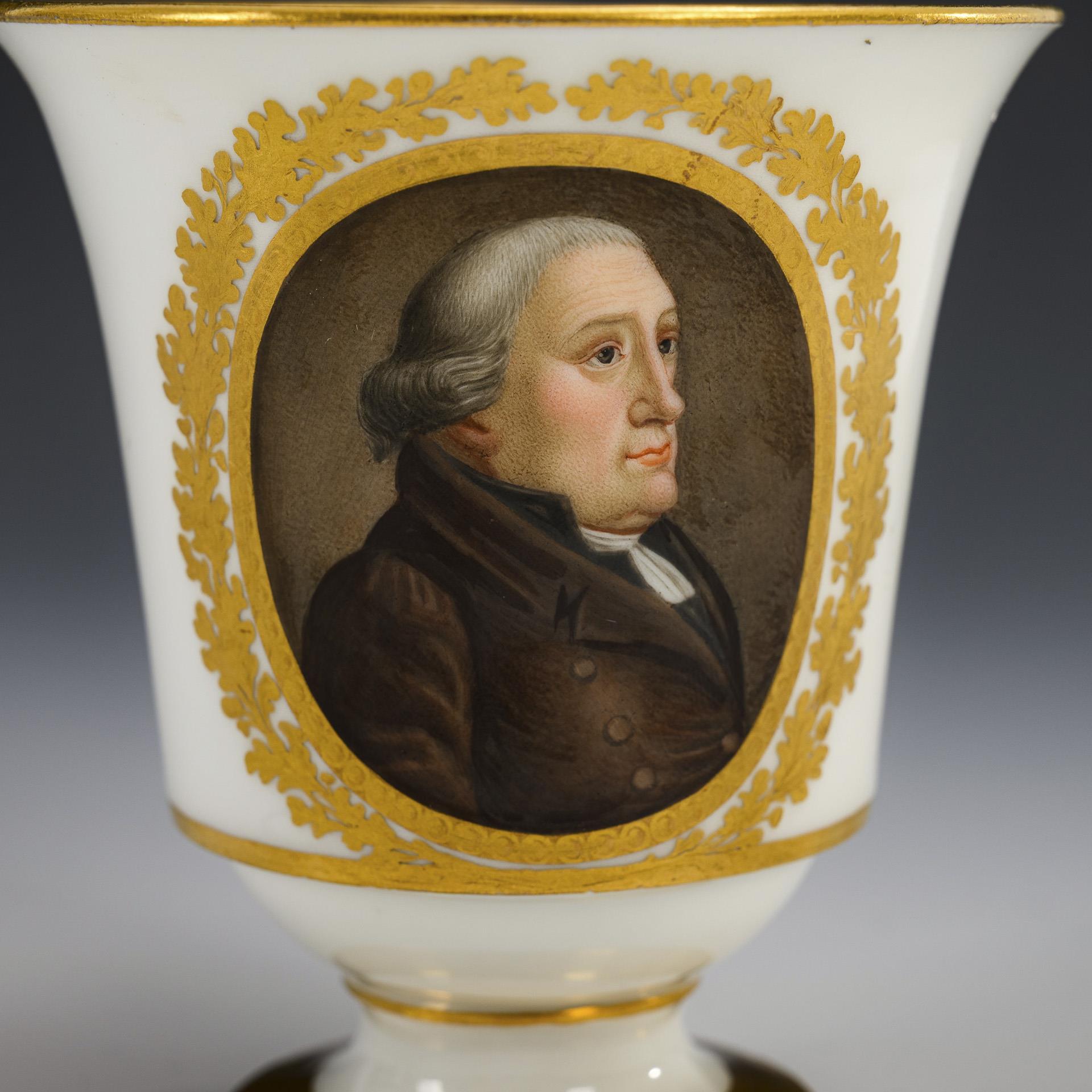 Gefußte Glockentasse mit Palmettenhenkel. Schauseitig ein eichenlaubgerahmtes Medaillon mit dem Bildnis eines älteren Herren, unterseitig bezeichnet "D. V. Ammon".