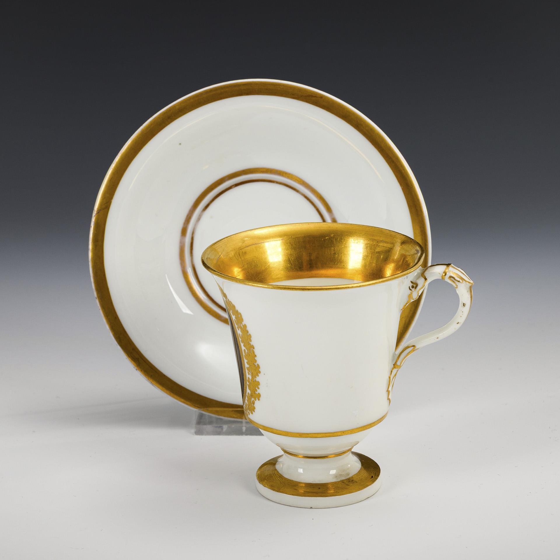 Polychrom bemalt, goldstaffiert. Tasse (H 9 cm), Untertasse (Ø 14 cm). 290 g.