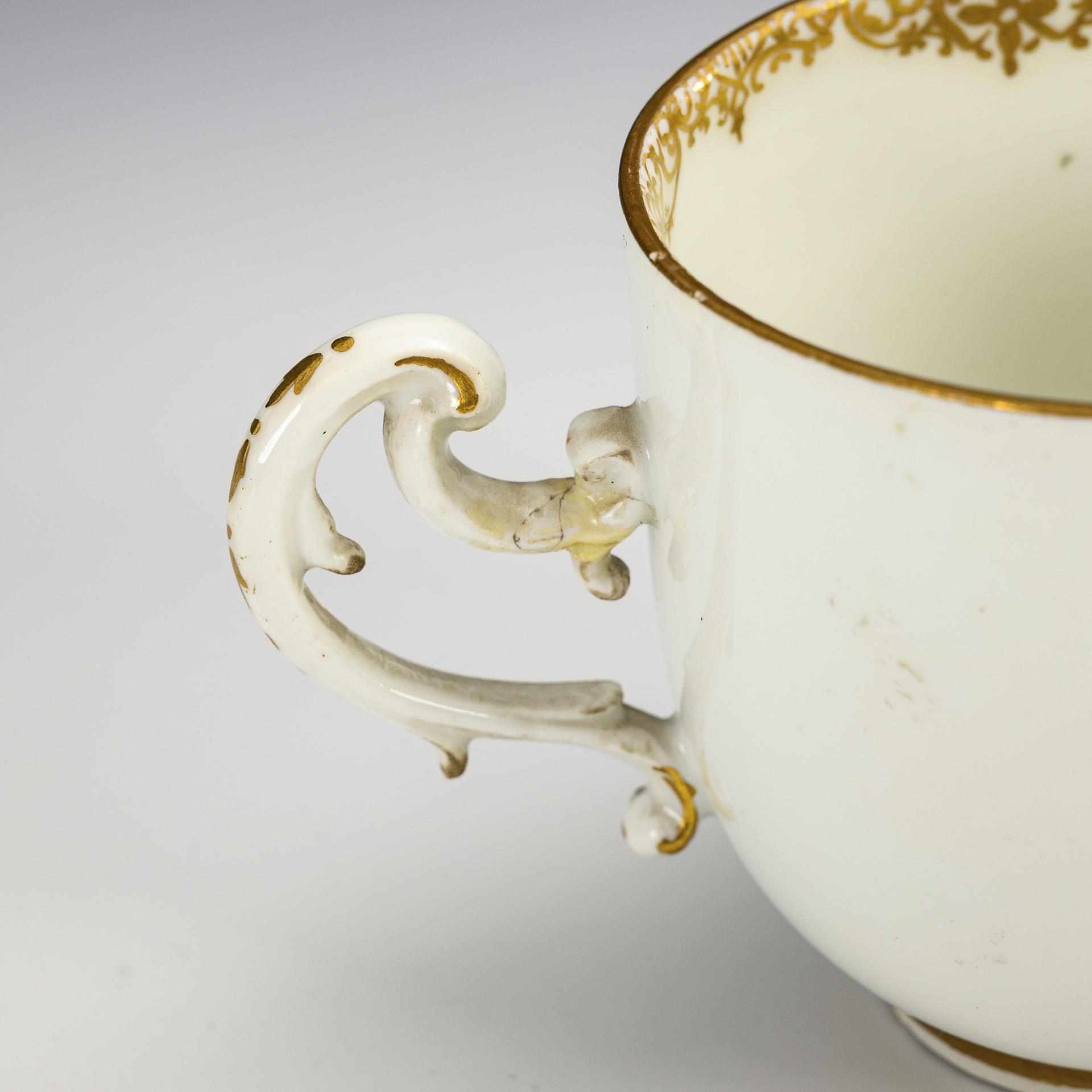 Polychrom bemalt, goldstaffiert. Tasse (H 7 cm), originale Untertasse (Ø 13,5 cm). 280 g.
