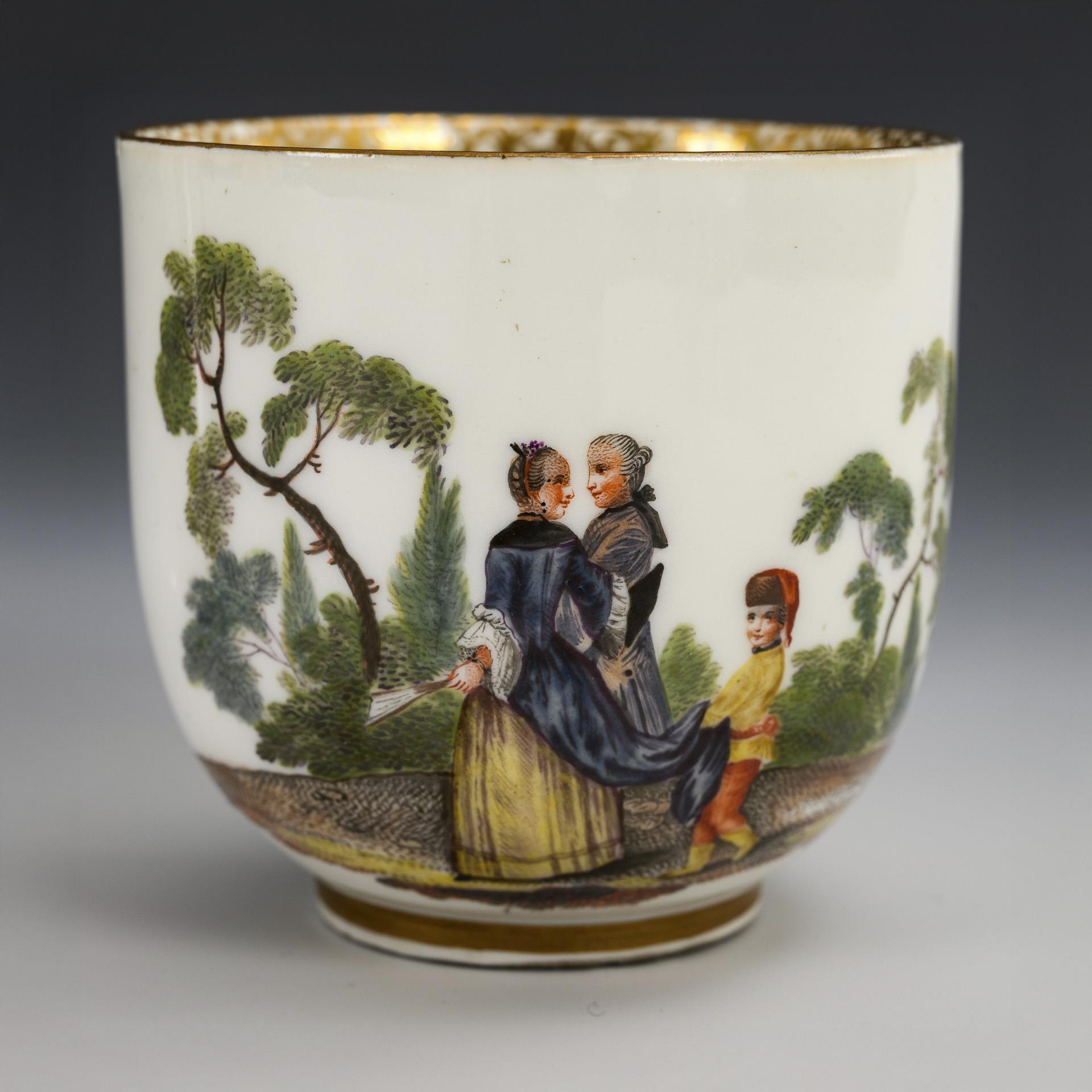 Glockentasse mit Rocaillehenkel. Unter einer Goldspitzenbordüre die Darstellung einer Parklandschaft mit galantem Paar. Oberer Henkelansatz geklebt, farbretuschierte Restaurierung am Mündungsrand.