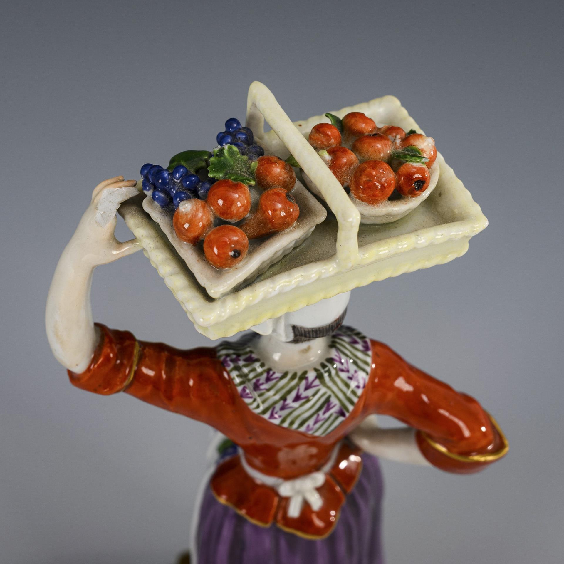 Auf einem Rocaillesockel stehende Händlerin, ein Tablett mit Äpfeln und Trauben auf dem Kopf tragend. Linke Hand bestoßen, minimale Bestoßungen an den Früchten.