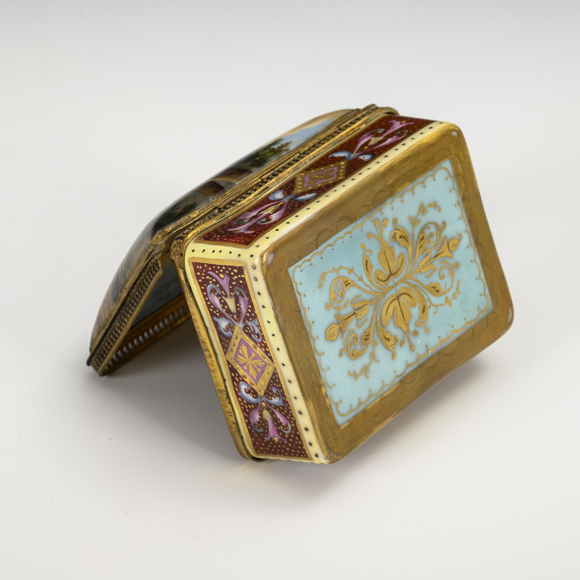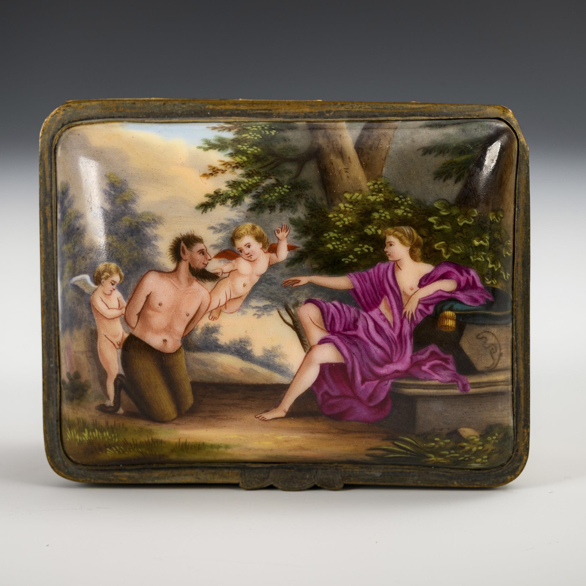 Rechteckige Dose mit metallmontiertem Scharnierdeckel. Auf dem Deckel die Darstellung eines vor Venus knienden, gefesselten Fauns und zweier Amoretten, im Deckel die in einer Landschaft sitzende Allegorie der Musik mit Triangel und Tambourin, allseitig Teilfonds in Bordeaux, Türkis und Hellgelb mit polychrom-goldener Ornamentik und goldenem Punktmuster, innen vergoldet. Korpus restauriert.