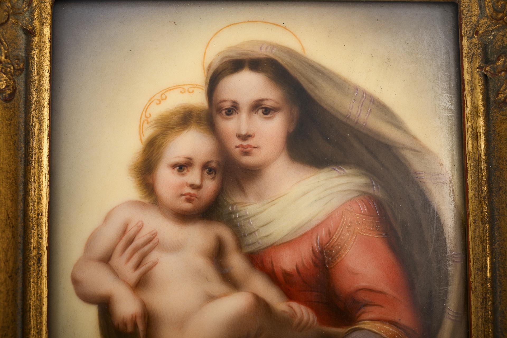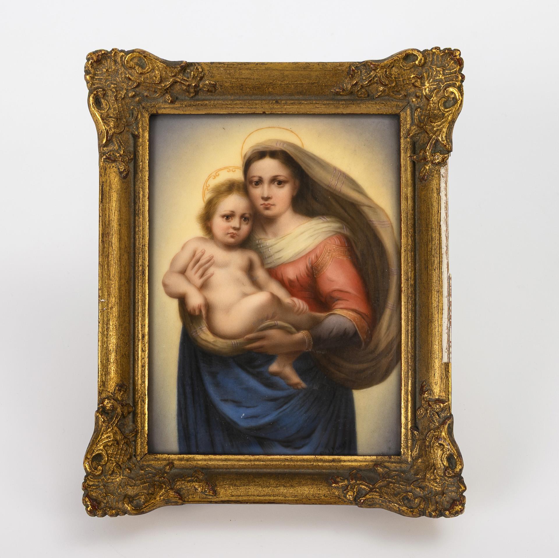 Rechteckige Platte mit der Darstellung der Madonna mit Kind, nach dem berühmten Gemälde von Raffael (1483-1520) . Bestoßung am Rahmen.