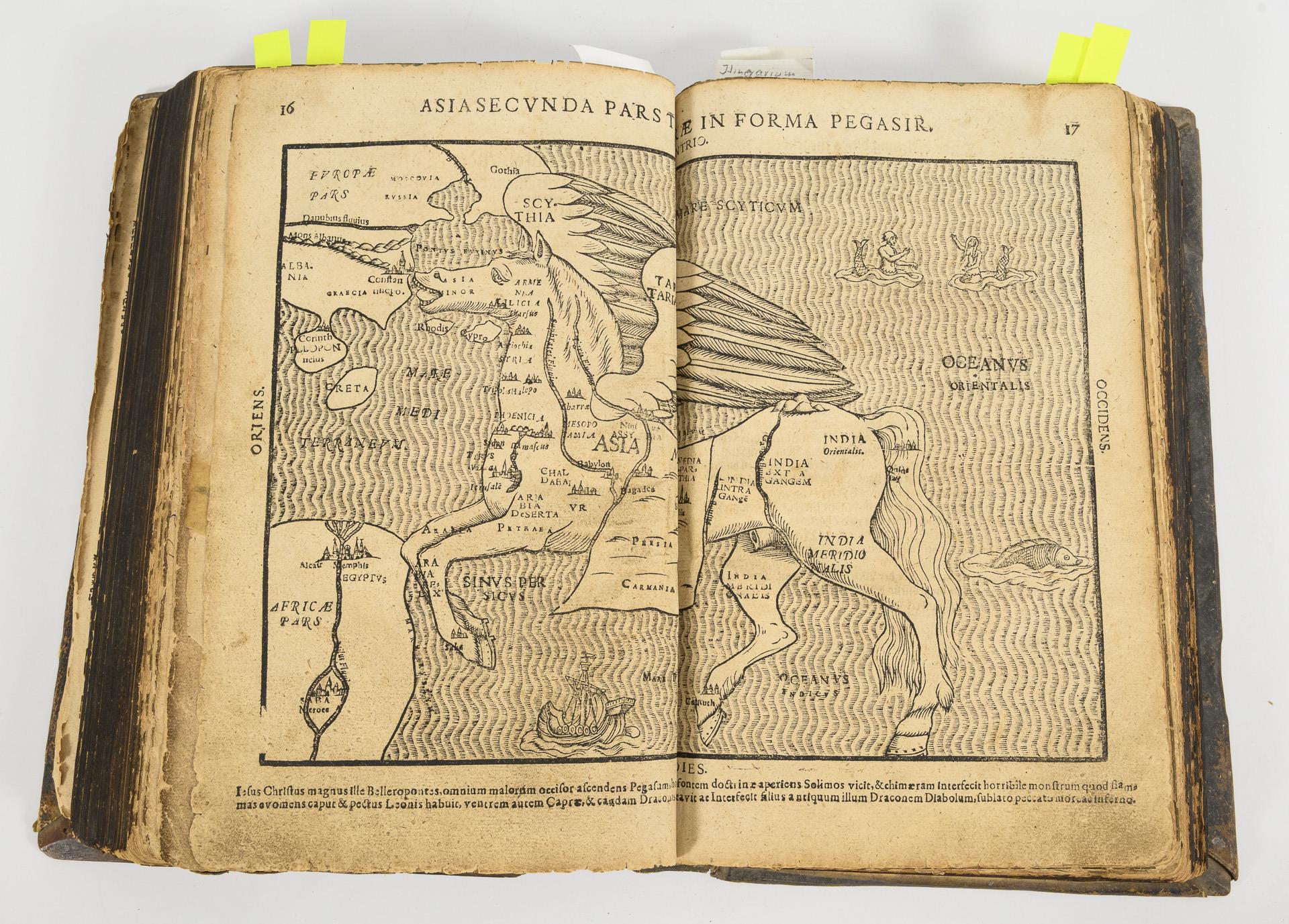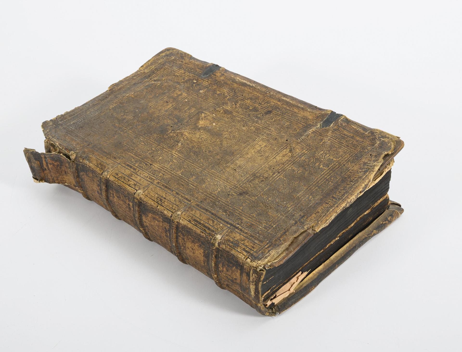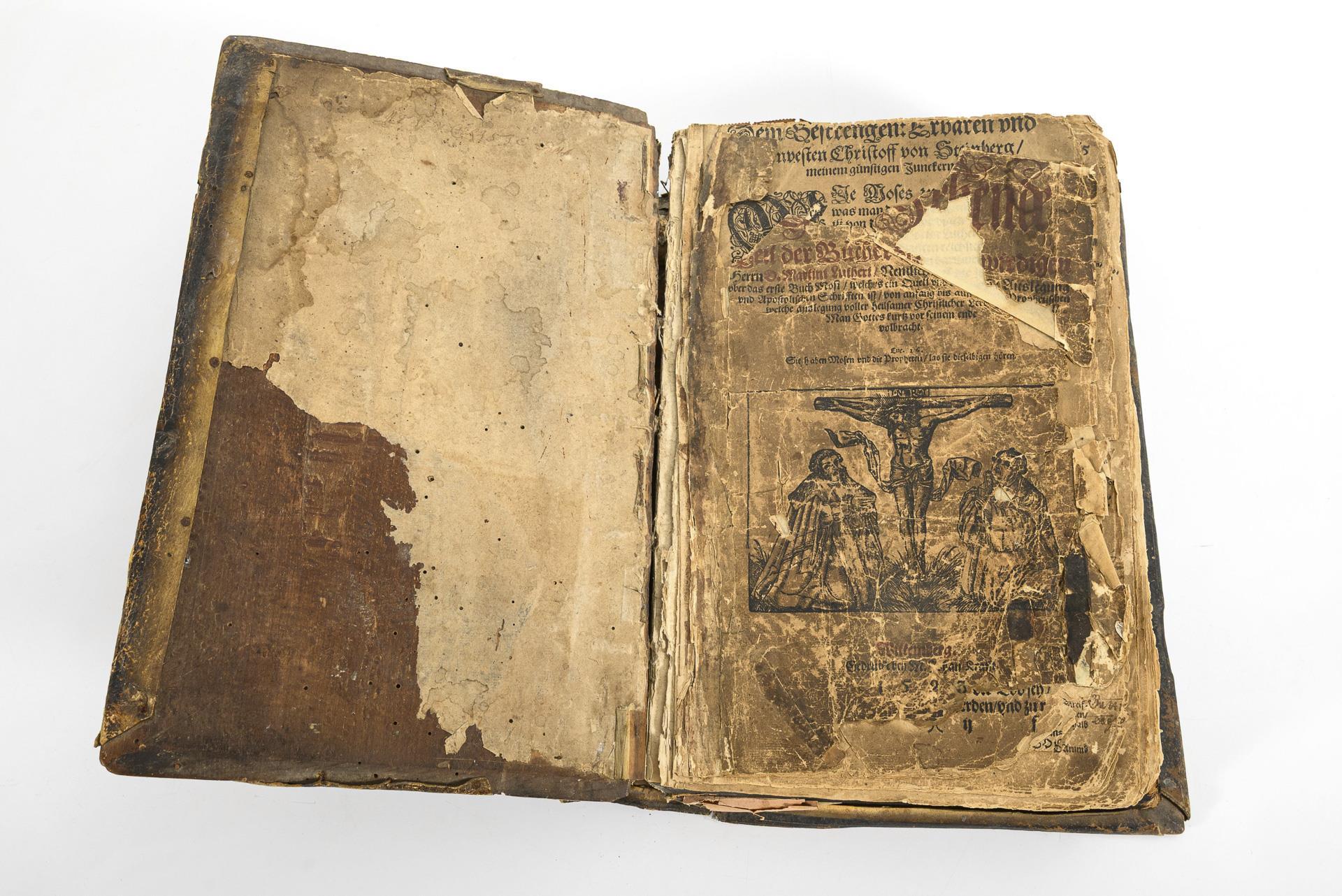 "Der Zehende Teil der Bücher des Ehrwirdigen Herrn D. Martini Lutheri, Nemlich die herrliche Auslegung vber das erste Buch Mosi ... von anfang bis auff das XXV. Capitel welche auslegung voller heilsamer Christlicher Lere der thewre Man Gottes kurtz vor seinem ende volbracht". Wittenberg 1593, Gedruckt bei M. Johann Krafft. Titelblatt lose und defekt, (4), 600 Seiten. Bis Seite 25 Blätter lose, fehlende Ecken und teils Nachgedunkelt, aber kein Textverlust. Ansonsten Block fest. Vergleiche VD16 L 3403. Dieser Teil nicht kollationiert. // Heinricum Bünting: "Itinerarium Sacrae Scripturae. Das ist: Ein Reisebuch, Uber die gantze Heilige Schrifft, In zwey Bücher getheilet : Der Erste Theil begreifft alle Reisen der lieben Patriarchen, Richter, Könige, Propheten, Fürsten, etc. Nach Deutschen Meilen außgerechnet, und die Ländere, Städte, Wasser, Berg und Thal, deren in Heiliger Schrifft gedacht wird ... "Zu Magdeburg, 1608, Bey Ambrosio Kirchnern. Titelblatt, (14), 240 Seiten inklusive 6 Karten und einer Abbildung, (7) Seiten. Seite 226, 227 fehlt. Vergleiche VD17 3:313519G // "Itinerarium Novi Testamenti. Daß ist: Ein Reisebuch, Uber das Newe Testament. Ander Theil. Darinnen werden begriffen, die Reisen der Heiligen Jungfrawen Maria, Josephs, der Weisen auß Morgenlandt, deß Herrn Jesu Christi, und der lieben Apostel." Gedruckt zu Magdeburg 1608, In Verlegung Ambrosii Kirchners. Titelblatt 102 Seiten inklusive 2 Landkarten, (7) Seiten. Wenig Textverlust (ca. 4 cm) auf den ersten Seiten durch Fraß. Vergleiche VD17 3:313521C // "Heinricum Bünting: "Uber das Buch Josua, ein sehr nütze und schöne Erklerung, und der Außtheilung des gelobten Landes Canaan, wie es unter die zwölff Stemme Israel aushetheilet ist worden." Gedruckt zu Magdeburg 1608. Titelblatt mit Holzschnitt, 34 Seiten. // Henrichum Bünting: "De Monetis et Mensuris Sacrae Scripturae" Das ist: Eine eygentliche Ausrechnung und Beschreibung aller Müntzen und Masse in Heiliger Schrifft ...", Gedruckt zu Magdeburg 1608. Titelblatt, (5), 10 Seiten. (Seite 11 -28 fehlt). // Im geprägten Ledereinband, Schließen fehlen, Rücken eingerissen. Alle Karten der seltenen Ausgabe vorhanden, teils nur wenig beschädigt. Darunter Weltkarte in Kleeblattform; Weltkarte mit "America Die Newe Welt", links unterhalb Afrikas; Europa als Jungfrau (etwas beschädigt und hinterklebt, sowie Druckfalte); Asien als Pegasus und andere. Gelegentlich Anmerkungen und Unterstreichungen.