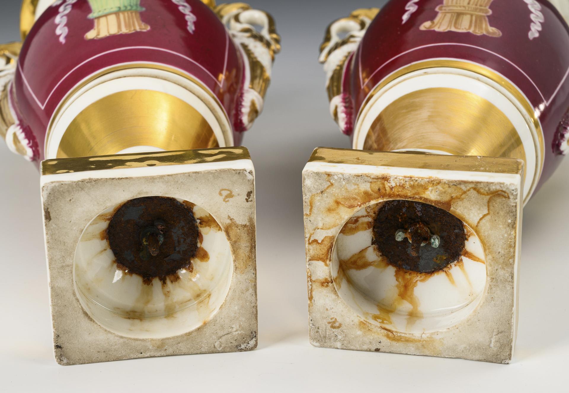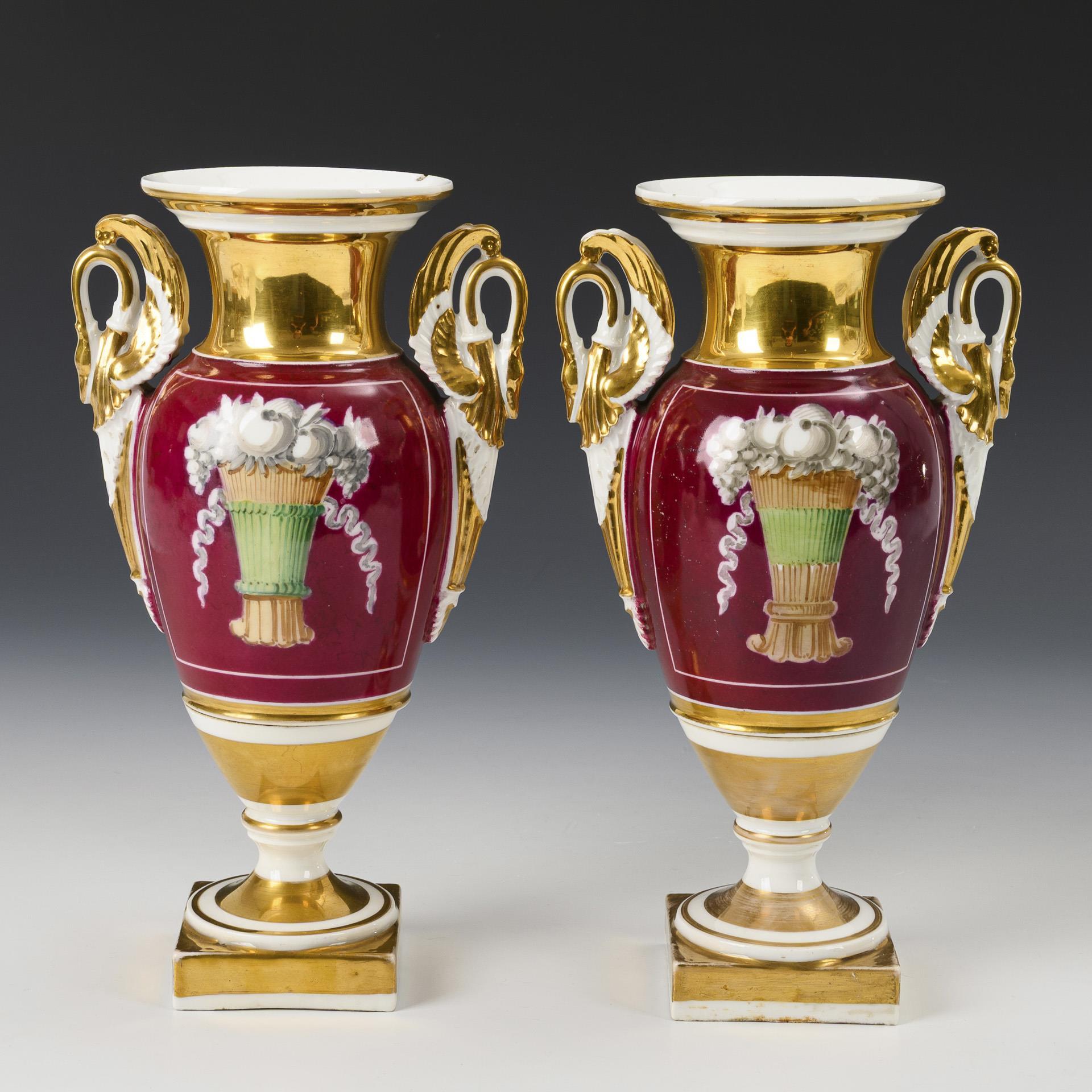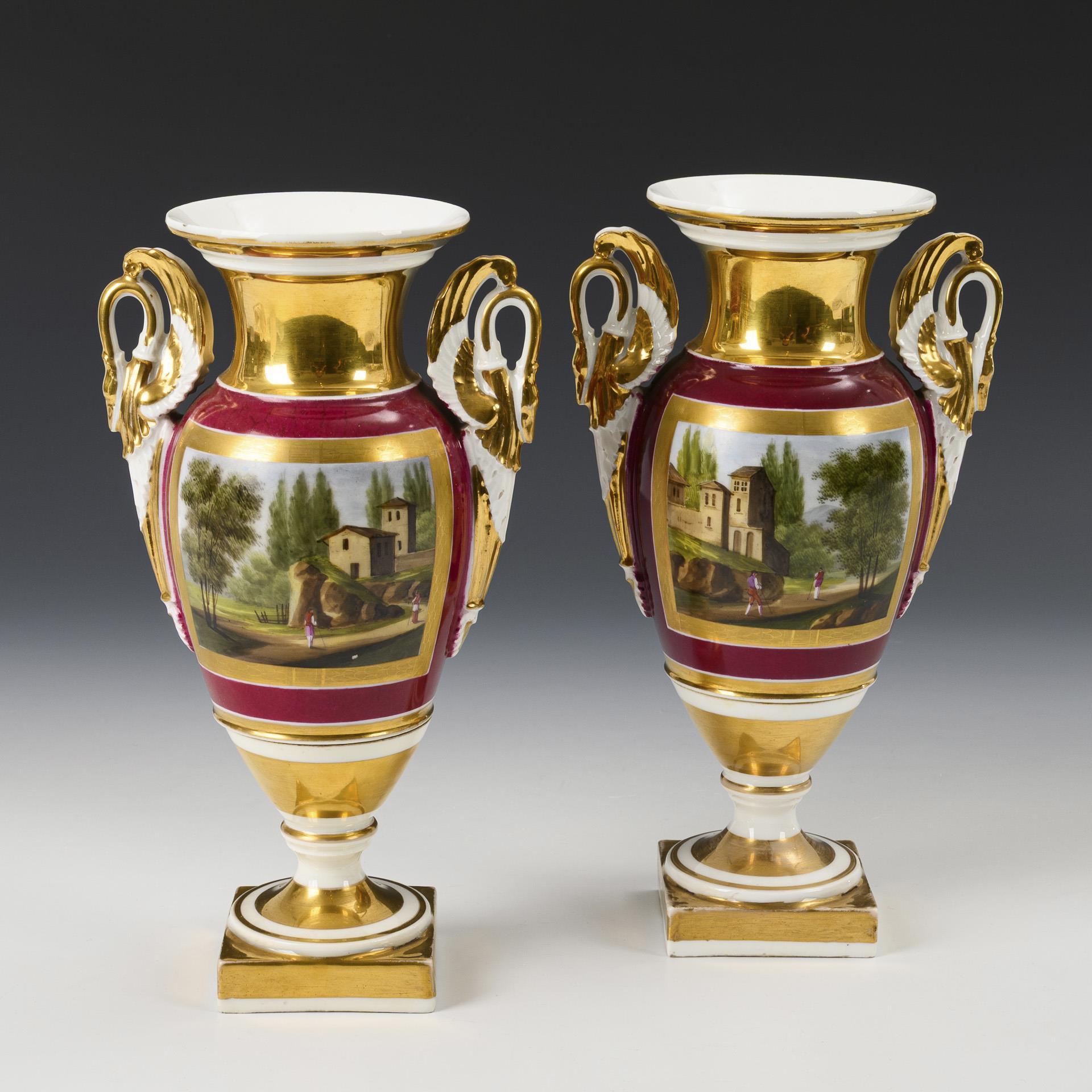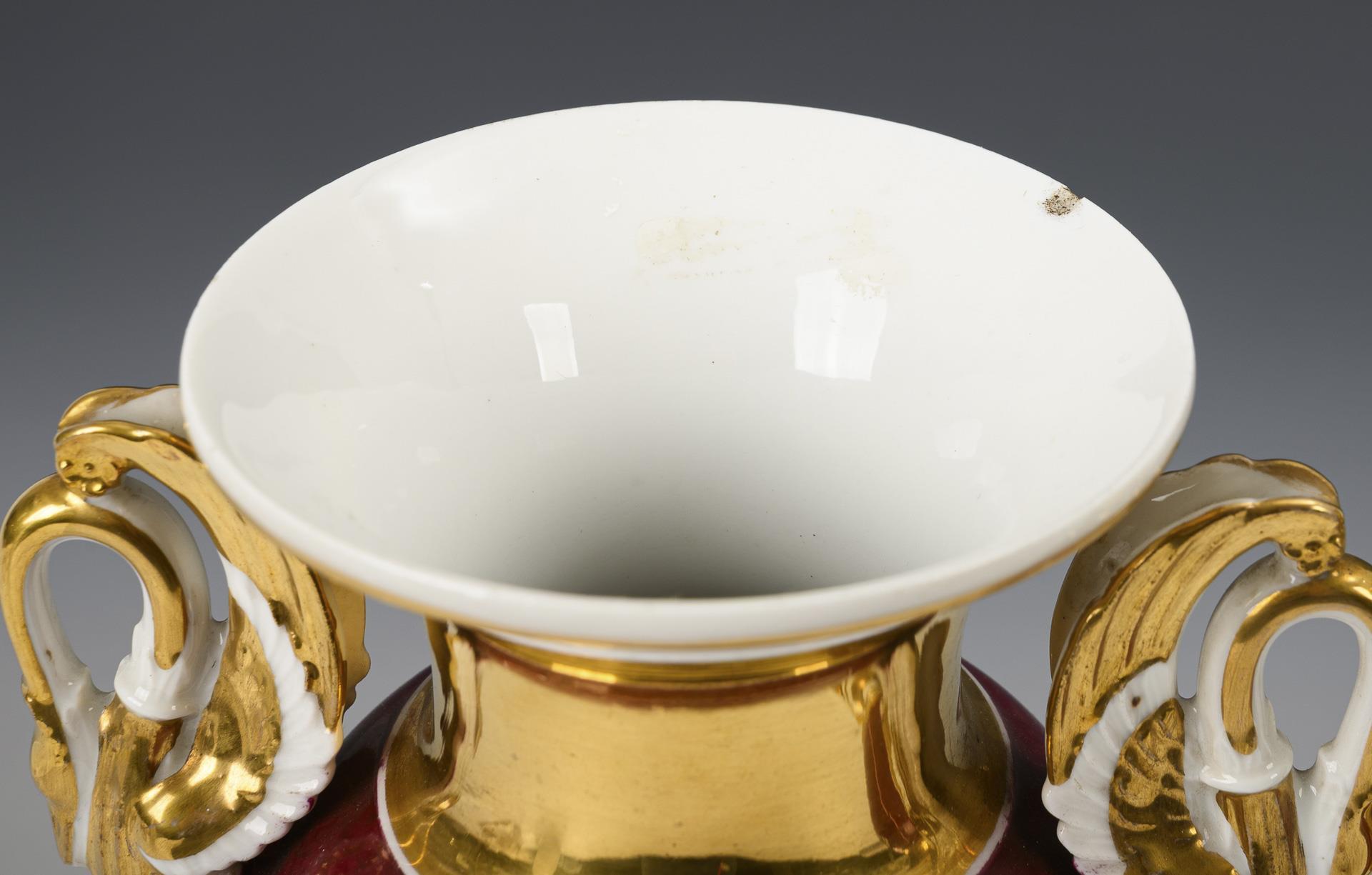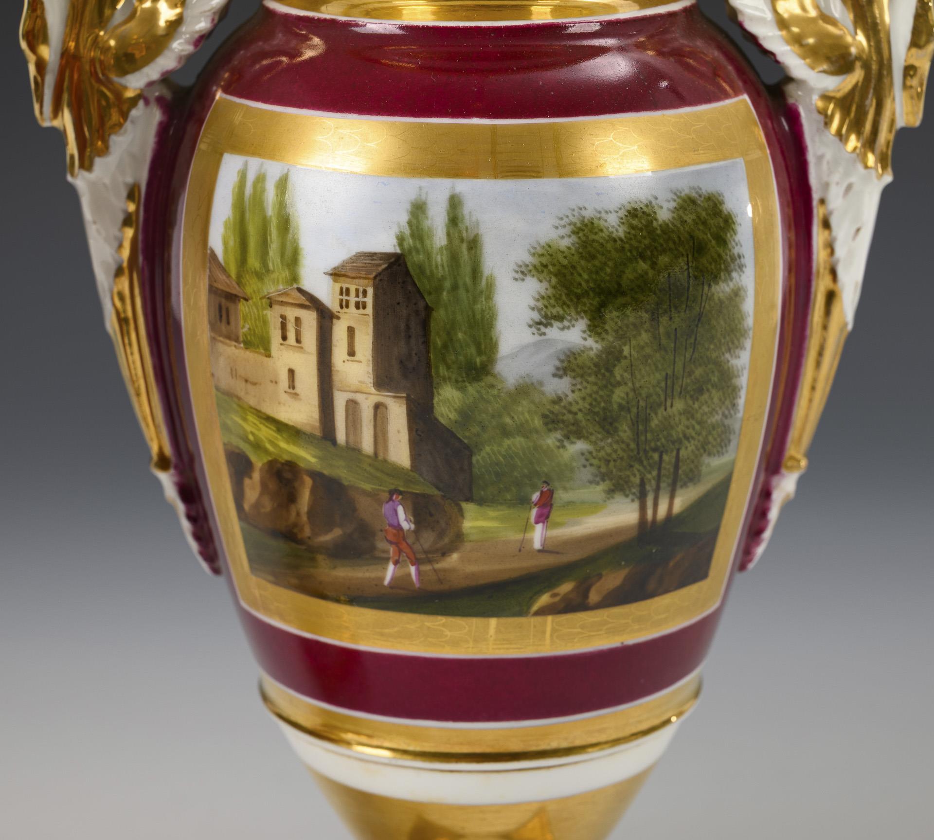 Ovoider Korpus mit zwei Schwanenhenkeln, Kraterhals und Rundfuß, auf Quadratplinthe. Bordeauxfarbener Fond, schauseitig jeweils eine goldgerahmte Rechteckkartusche mit der Darstellung eine Landschaft mit Architektur und Personenstaffage, reich goldstaffiert. Minimaler Goldabrieb.