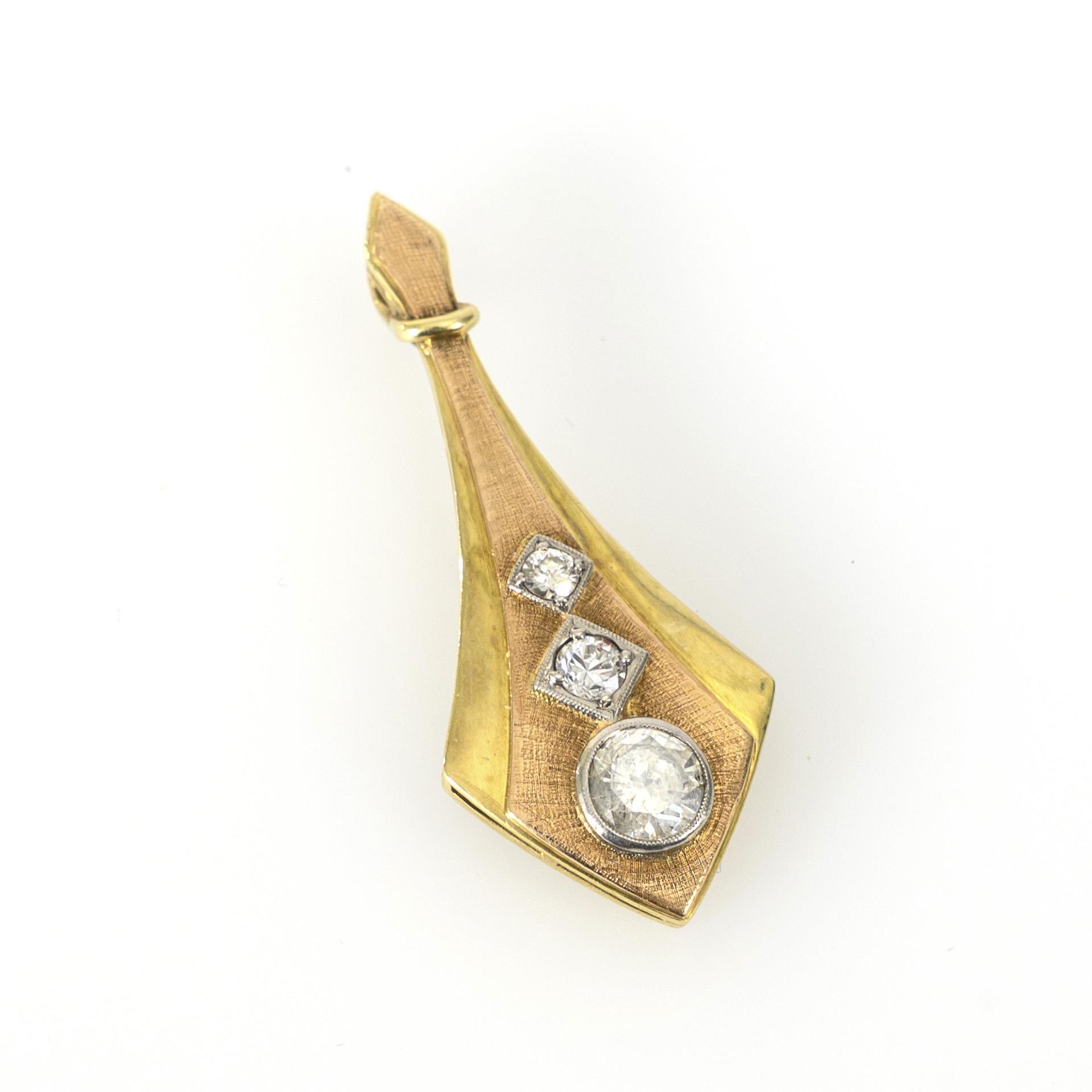 Mehrfarbiger Anhänger mit drei Brillanten. Leichte Tragespuren; der größte Brillant mit einem kleinen randseitigen Chip.