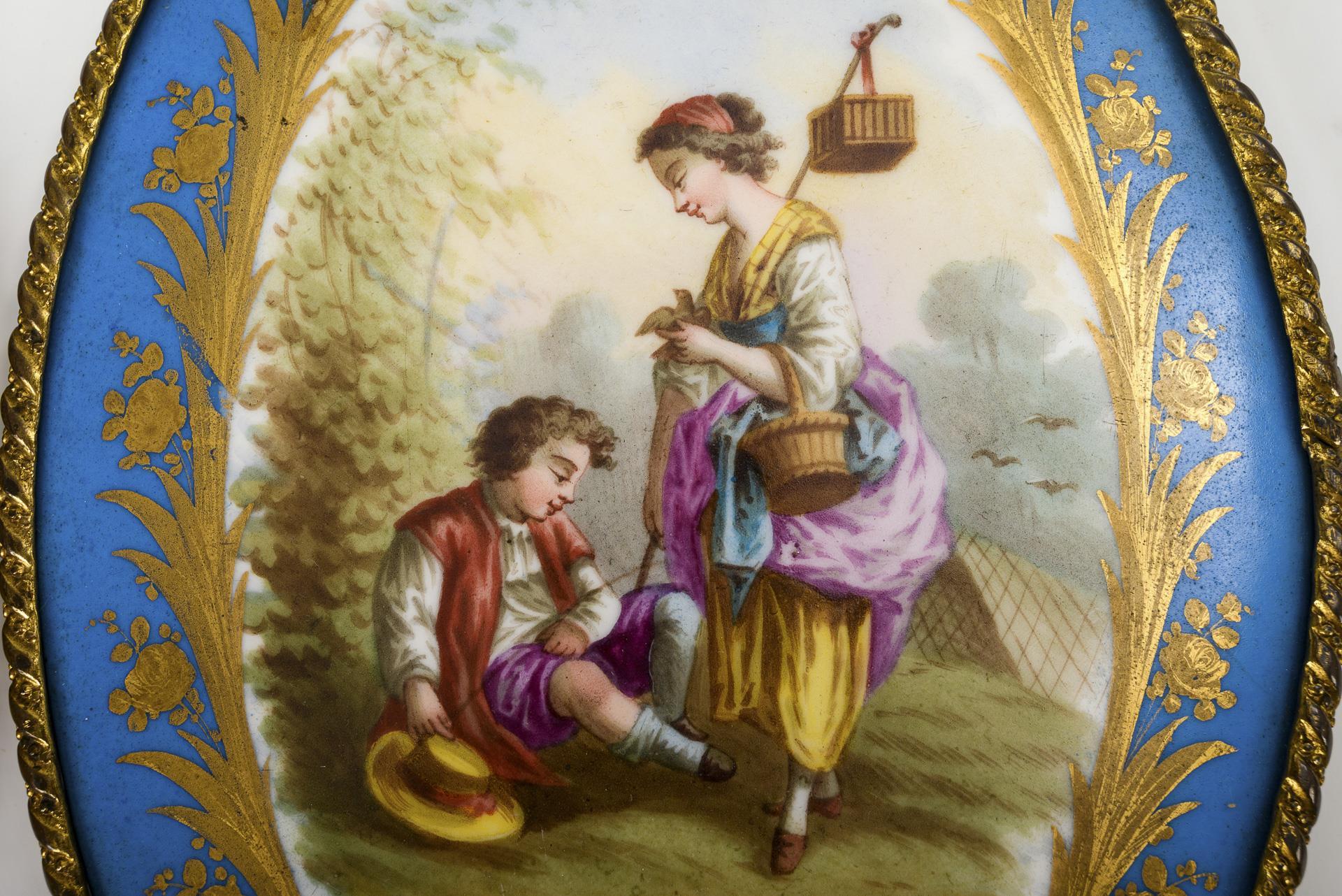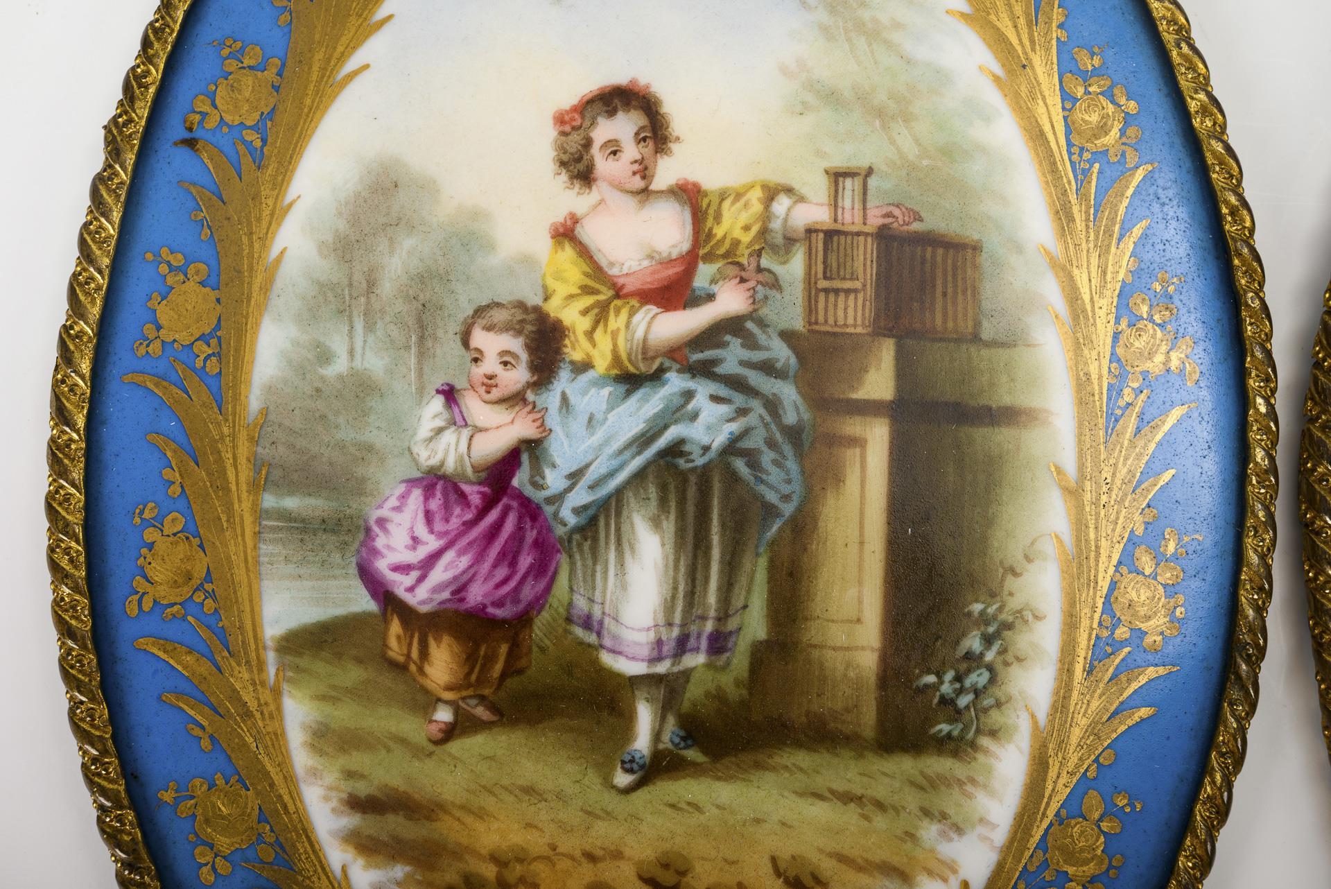Ovale Platten mit blauem Teilfond, in einem floral goldgerahmten und -radierten Medaillon die Darstellung zweier Mädchen mit Vogelbauer bzw. eines Kinderpaares mit Vogel.
