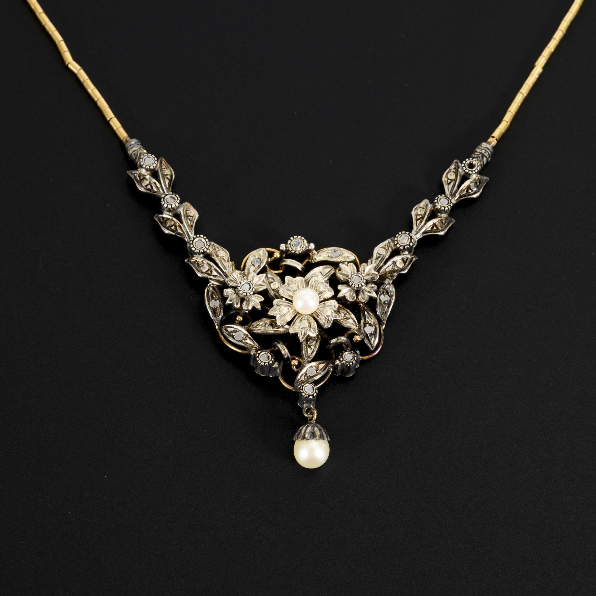 Historisches oder historisierend gearbeitetes Mittelstück eines in Silber gehaltenen, in floraler Formsprache gestalteten Colliers mit Diamantsplittern und zwei Perlen an einer in jüngerer Zeit ergänzten Gelbgold-Kette, das Schloss mit Achterhaken zur Sicherung. 2 Diamantsplitter fehlen.