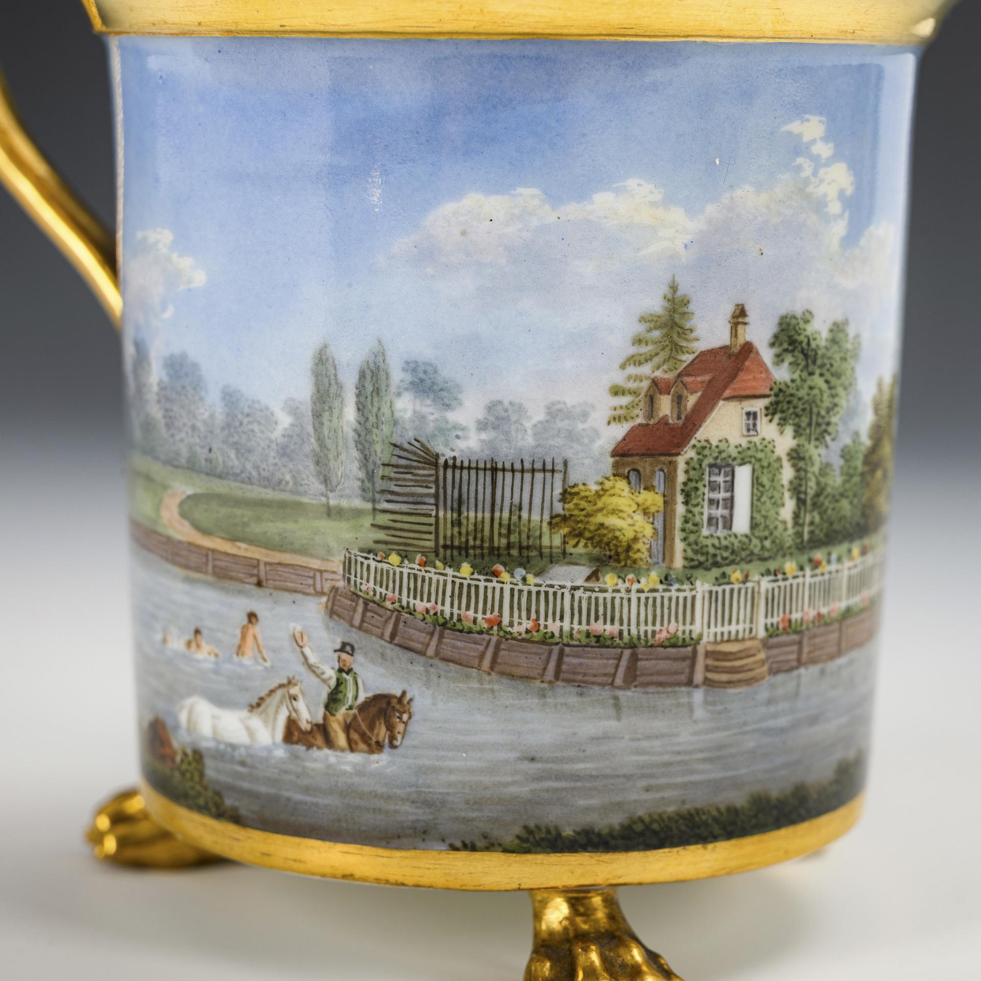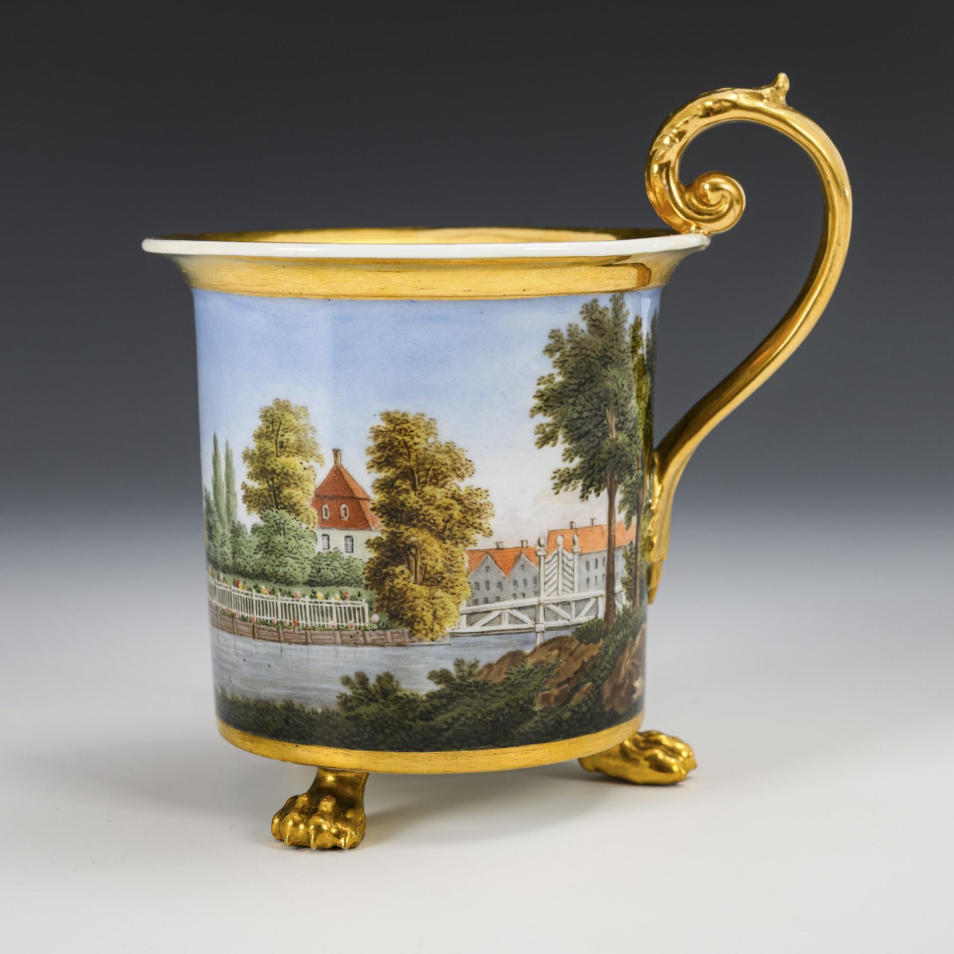 Kratertasse mit Blatthenkel und drei Tatzenfüßen. Umlaufend die fein gemalte Darstellung von am Wasser gelegenen Gebäuden mit badenden Menschen sowie einem mit zwei Pferden badendem Mann.