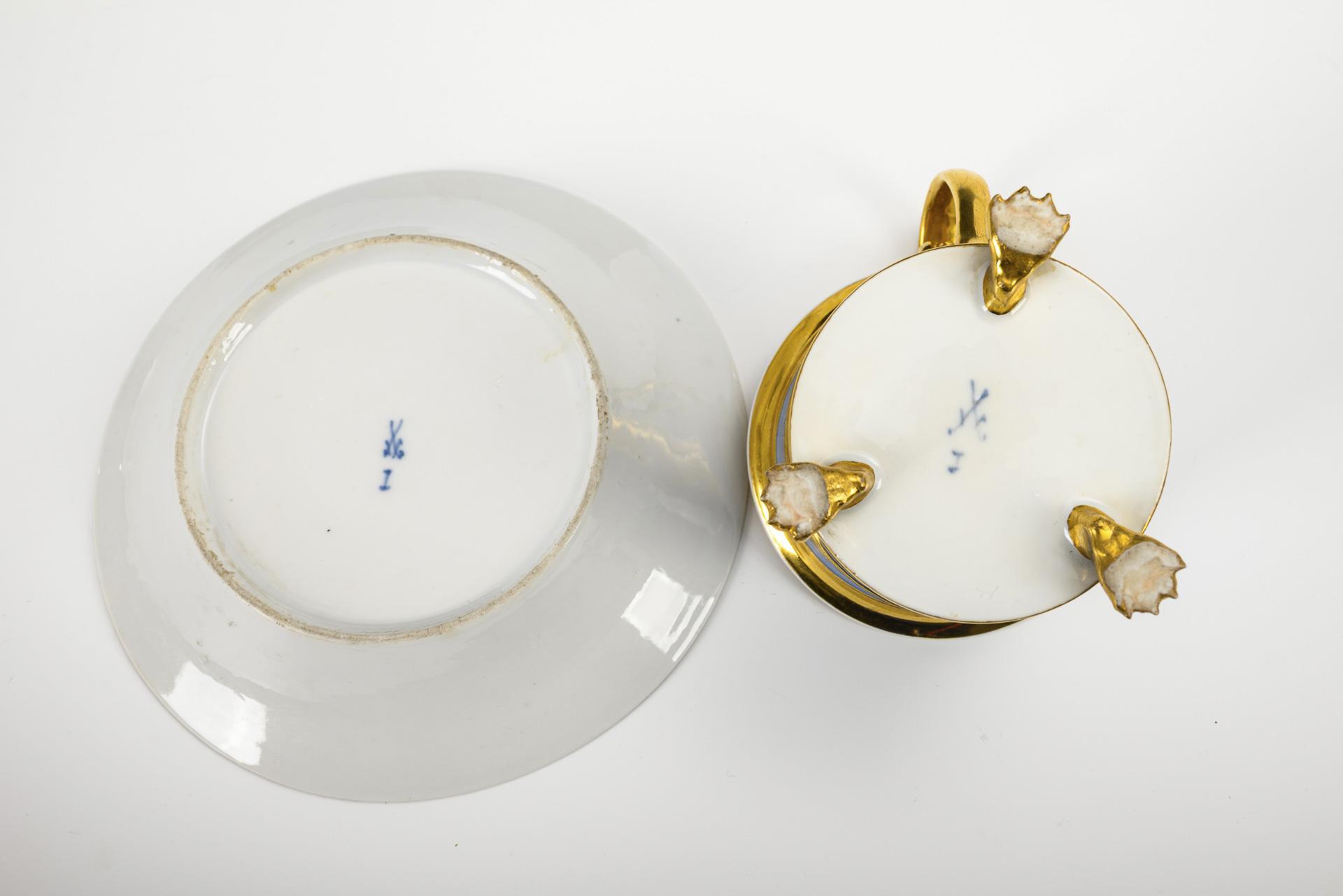 Polychrom bemalt, goldstaffiert. Tasse (H 11,5 cm), originale Untertasse (Ø 15,5 cm). 370 g.