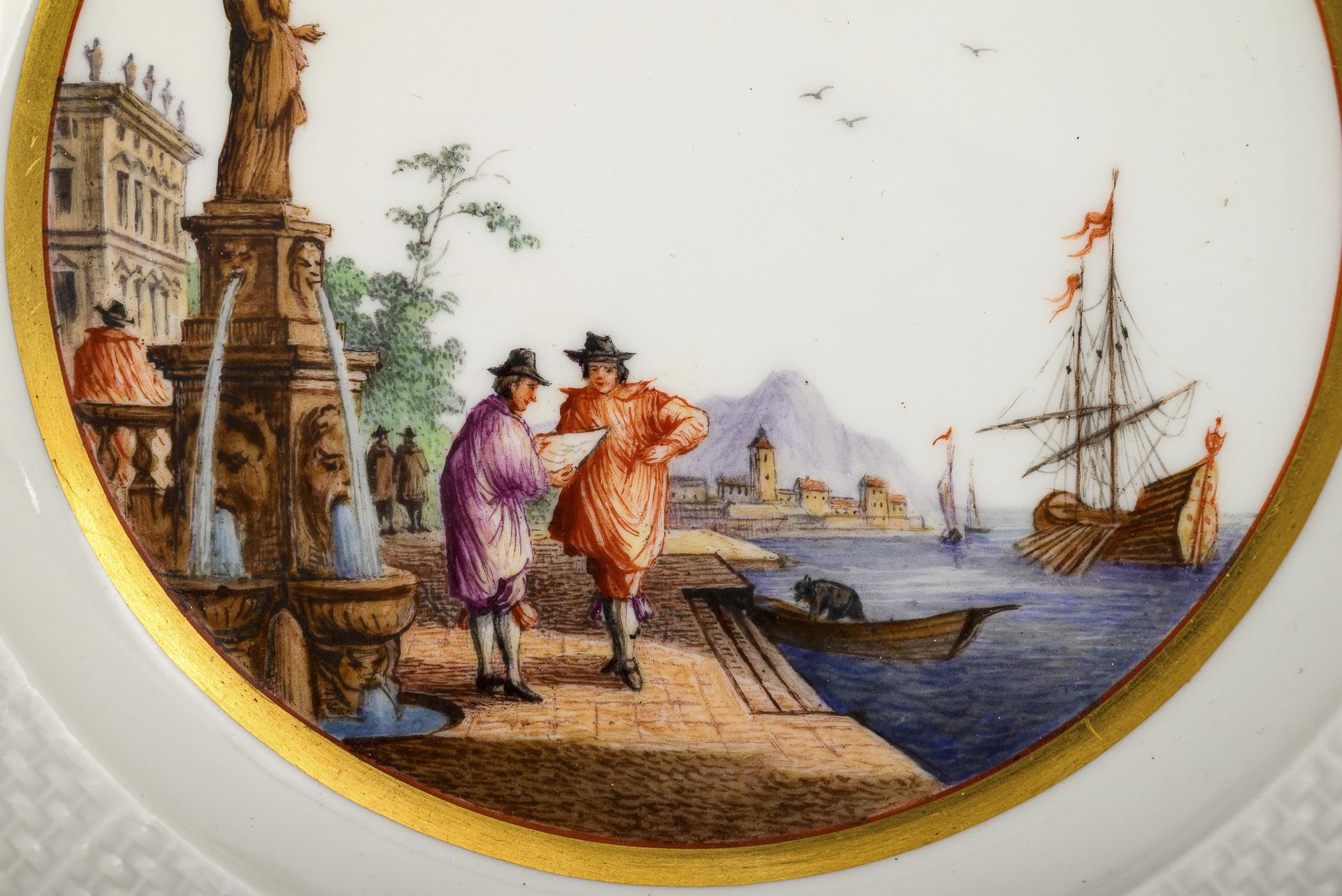 Form "Altozier". Kleiner Teller mit der Darstellung einer Hafenszene mit Segelschiffen, Kaufleuten und Architektur.