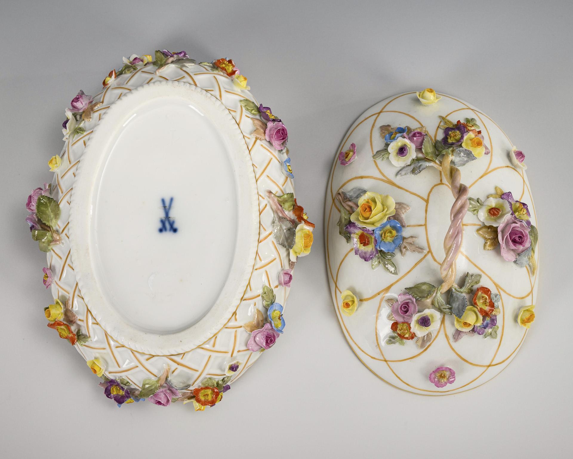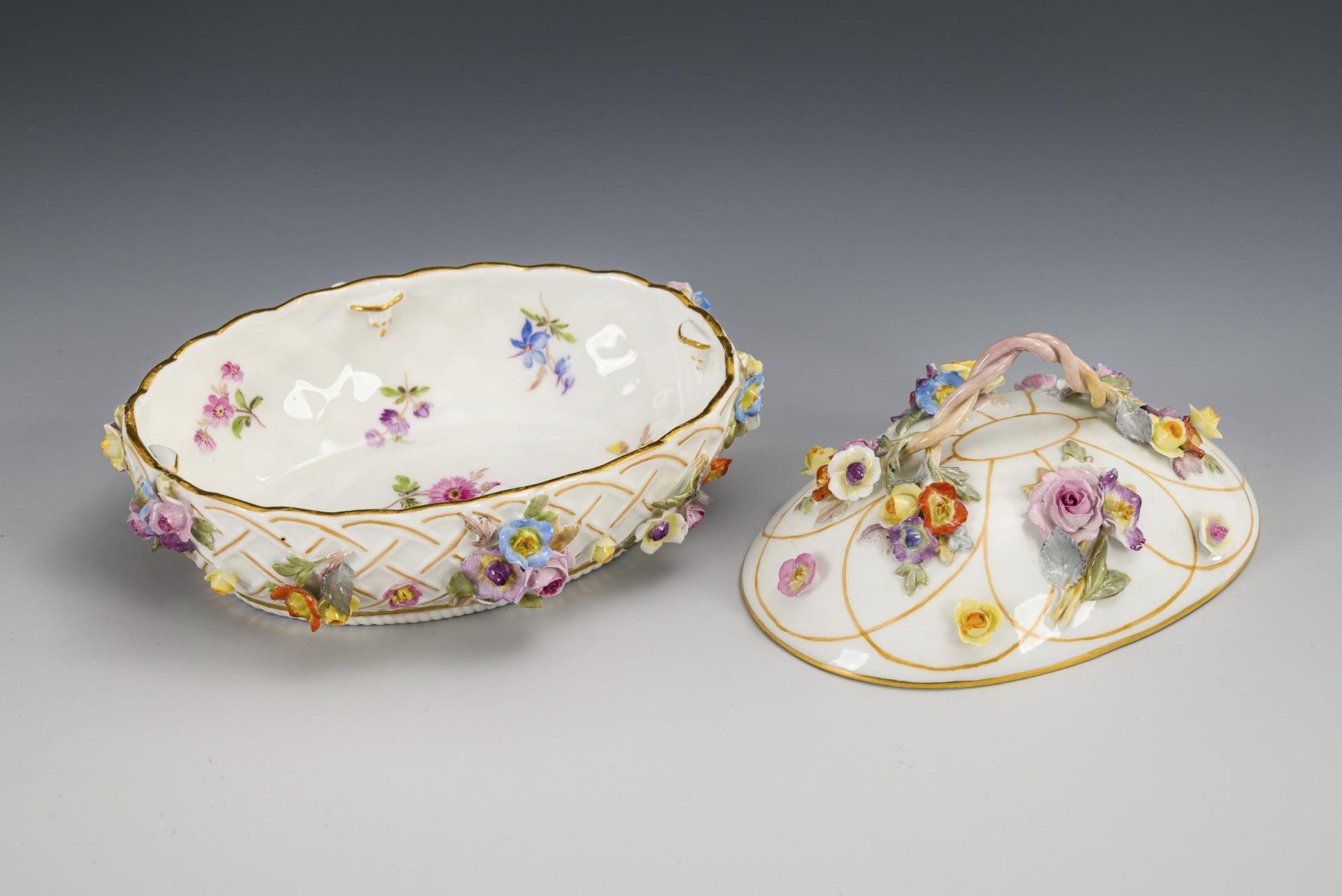 Ovale, reich mit Blüten belegte Dose mit Korbrelief und Deckel mit gedrehtem Asthenkel. Deckel mit sehr viel Spiel.