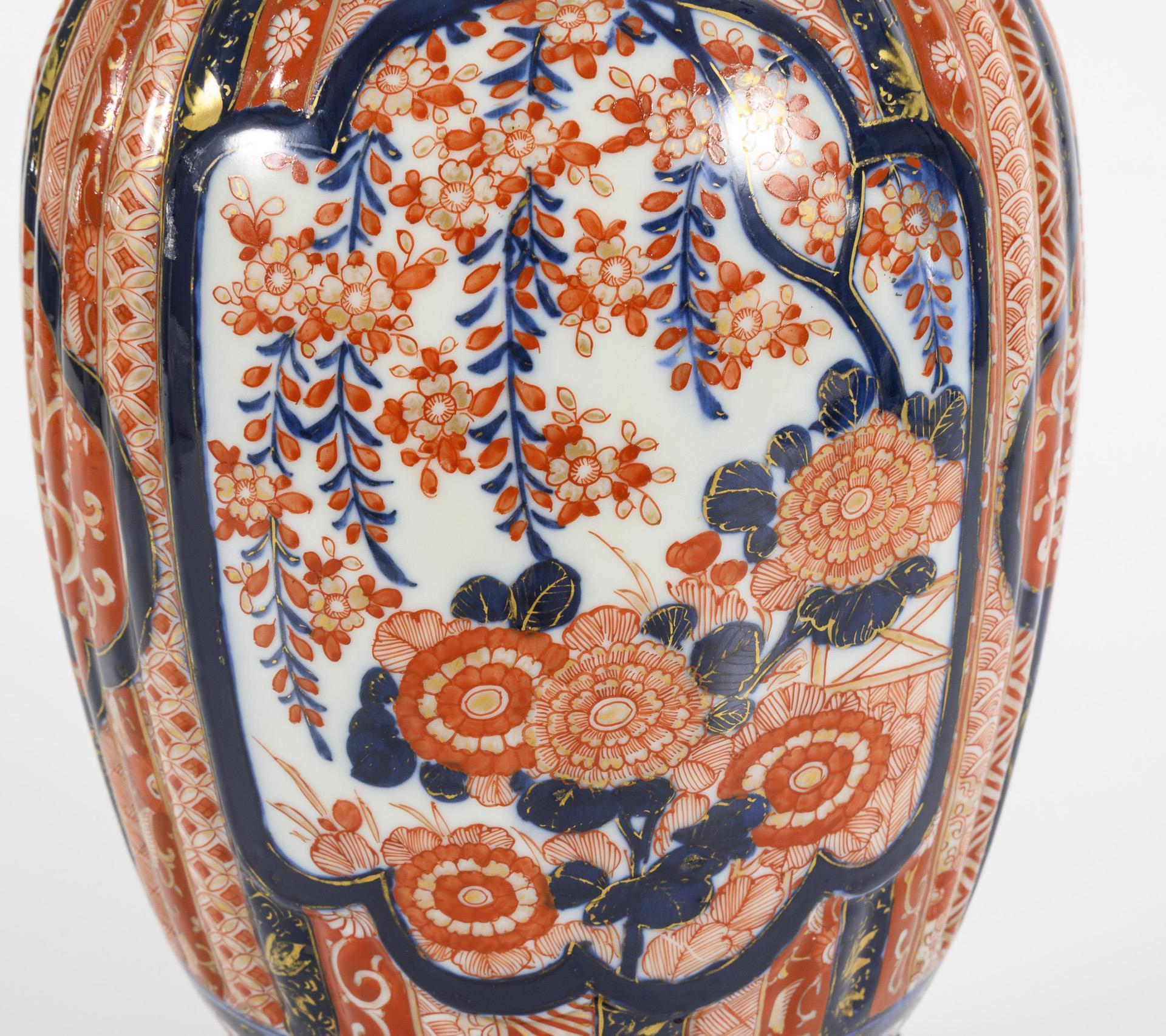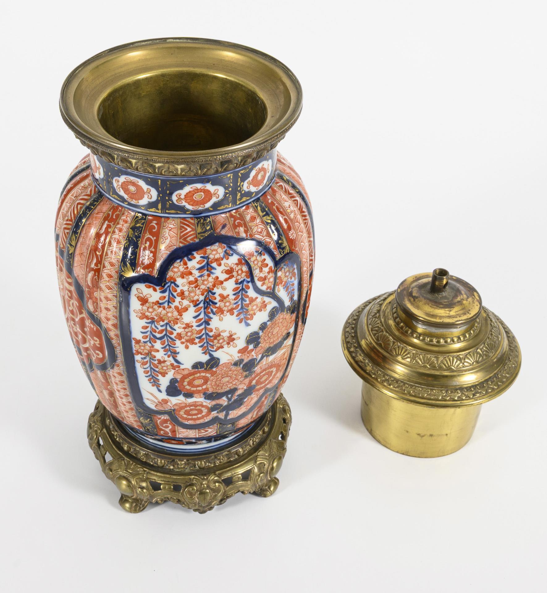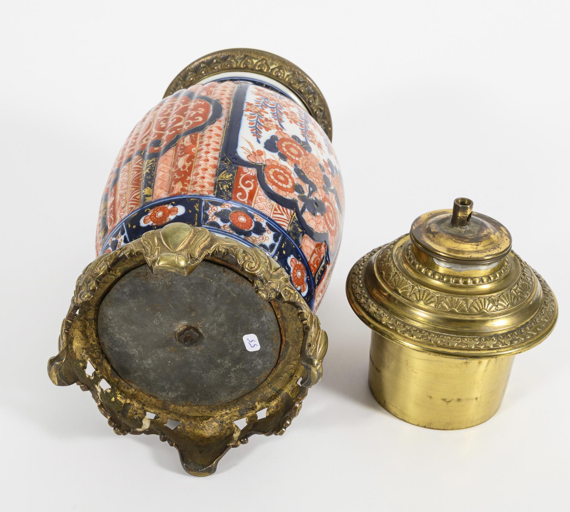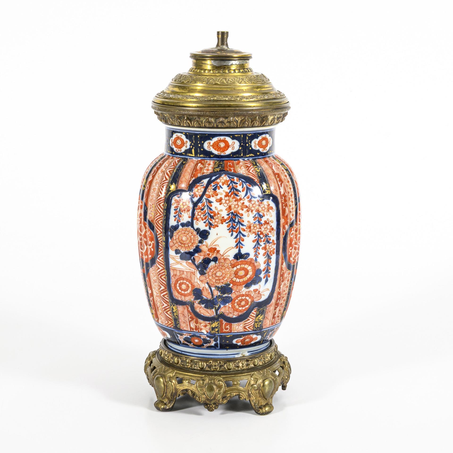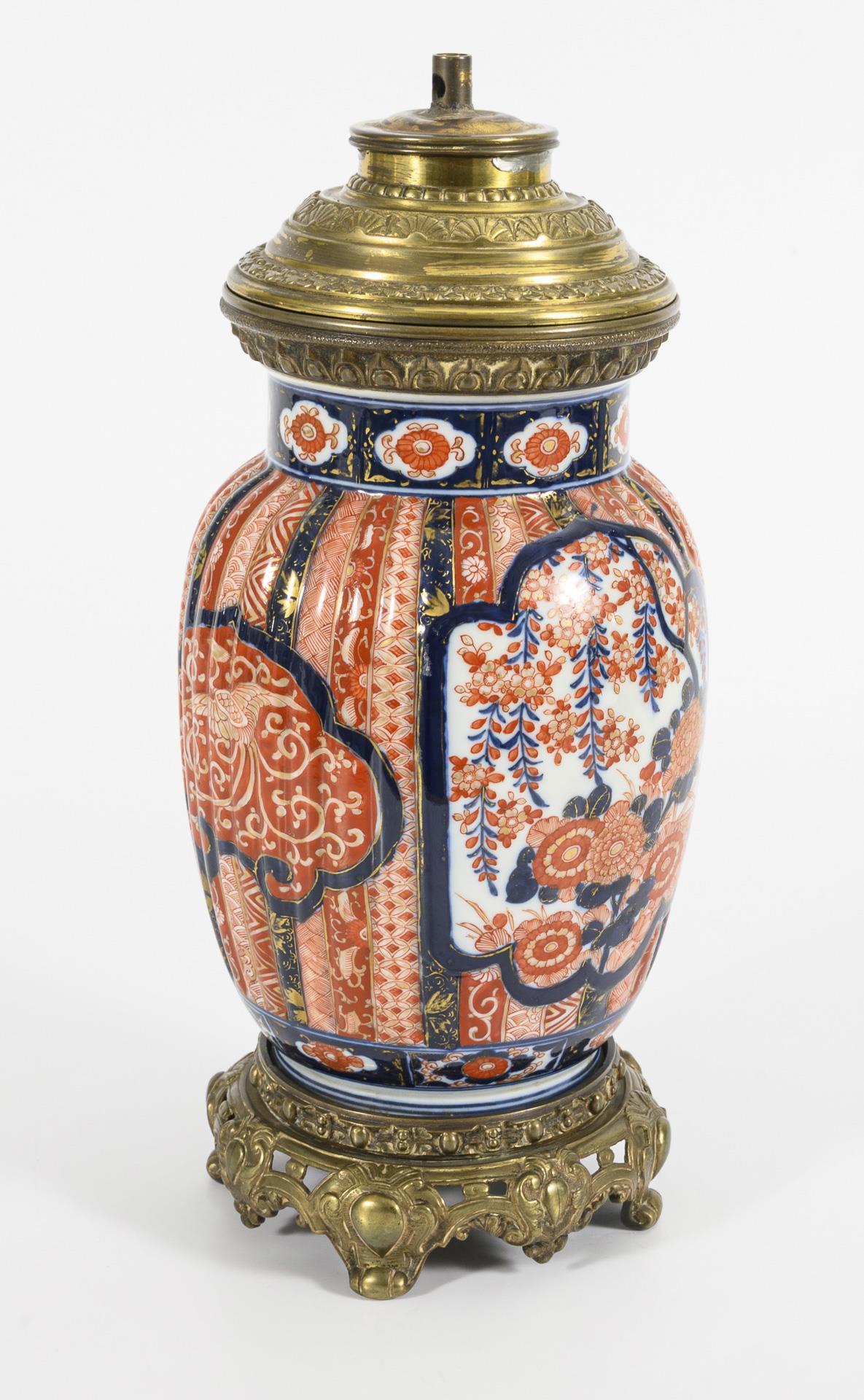 Aufwändig gestalteter Korpus mit feiner Rippung, die Rippen jeweils unterschiedlich gemustert. Zwei Bildkartuschen mit Blumenelementen sind glatt und von der Rippung ausgenommen. Meatllmontierungen, wohl als Lampenfuß konzipiert. Ein Chip am Fuß, fast von der Metallfassung verdeckt.