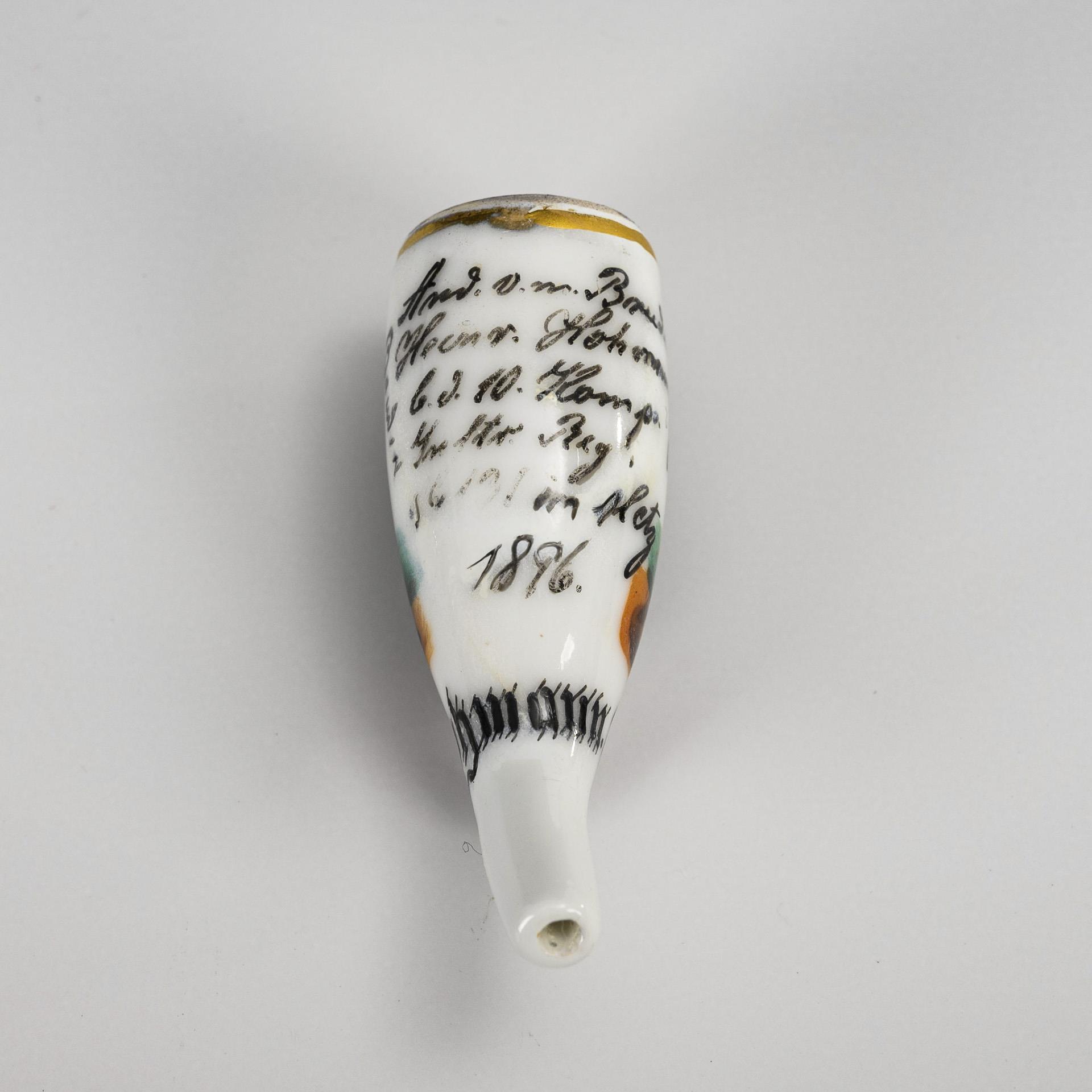 Kleiner "Reservisten"-Pfeifenstummel mit zentralem Schulterstück "131", flankiert von einem Soldaten und einem Zivilisten. "Willkommen lieber Bruder", "Andenken v. m. Bruder Heinr. Hohmann b. d. 10. Komp. ...131 in Metz 1996", "Hohmann, Th.". Minimal berieben.