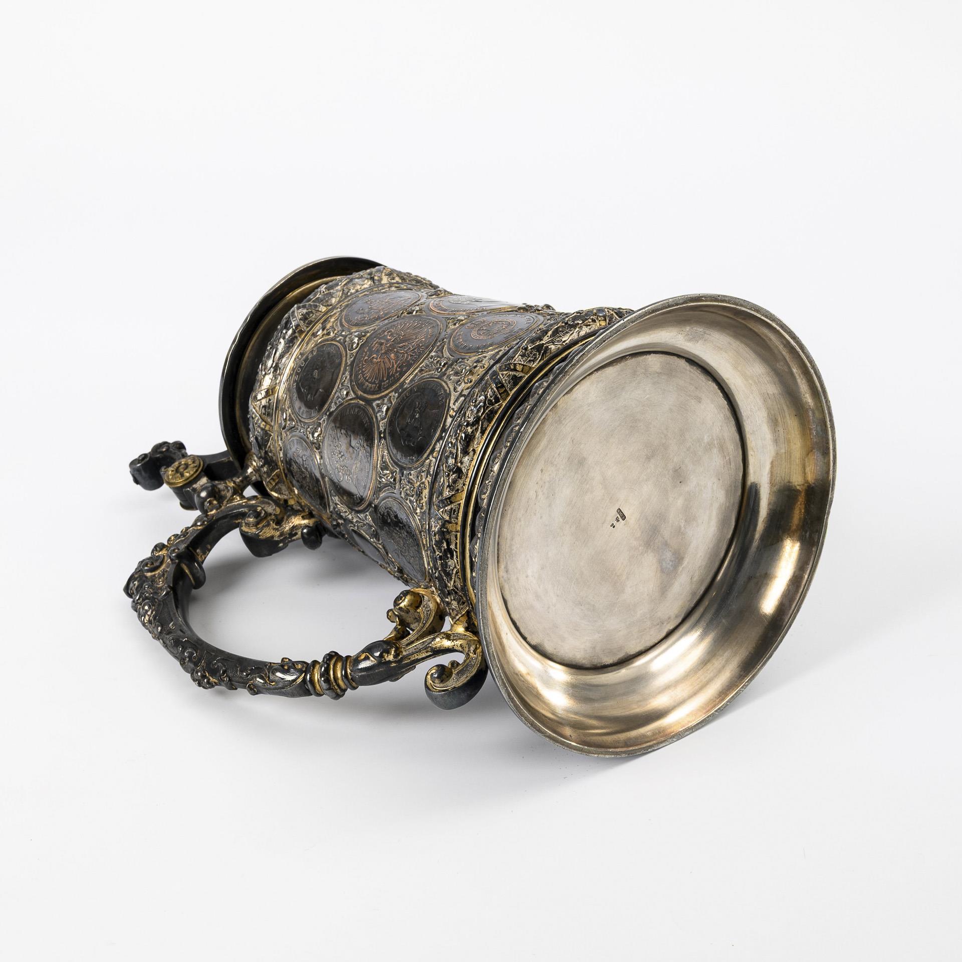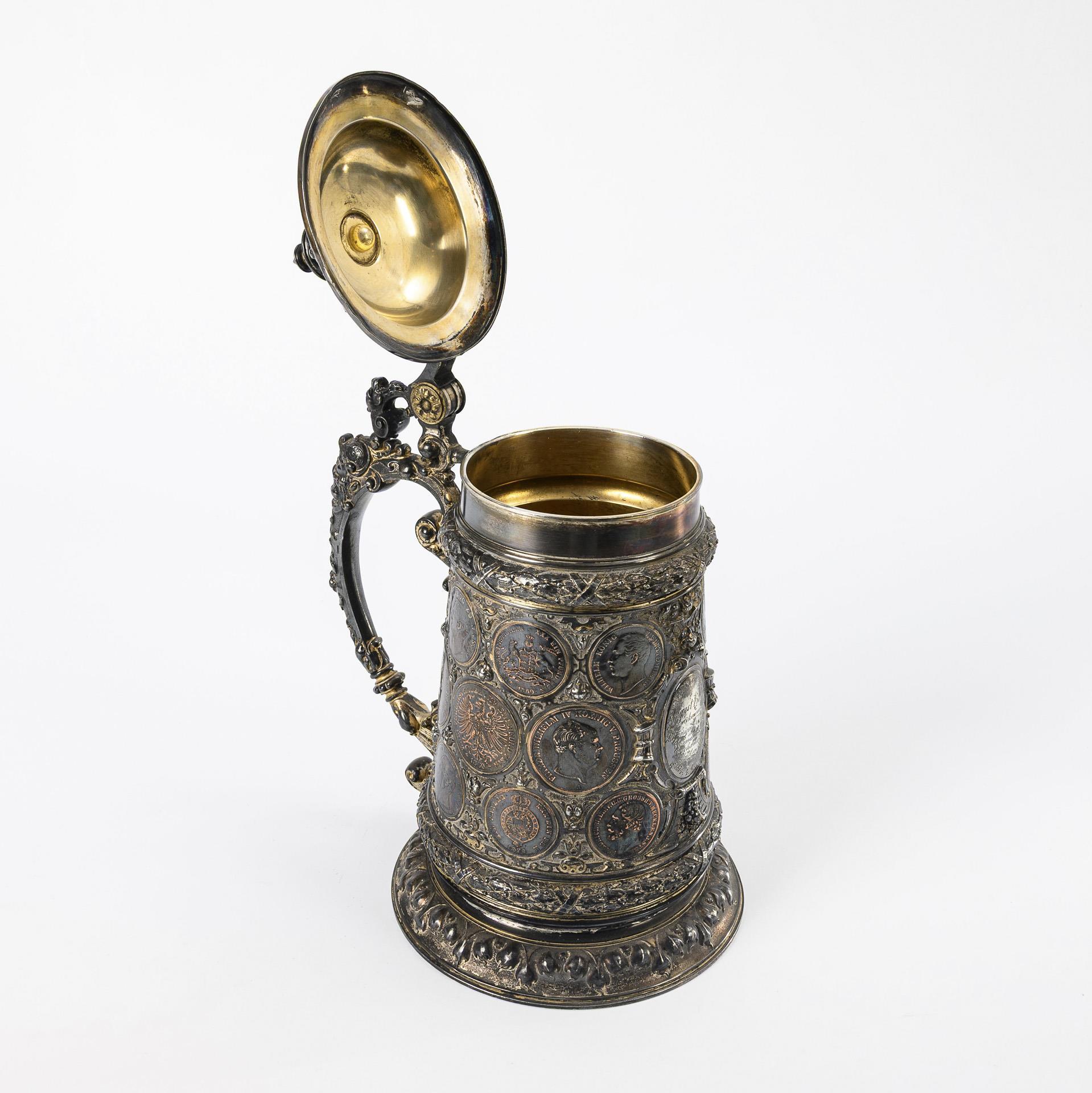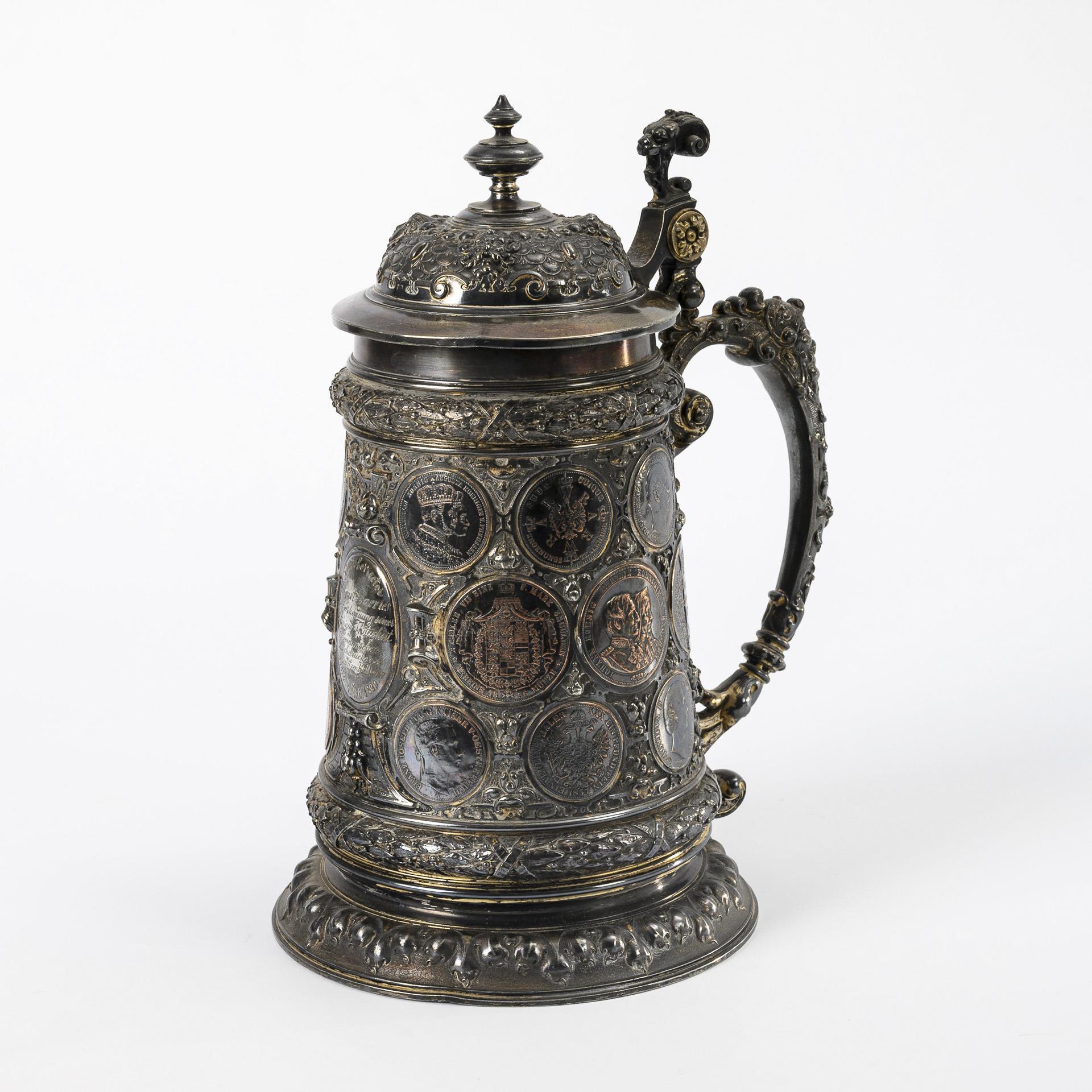 Leicht konischer Krug, überaus reich mit Ornament verziert, sowie Krieger-Maskaron am Henkel und Löwenkopf am Drücker. Auf der Wandung zentrale Rollkartusche mit Gravur "Herrn Corrector August Harries" für 25 Jahre in der Grohmannschen Buchdruckerei, gewidmet von Diers 1899. Des weiteren zahlreiche Abschläge von Münzen. Versilberung berieben, Deckelrand minimal verbeult.