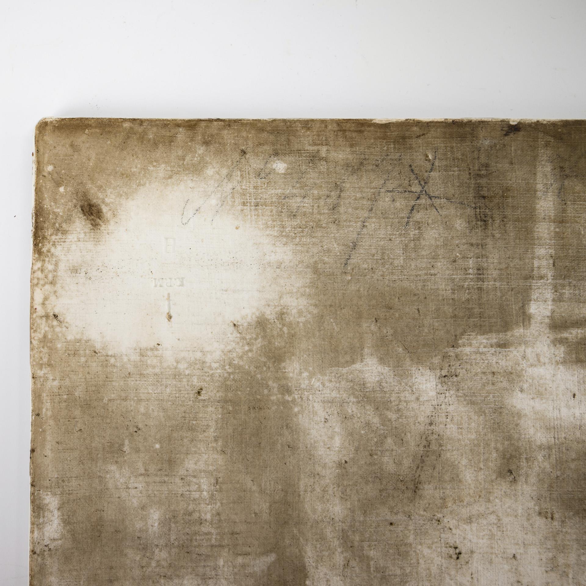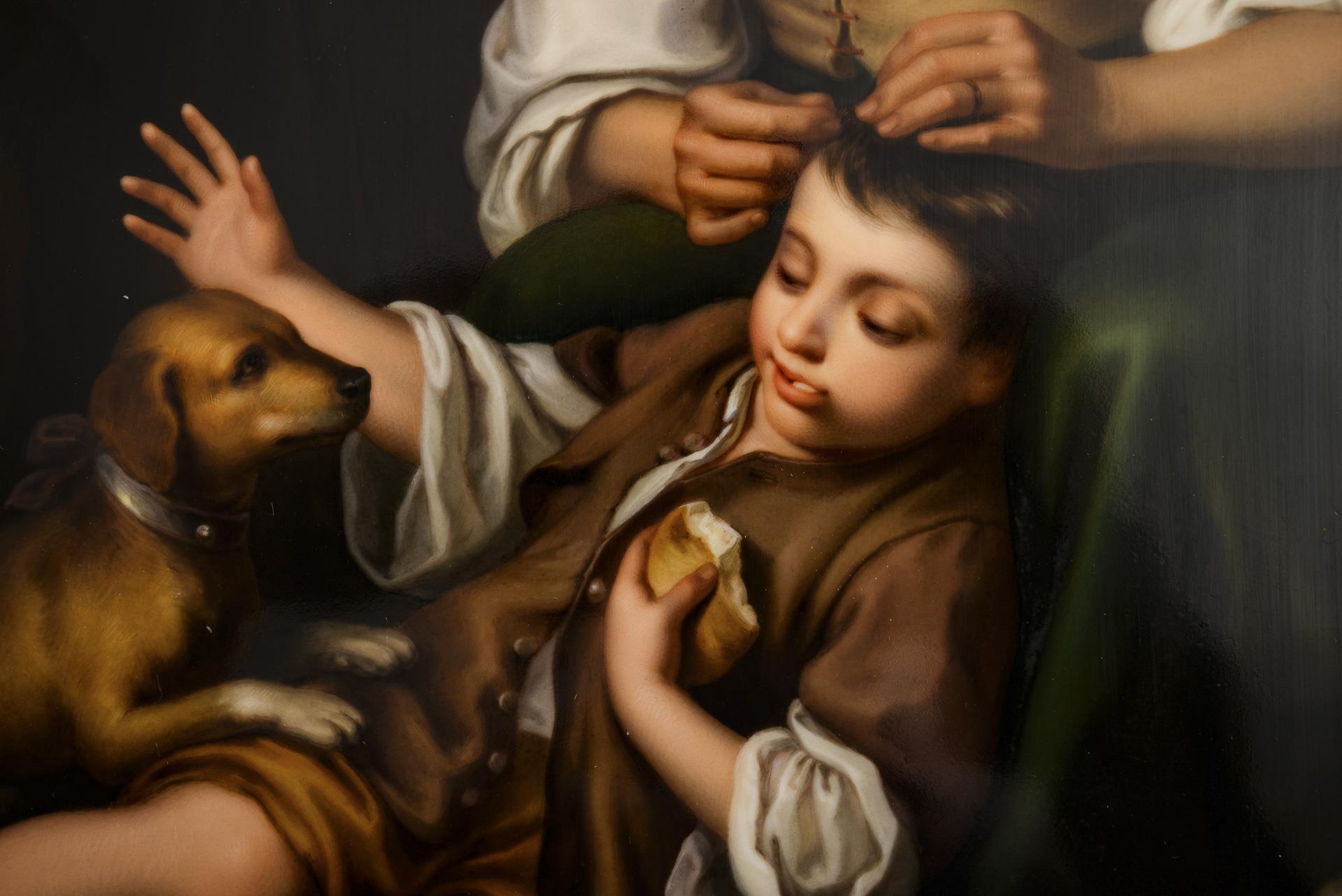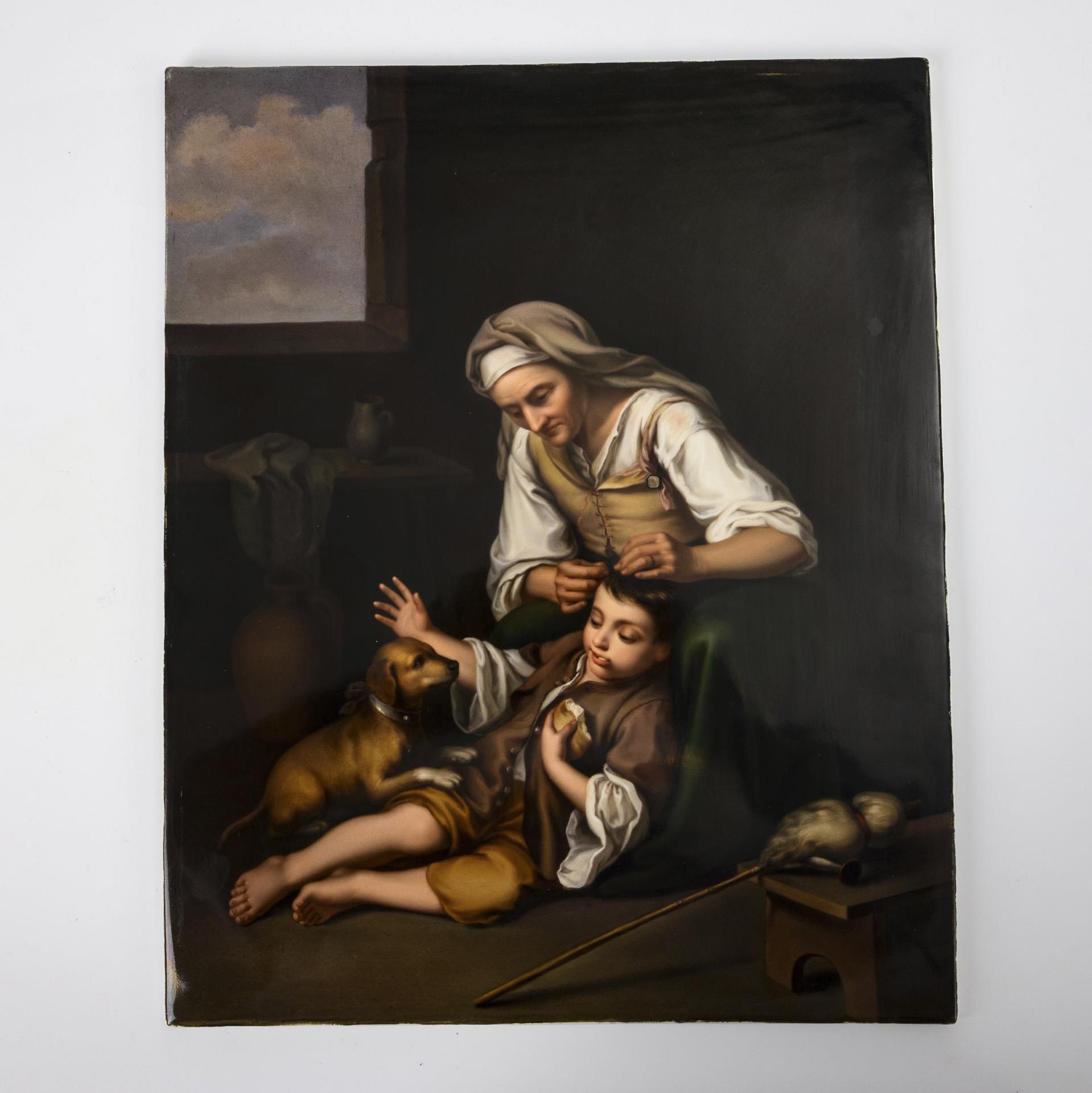 Rechteckige Platte mit der Darstellung einer alten Frau, einem Knaben die Haare lausend, nach einem Gemälde des spanischen Malers Bartolomé Esteban Murillo (1617-1682). 2 Defekte am Rahmen.