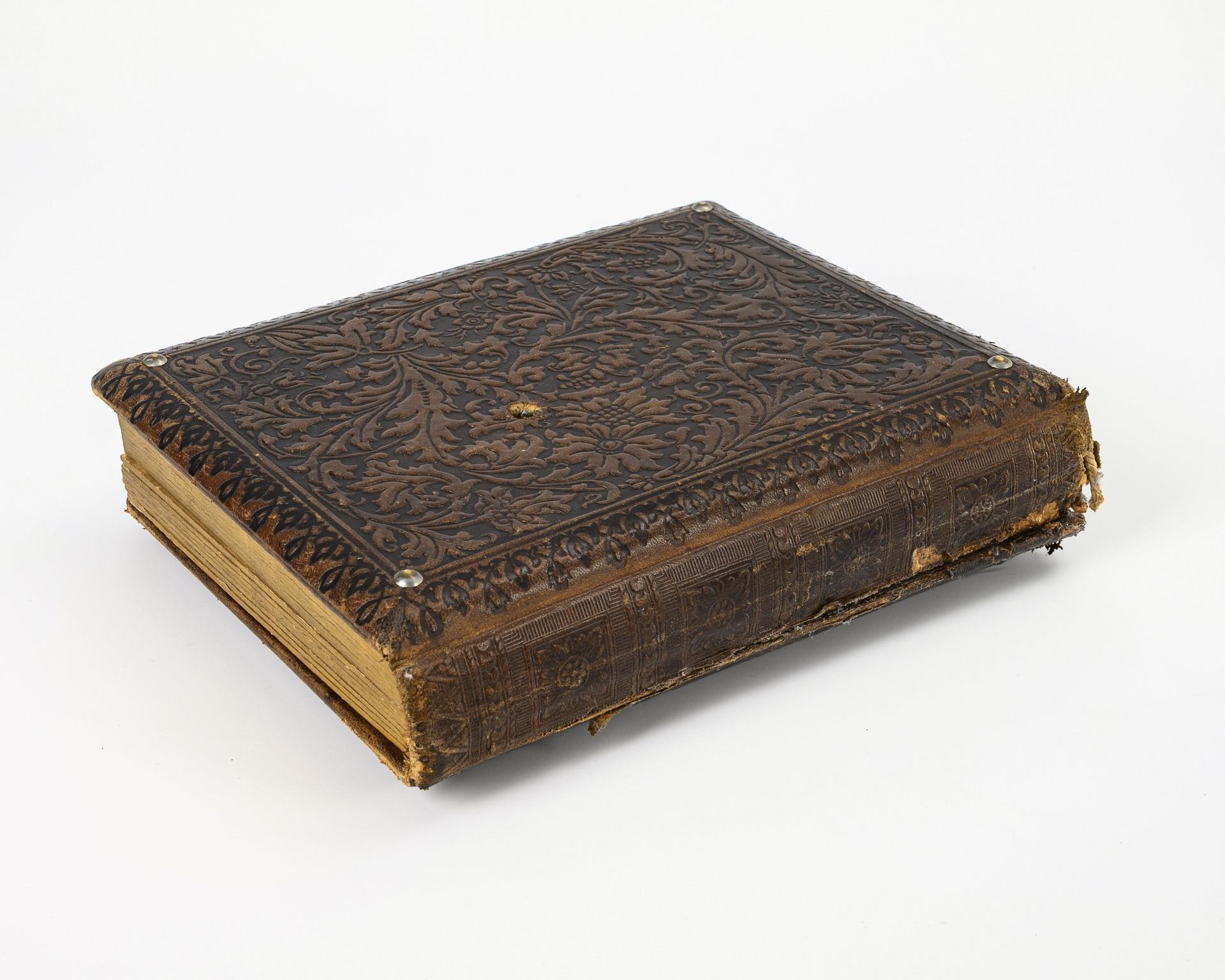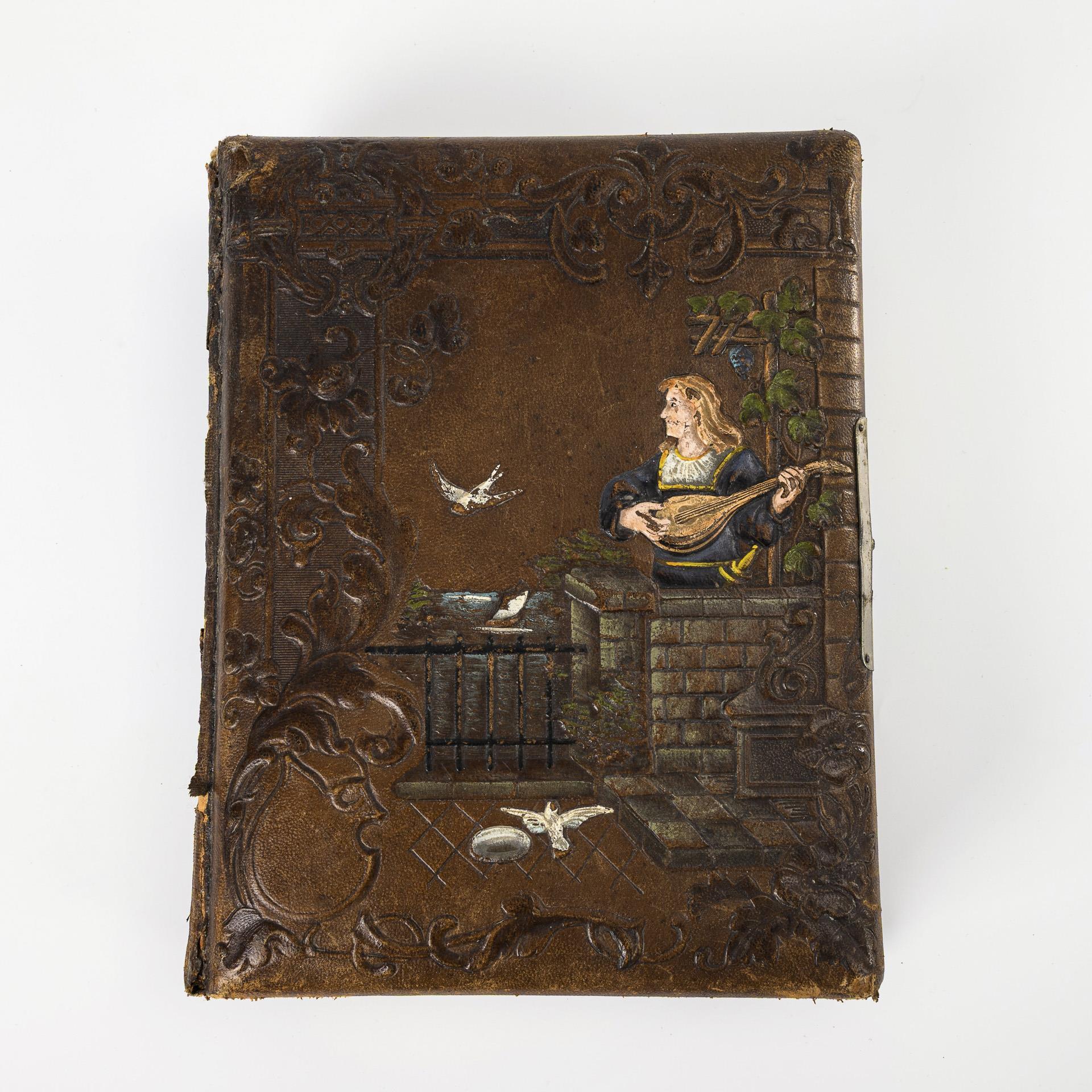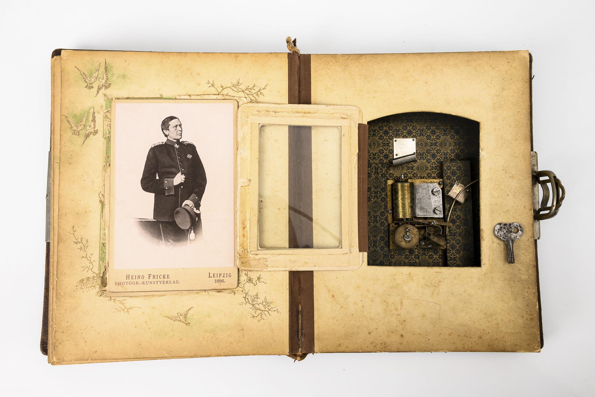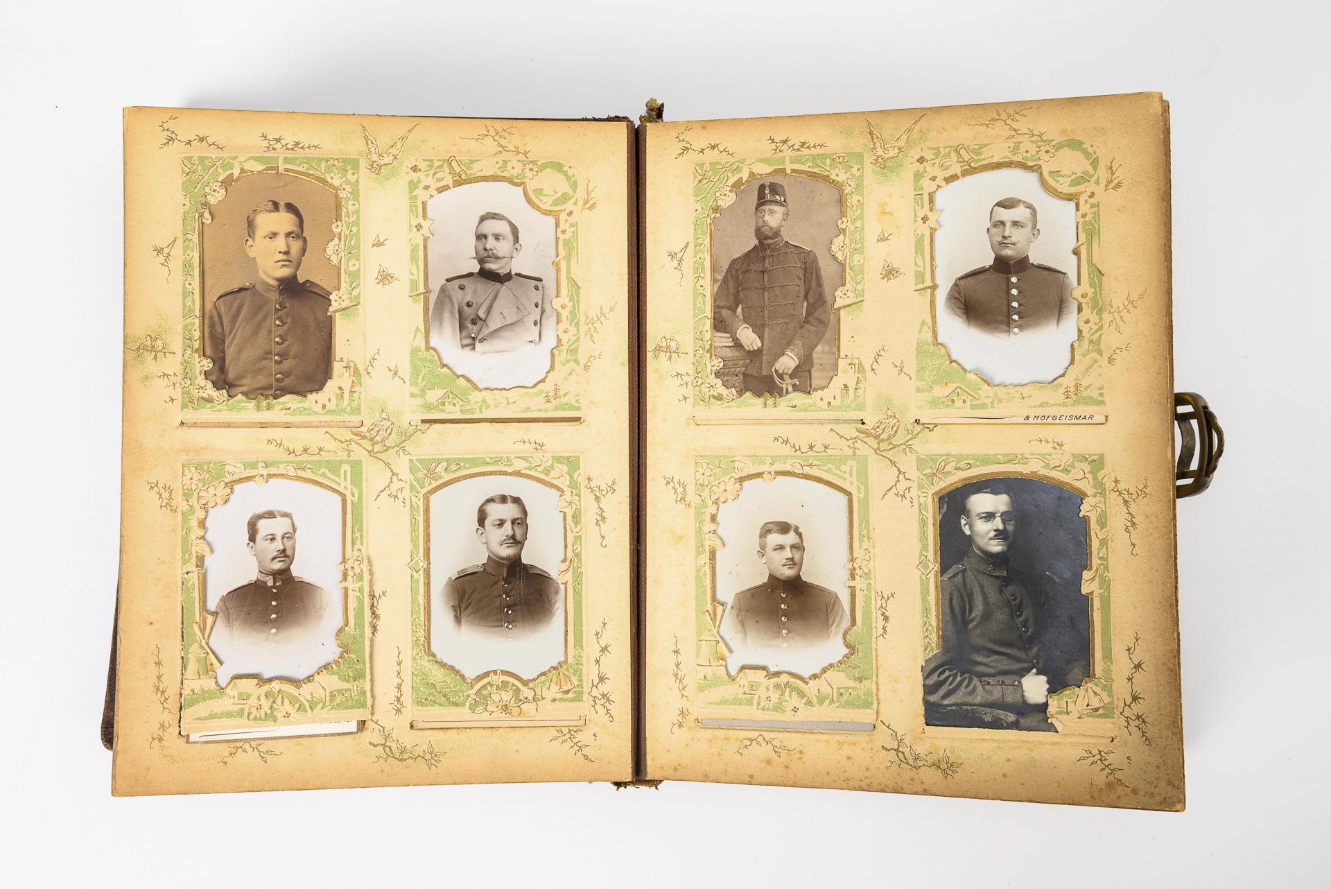 Auf dem Deckel Minnesänger mit Laute, Einband sonst reich ornamental geprägt; das ungemarkte Spielwerk beginnt beim Öffnen der Schließe. Zahlreich Soldatenbilder, darunter 6 größere, davon 4 mit Fotodruckrahmen, z.B. Hüftbildnis eines Matrosen der SMS Pelikan (Fotoatelier Kiel), Standbildnis eines Soldaten des 31. Art.-Rgt. (Atelier Charlottenburg), Standbildnis wohl eines Kavalleristen (Atelier Bonn), Büste eine Soldaten des 83. Rgt., desweiteren Brustbild eines Soldaten und Hüftbildnis eines Offiziers mit Eisernem Kreuz (dieses Atelier Leipzig 1896). 17 kleinere Fotos von Soldaten, darunter 1 Offizier swoei 4 zivile Fotos. Alters-/Gebrauchsspuren am Album, Buchrückengelenk gerissen. Spieluhr spielt. Fotos teils Alters-/Gebrauchsspuren, teils eingeklebt.