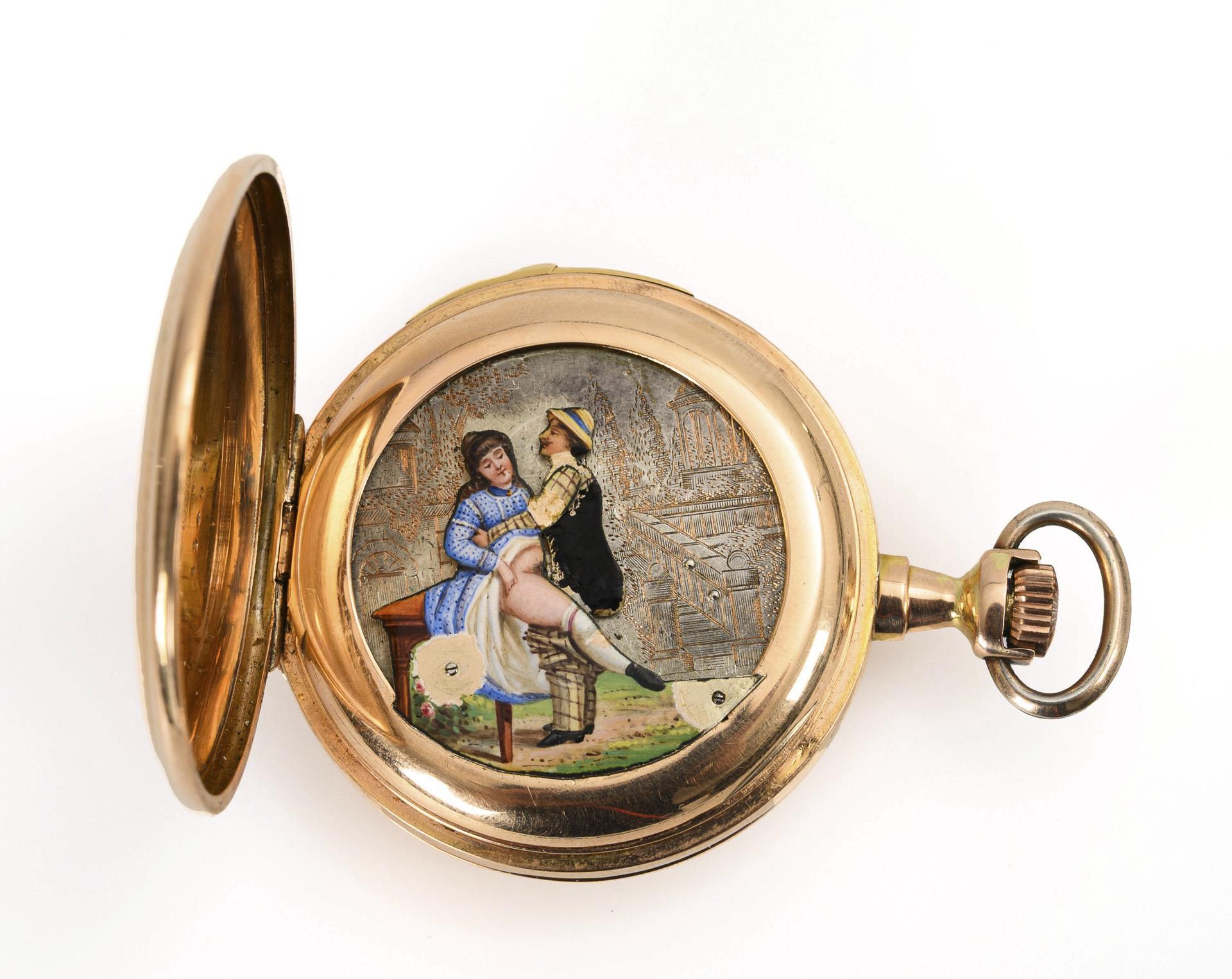 Guillochiertes Gehäuse mit leerer Ovalreserve, Staubdeckel mit einer ergänzt eingebauten, erotischen Szene in farbigem Email vor einer gravierten Landschaft, nummeriert 4259. Alters- und Gebrauchsspuren, Bereibungen, partiell gedellt, Fehlstellen am farbig bemalten Email.