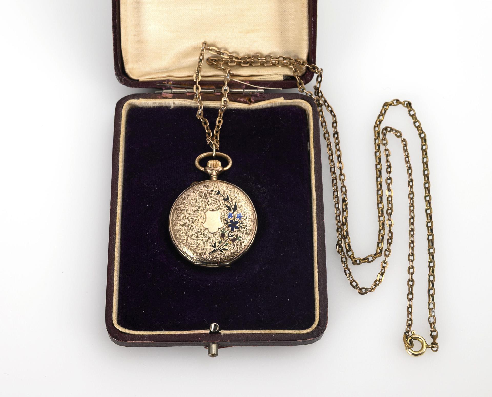 Fein ziseliertes, vergoldetes Lépine-Gehäuse mit farbigen Emaille-Blumen und leerer Wappenreserve. An Metallgliederkette mit kleinem Federring. Feiner Riss, kleine Dellen am Gehäuserand, vereinzelt Fehlstellen am Emaille.