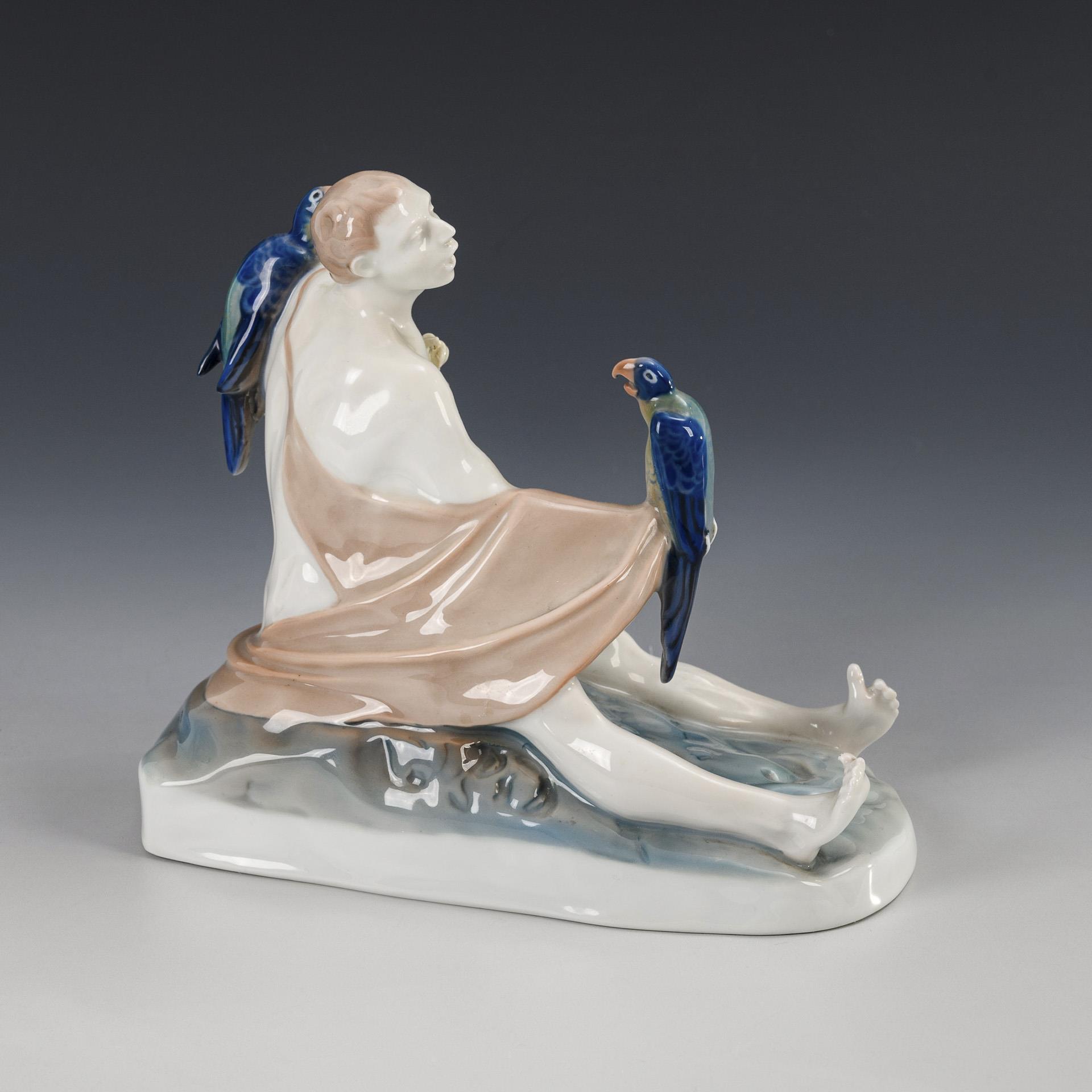 Auf einem Wellensockel sitzender junger Mann mit zwei Papageien. 1 Papageienkopf minimal restauriert, linke Hand restauriert.