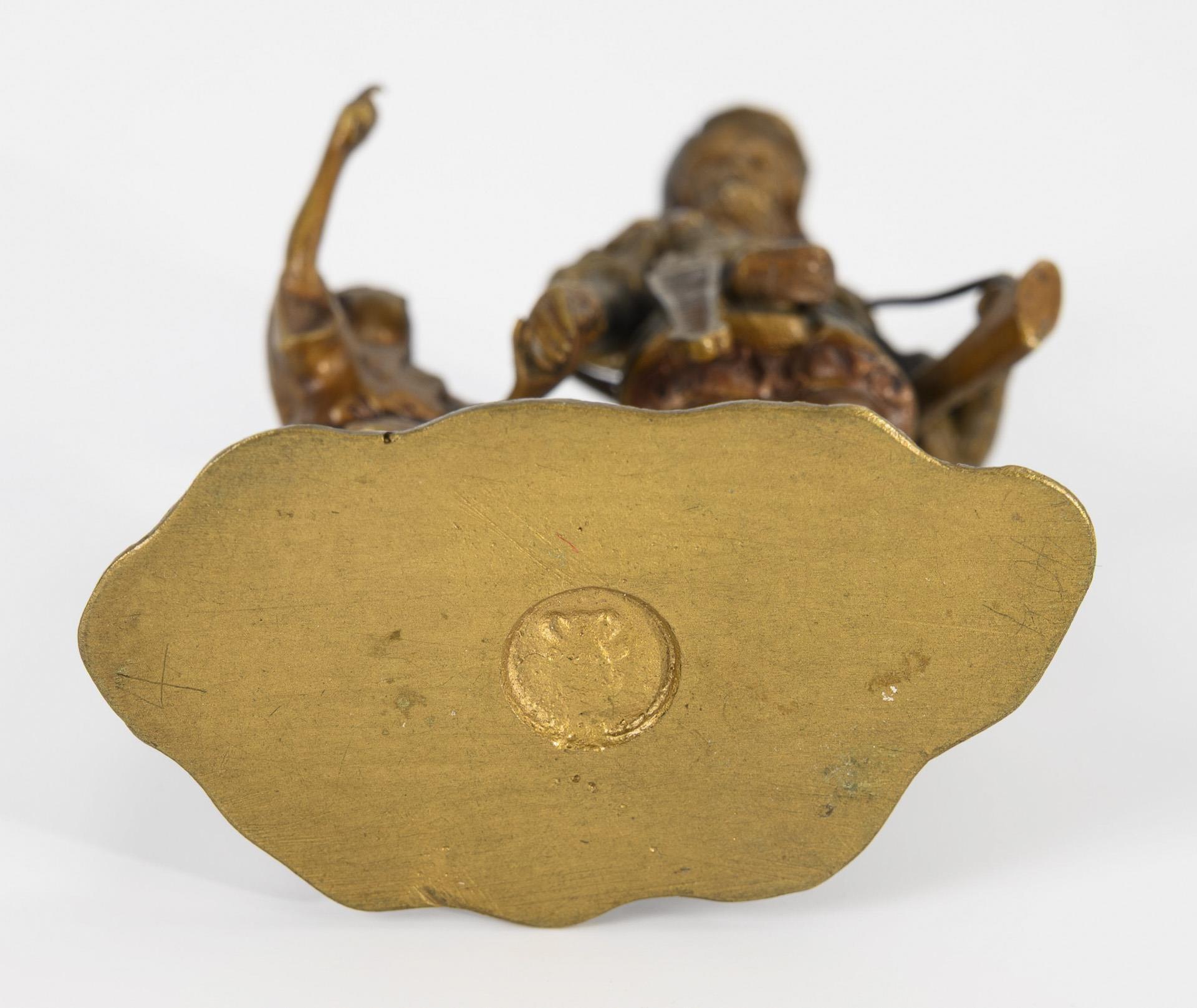 Bronze 2-farbig gefasst. Undeutliche Vasenmarke (Bergmann?) unter der Plinthe. H 8 cm.