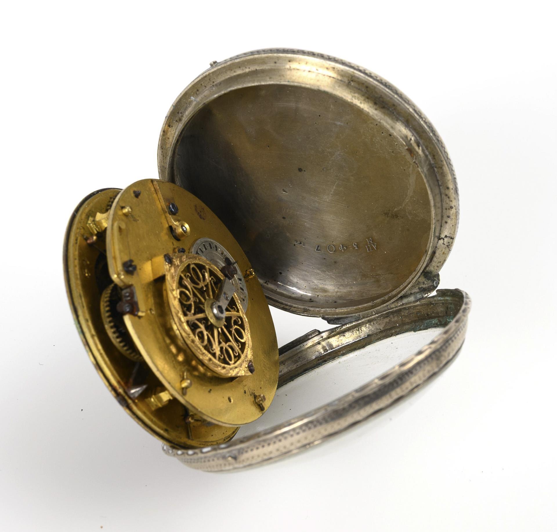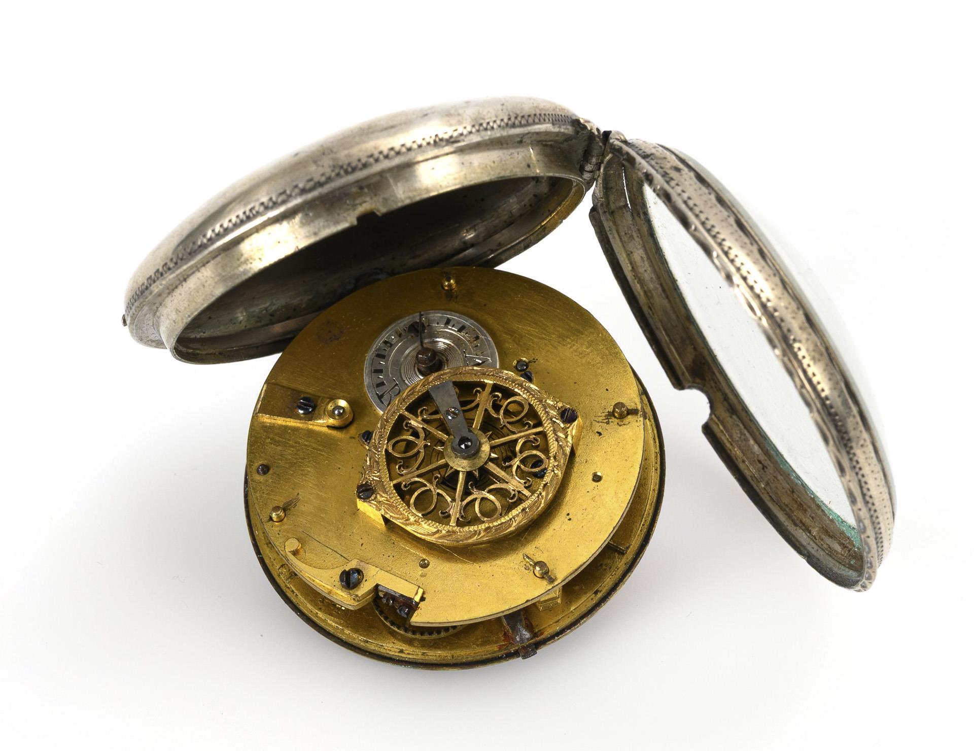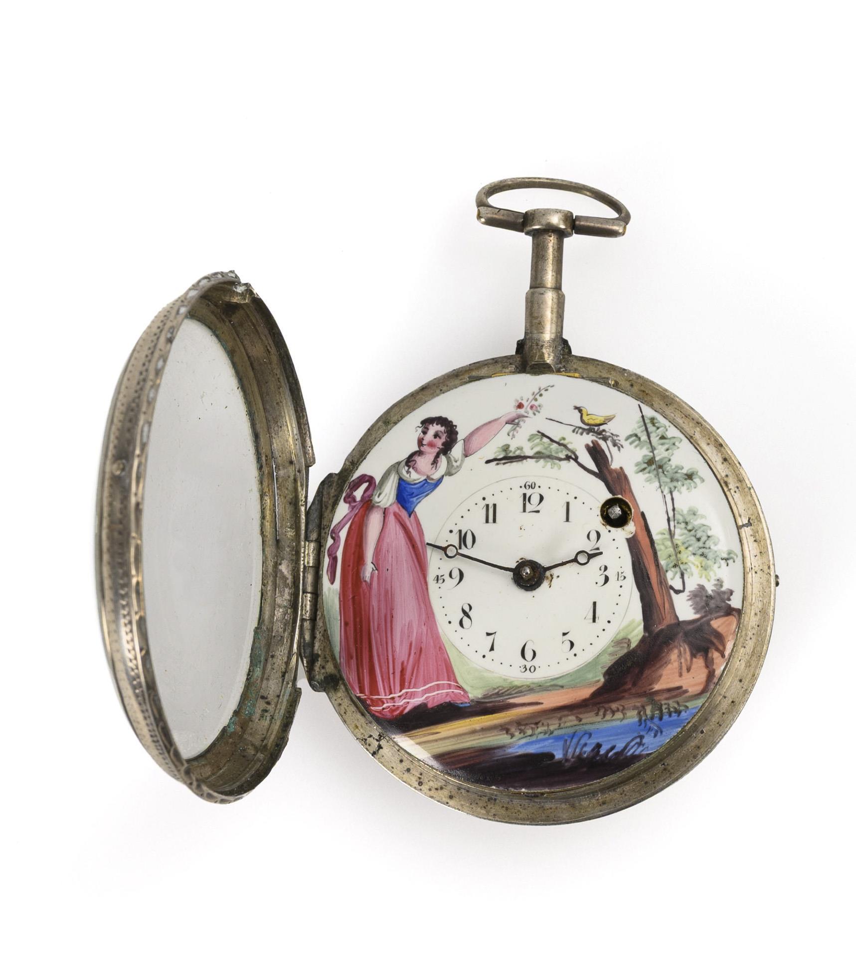 Sie befinden sich hier: Startseite Kategorien Uhren Silberne Biedermeier-Spindeltaschenuhr mit Dame und Vögelchen in einer Landschaft