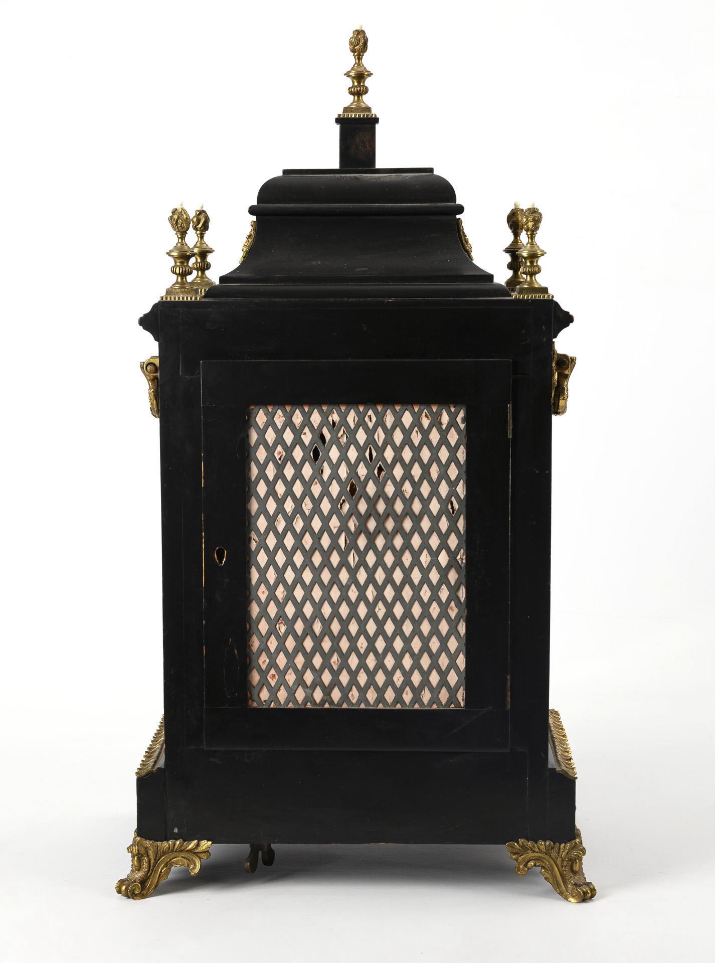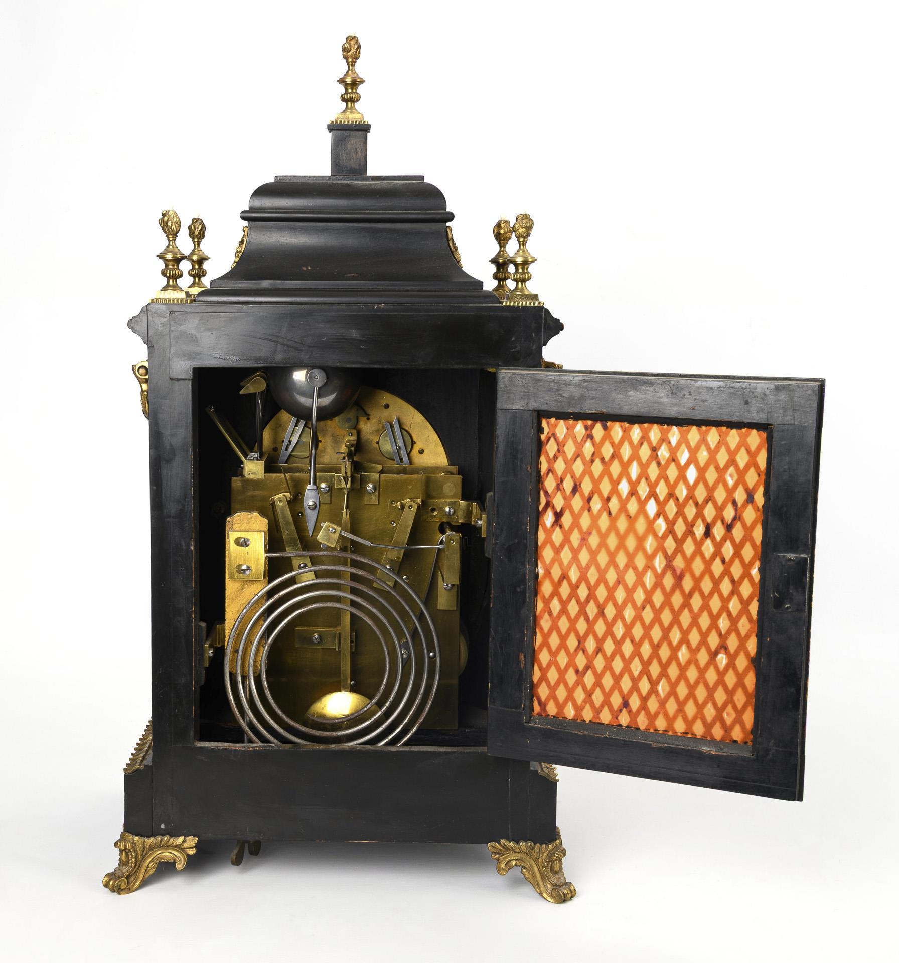 Messingplatinenwerk mit Grahamgang, Viertelstundenschlag mit Glockenspiel auf 8 Glocken. Geh- und Glockenspielwerk im Kurzzeittest funktionstüchtig, Stundenschlag auf Rundgong löst nicht aus, Revision empfohlen. Mit floralem Reliefdekor beschlagene Messingfront, versilberter Ziffernring mit römischen Stunden und arabischen Minuten, Minutenkranz, stilisierte Louis XV-Eisenzeiger. Im Bogenfeld 3 Hilfsblätter für Gangregulierung, Aktivierung des Schlags und Einstellung des Schlags auf 8 Glockenspiel oder Westminsterschlag, bezeichnet "Mappin & Webb Ltd. London W.".
