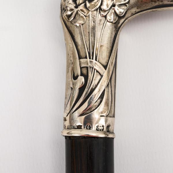 Silber und Makassar-Ebenholz(?) bzw. verschiedene Hölzer. L Stock mit Silbergriff 81 cm. Gesamt 0,7 kg.