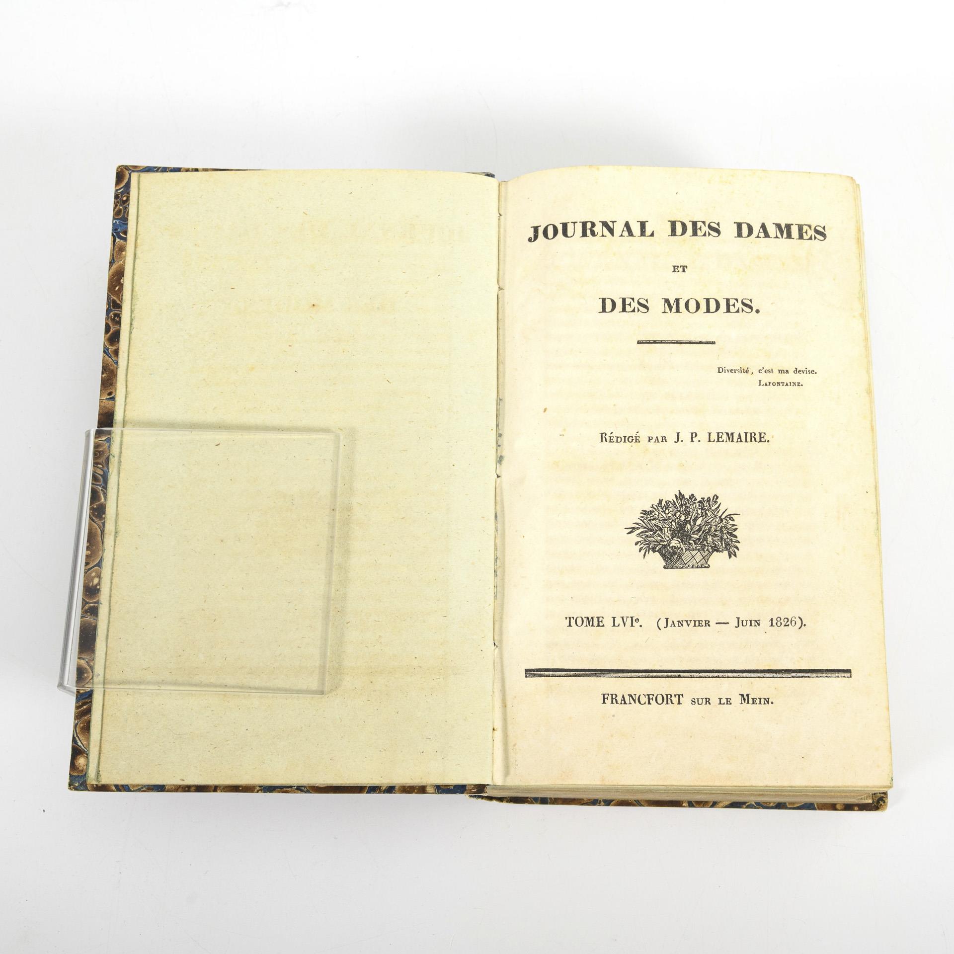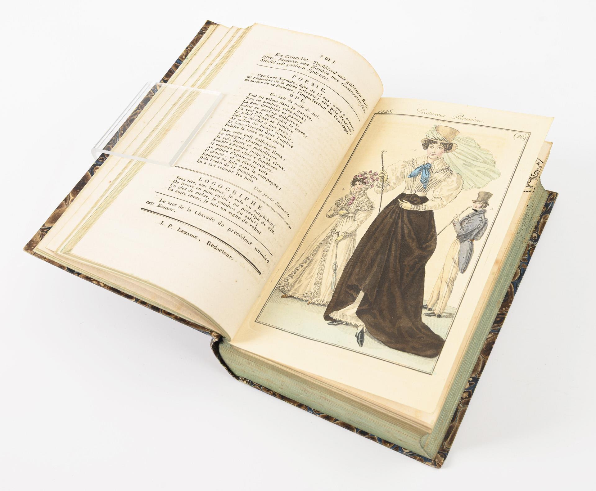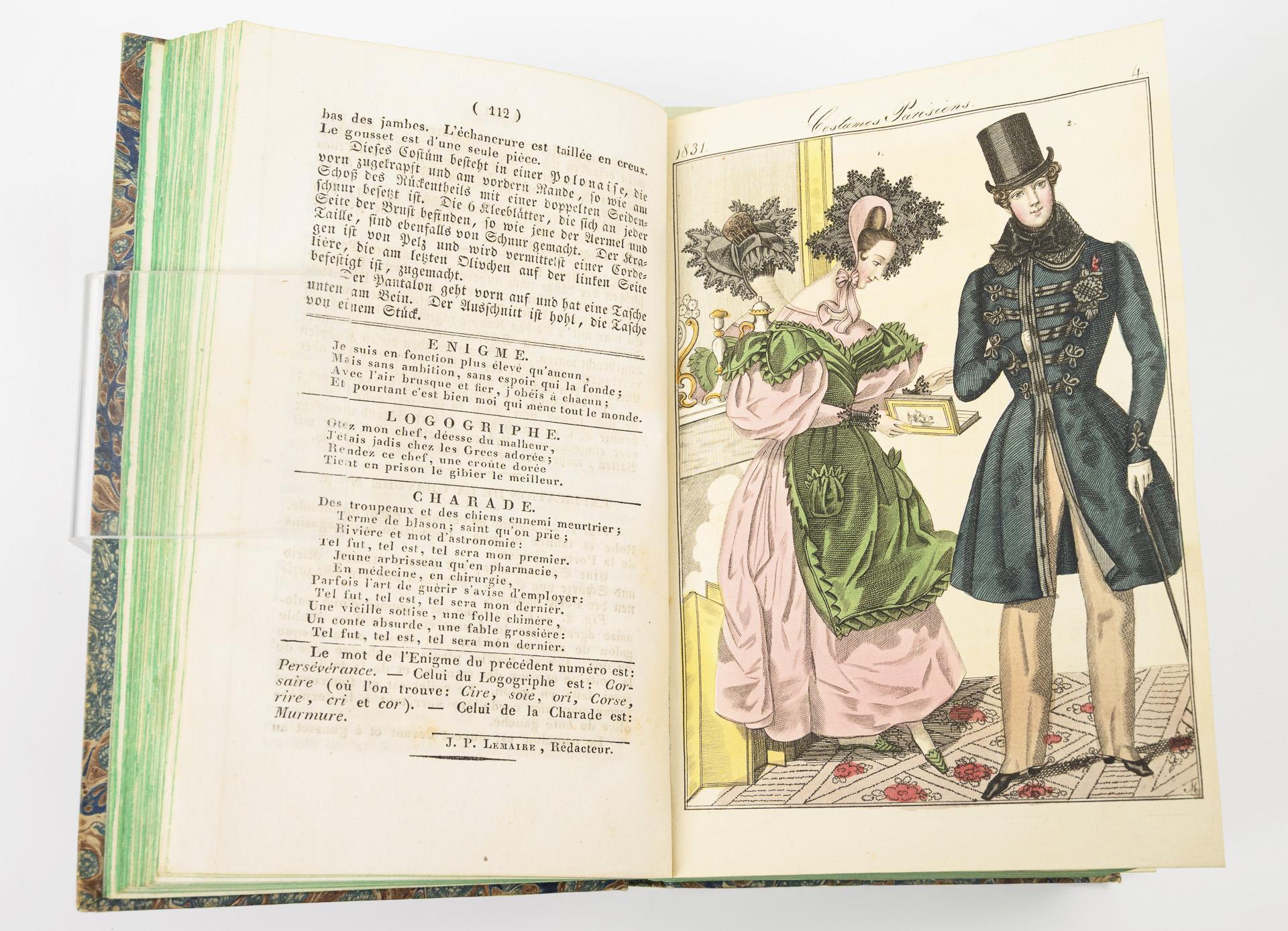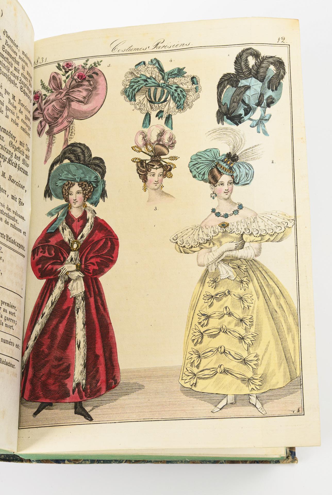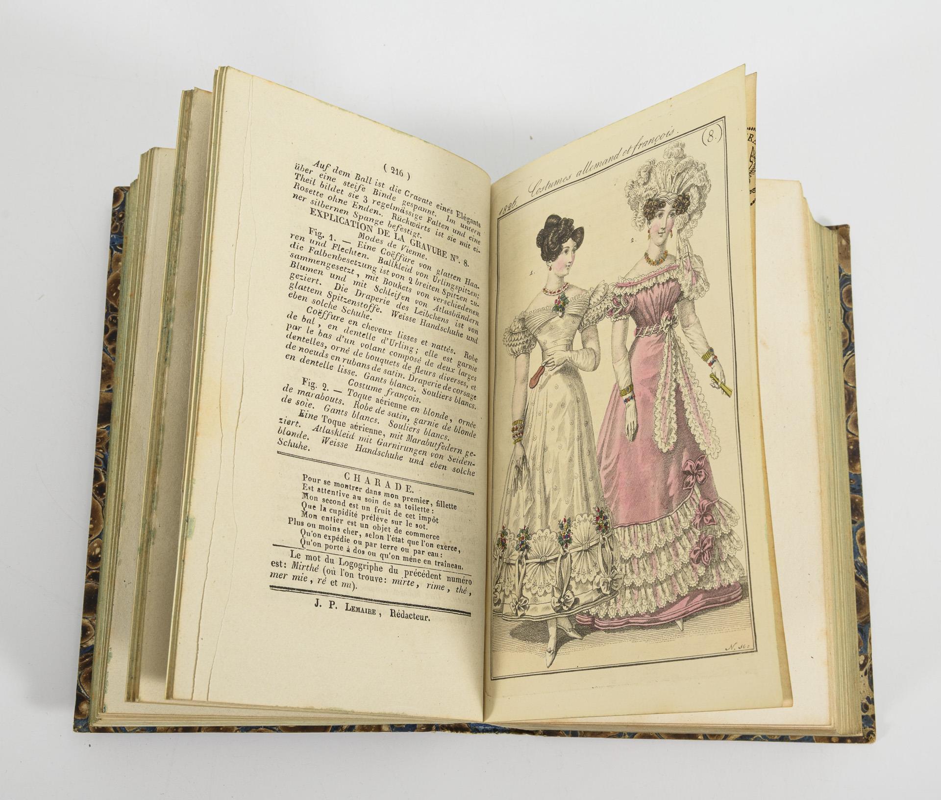 In französischer Sprache, die Erklärung der kolorierten Modekupfer auch in Deutsch. Einbände in sehr ähnlichem Marmorpapier mit einheitlichem Rückenschild, teils mit Grünschnitt. Alle Bände mit vielen Abbildungen, jedoch nicht kollationiert. Die Heft-Titelseite jeweils mit dem Steuerstempel der "Freie Stadt Fra(nkfurt)". 1825 Band 54; 1826 Band 56 und 57; 1827 Band 58; 1828 Band 60 und 61; 1829 Band 62; 1830 Band 65 und 66; 1831 Band 68. Schöner und guter Zustand.