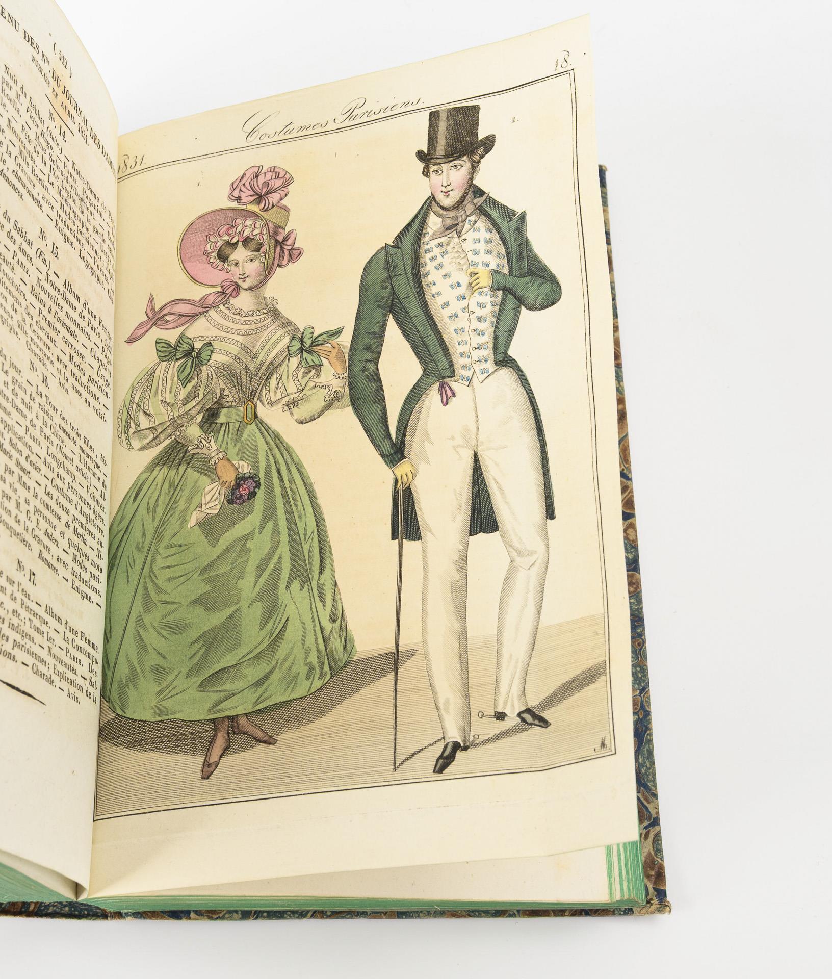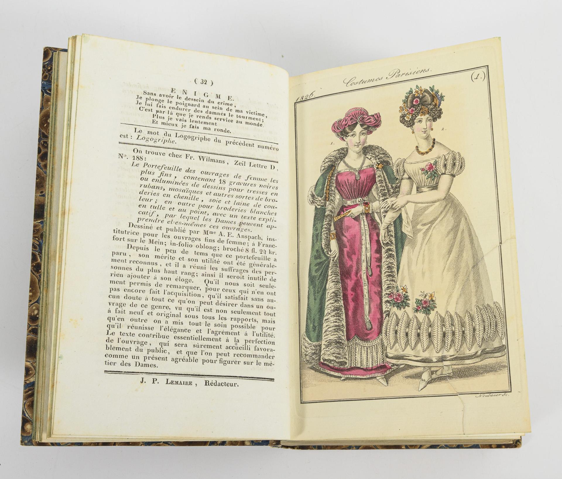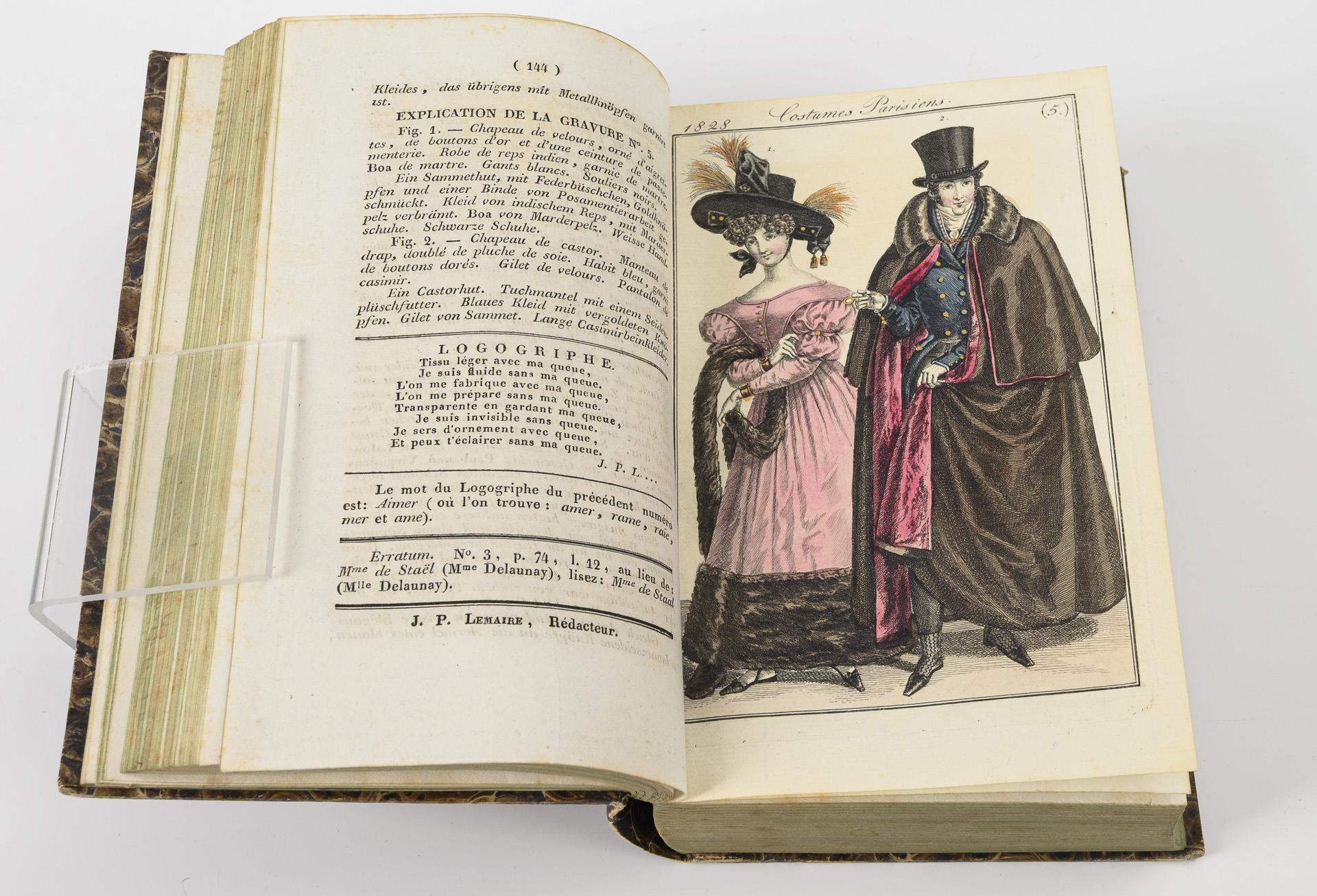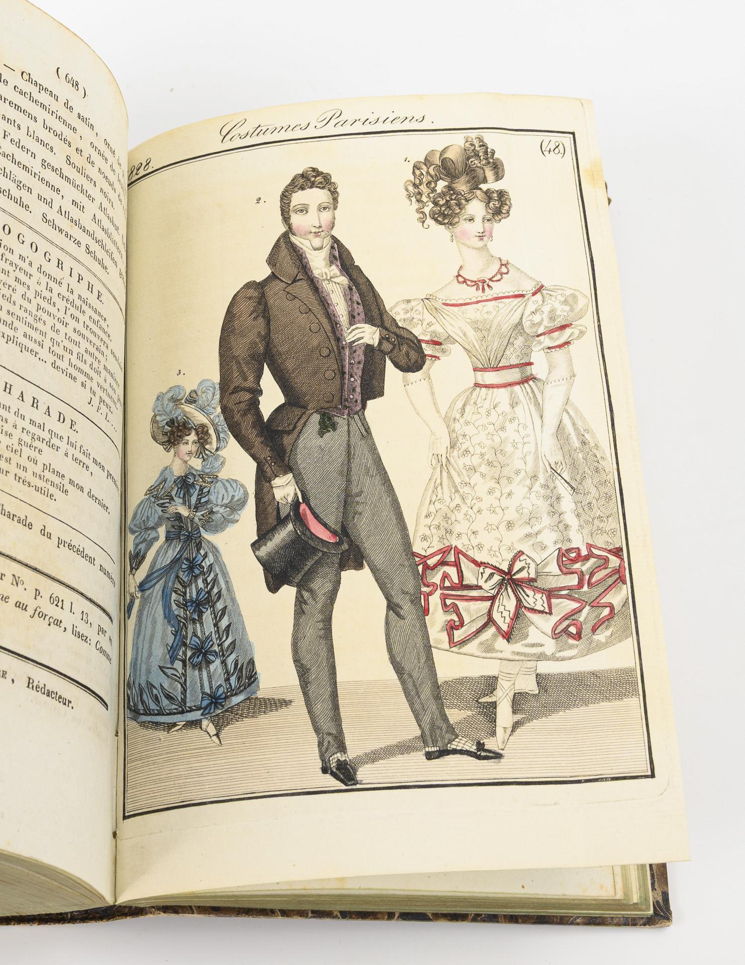 In französischer Sprache, die Erklärung der kolorierten Modekupfer auch in Deutsch. Einbände in sehr ähnlichem Marmorpapier mit einheitlichem Rückenschild, teils mit Grünschnitt. Alle Bände mit vielen Abbildungen, jedoch nicht kollationiert. Die Heft-Titelseite jeweils mit dem Steuerstempel der "Freie Stadt Fra(nkfurt)". 1825 Band 54; 1826 Band 56 und 57; 1827 Band 58; 1828 Band 60 und 61; 1829 Band 62; 1830 Band 65 und 66; 1831 Band 68. Schöner und guter Zustand.
