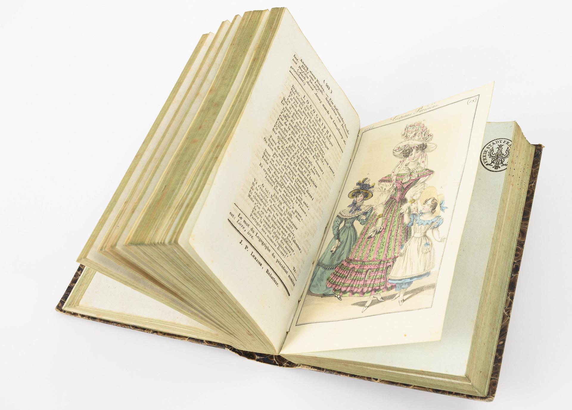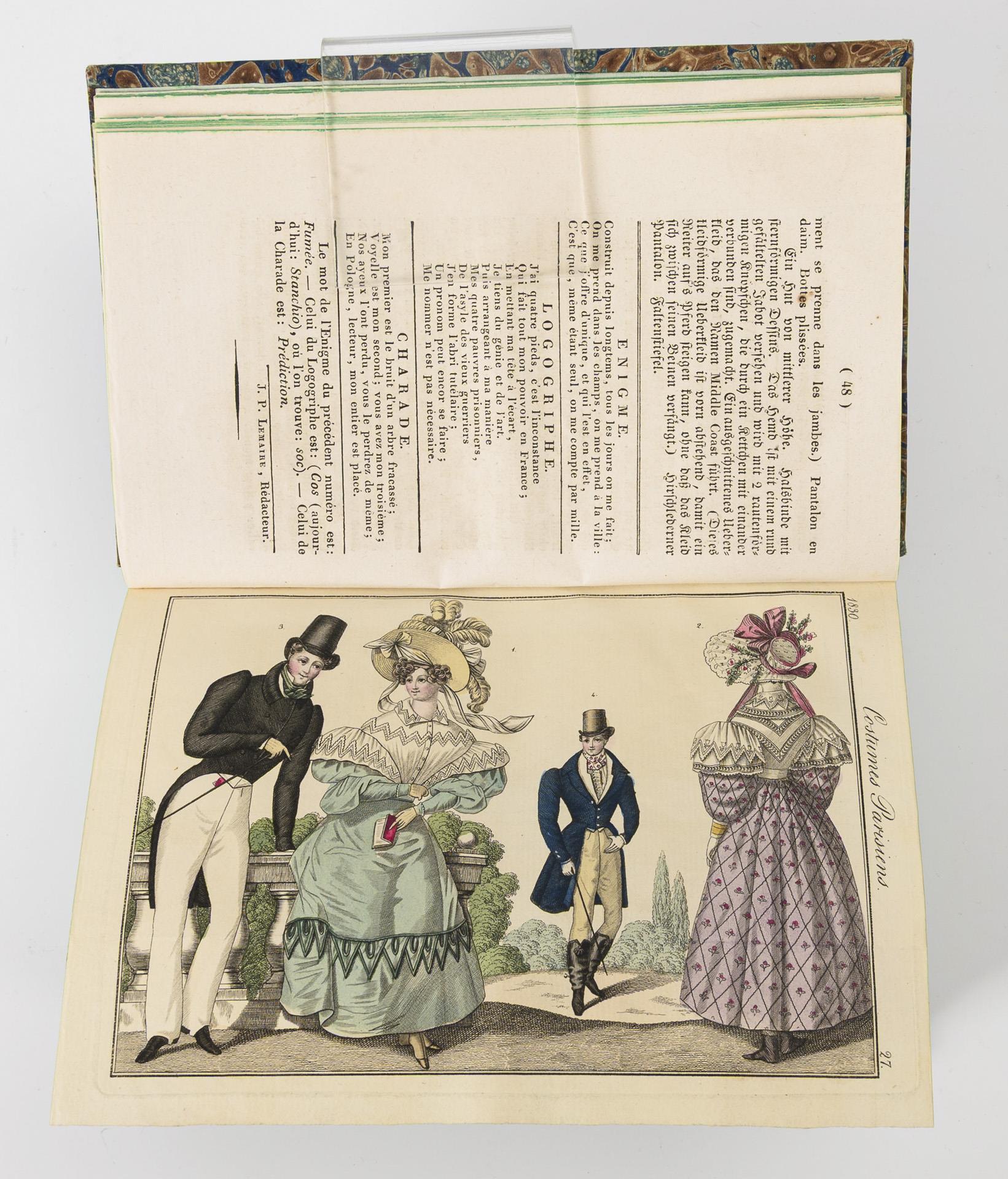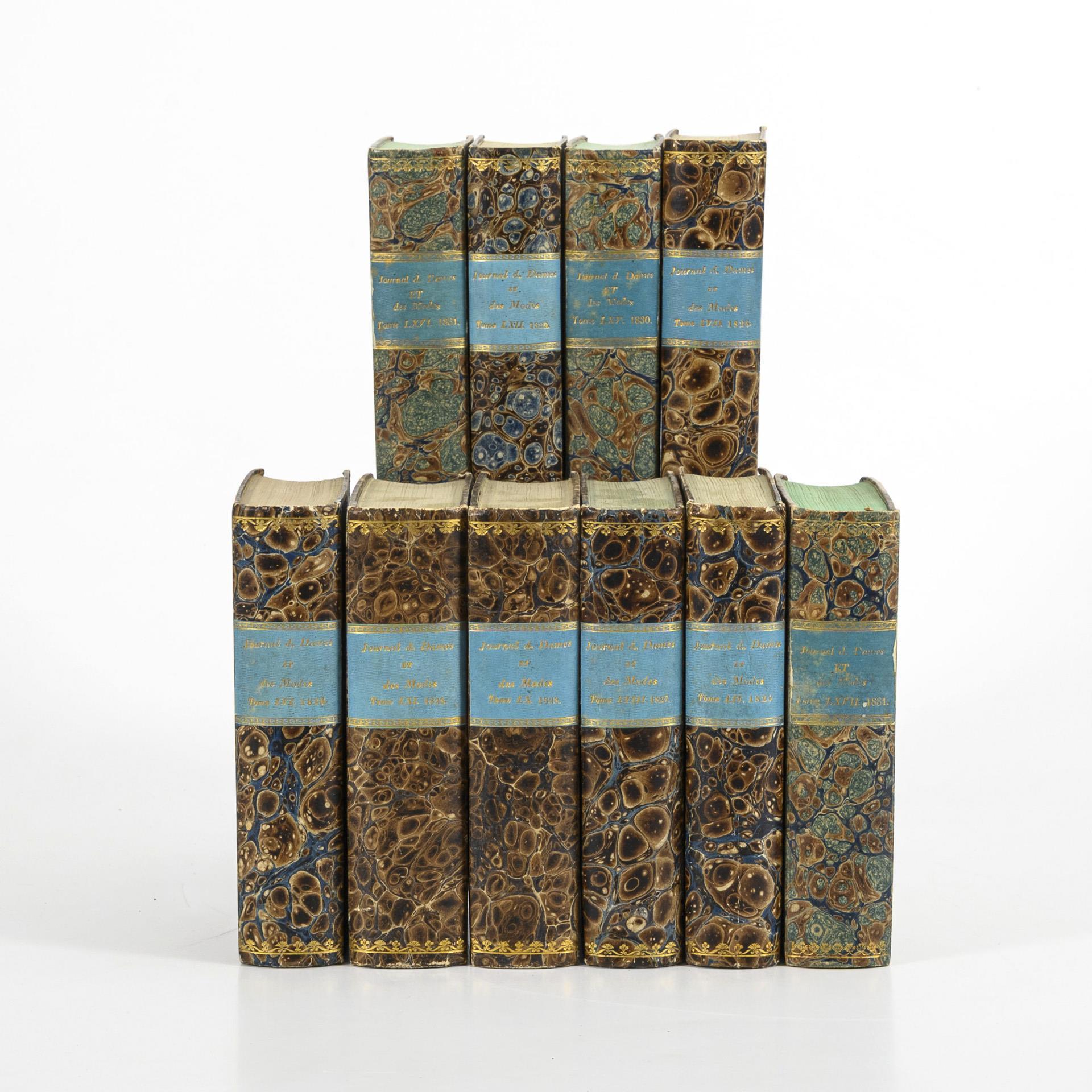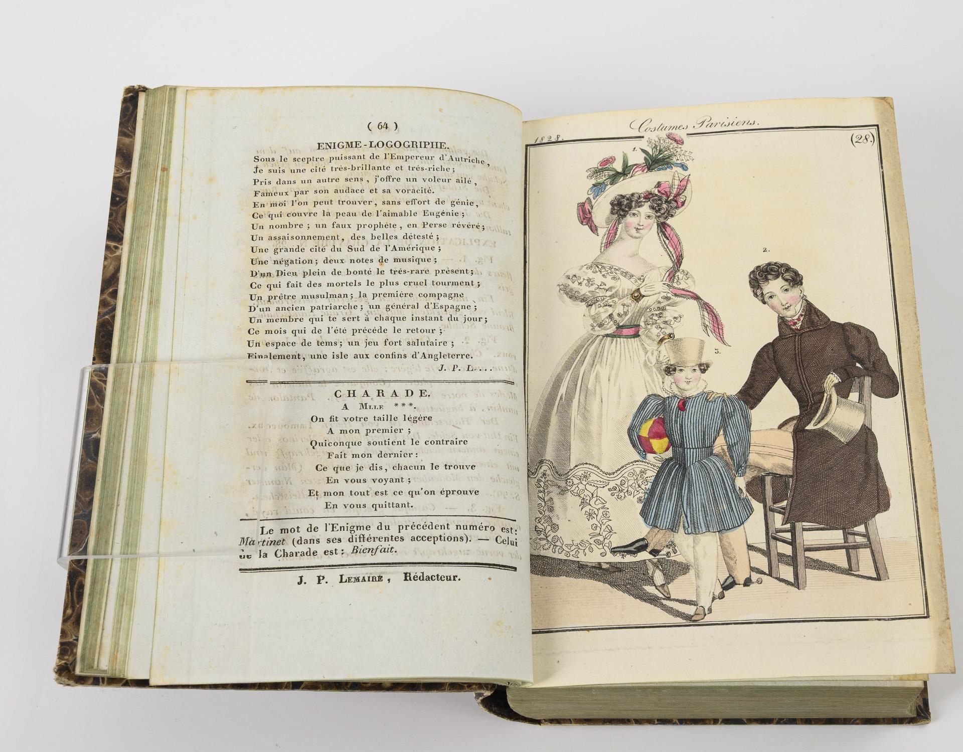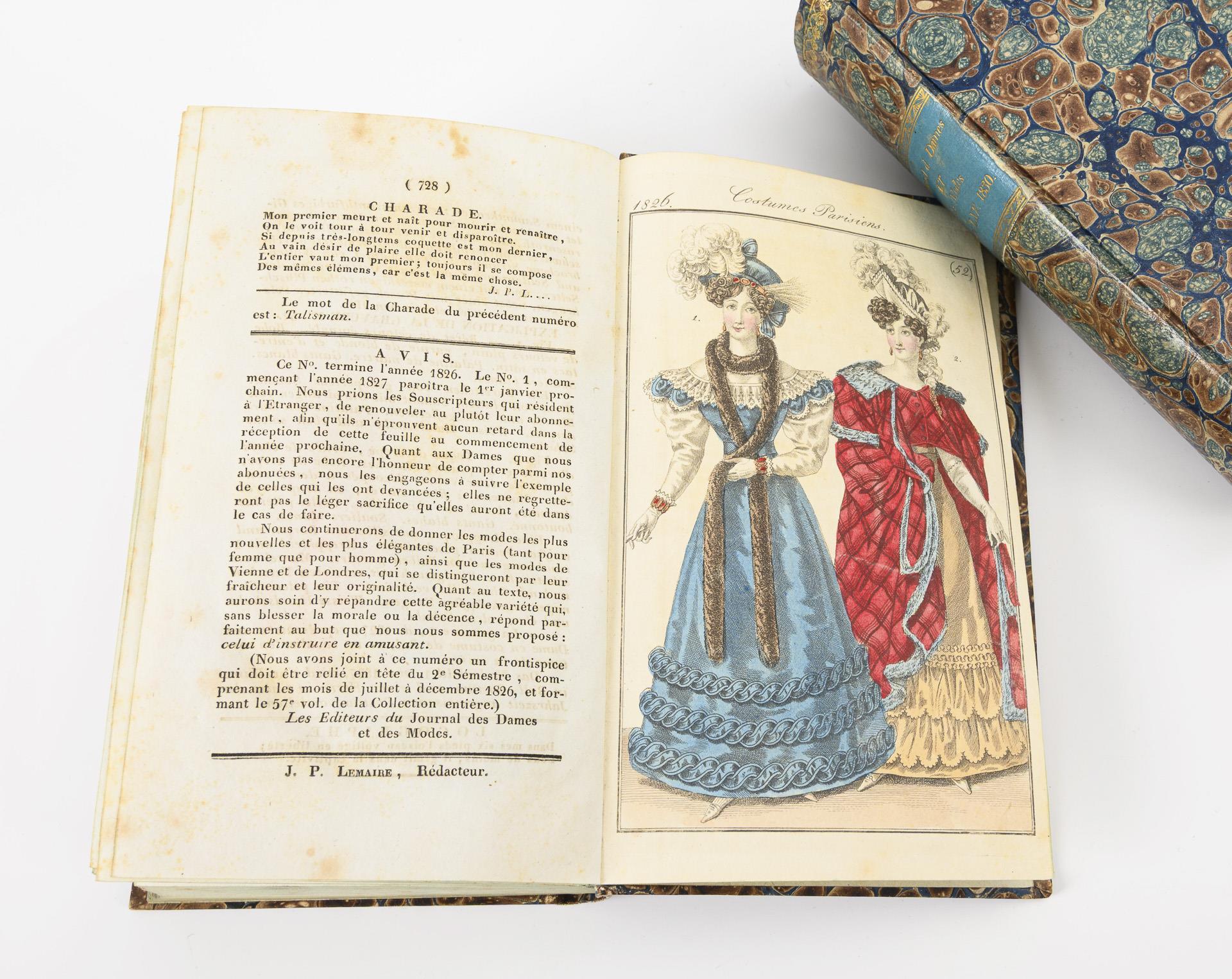 In französischer Sprache, die Erklärung der kolorierten Modekupfer auch in Deutsch. Einbände in sehr ähnlichem Marmorpapier mit einheitlichem Rückenschild, teils mit Grünschnitt. Alle Bände mit vielen Abbildungen, jedoch nicht kollationiert. Die Heft-Titelseite jeweils mit dem Steuerstempel der "Freie Stadt Fra(nkfurt)". 1825 Band 54; 1826 Band 56 und 57; 1827 Band 58; 1828 Band 60 und 61; 1829 Band 62; 1830 Band 65 und 66; 1831 Band 68. Schöner und guter Zustand.