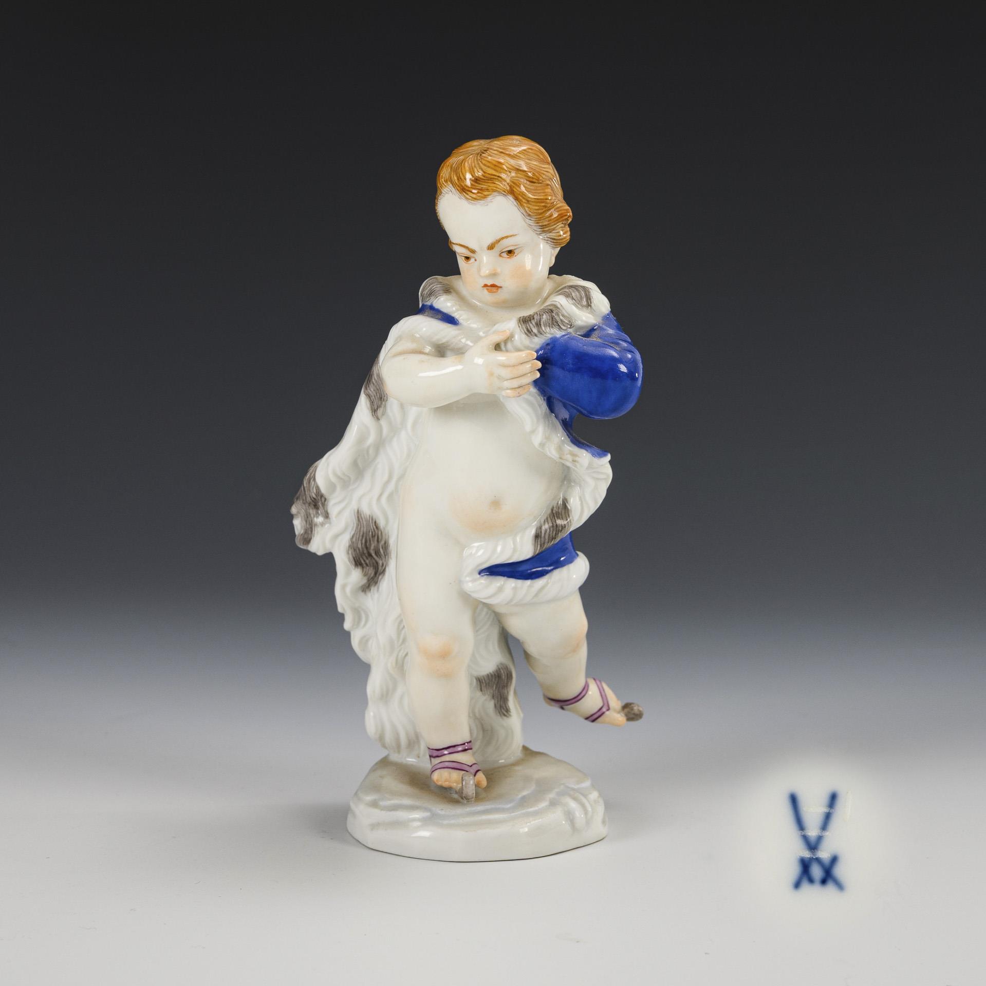 Putto mit Pelzmantel und Schlittschuhen.