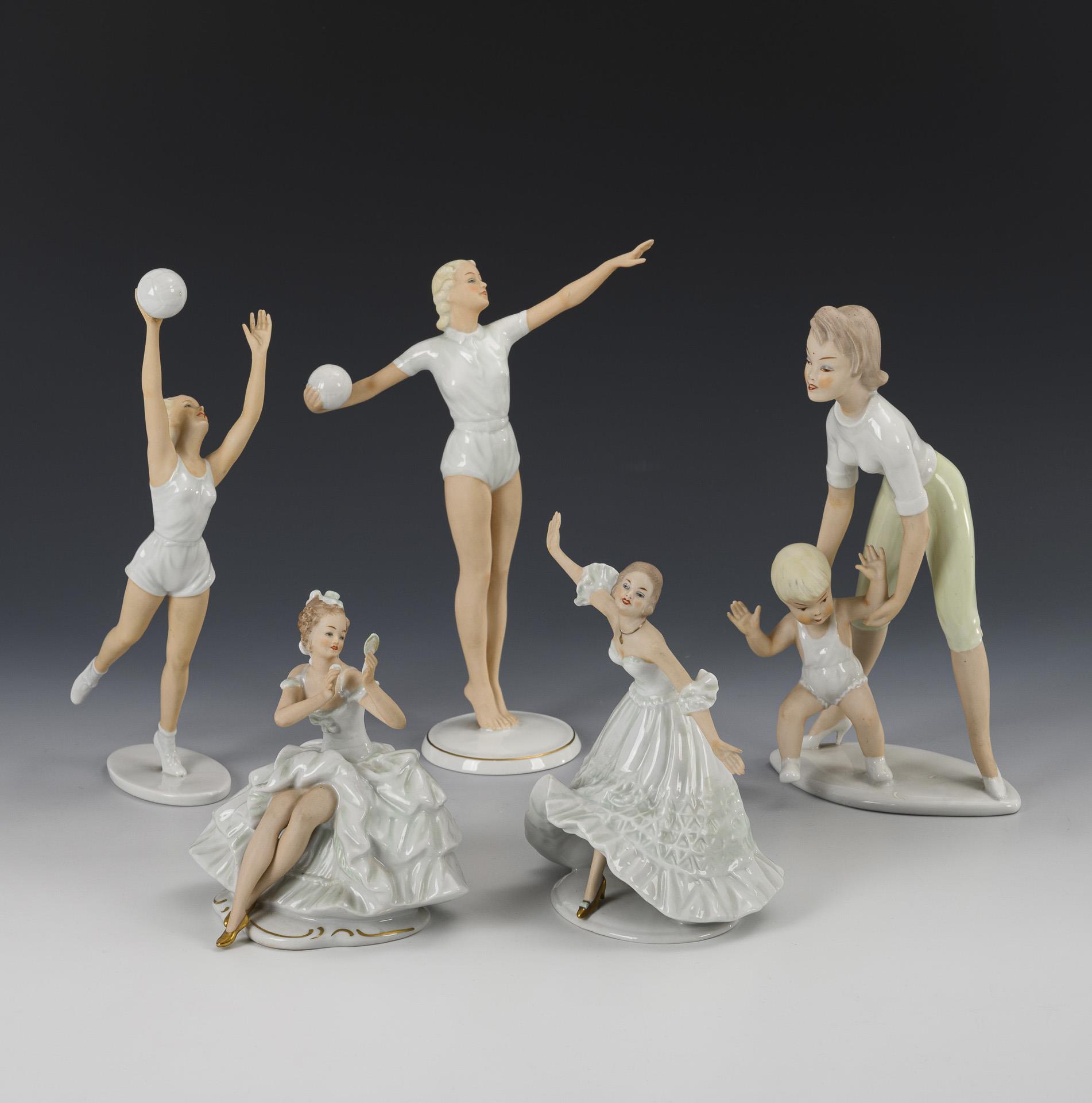 3x WALLENDORF: 1x Mutter mit Kind (H 24,5 cm), 1x Rokokodame (H 14 cm) und 1x Tänzerin im Ballkleid (H 17 cm). / 2x SCHAUBACH: 2 Balltänzerinnen (H 25,5 und 26 cm).