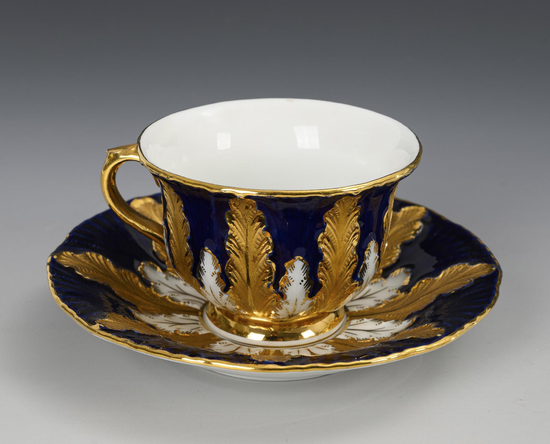 1x Kuchenteller "B-Form": weiß mit Goldstaffage (Ø 31 cm). / 1x Mokkatasse (H 5 cm) mit teils goldbronziertem Blattrelief und Kobaltteilfond, originale Untertasse (Ø 12,5 cm).