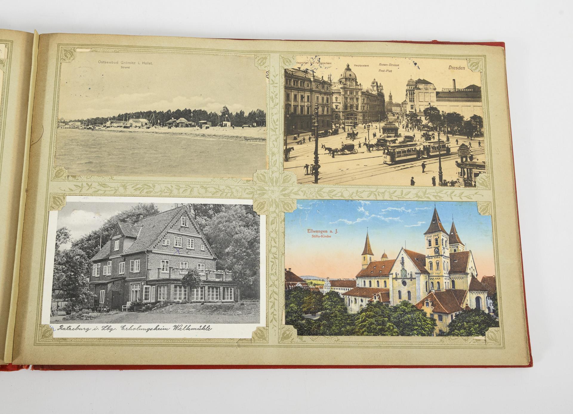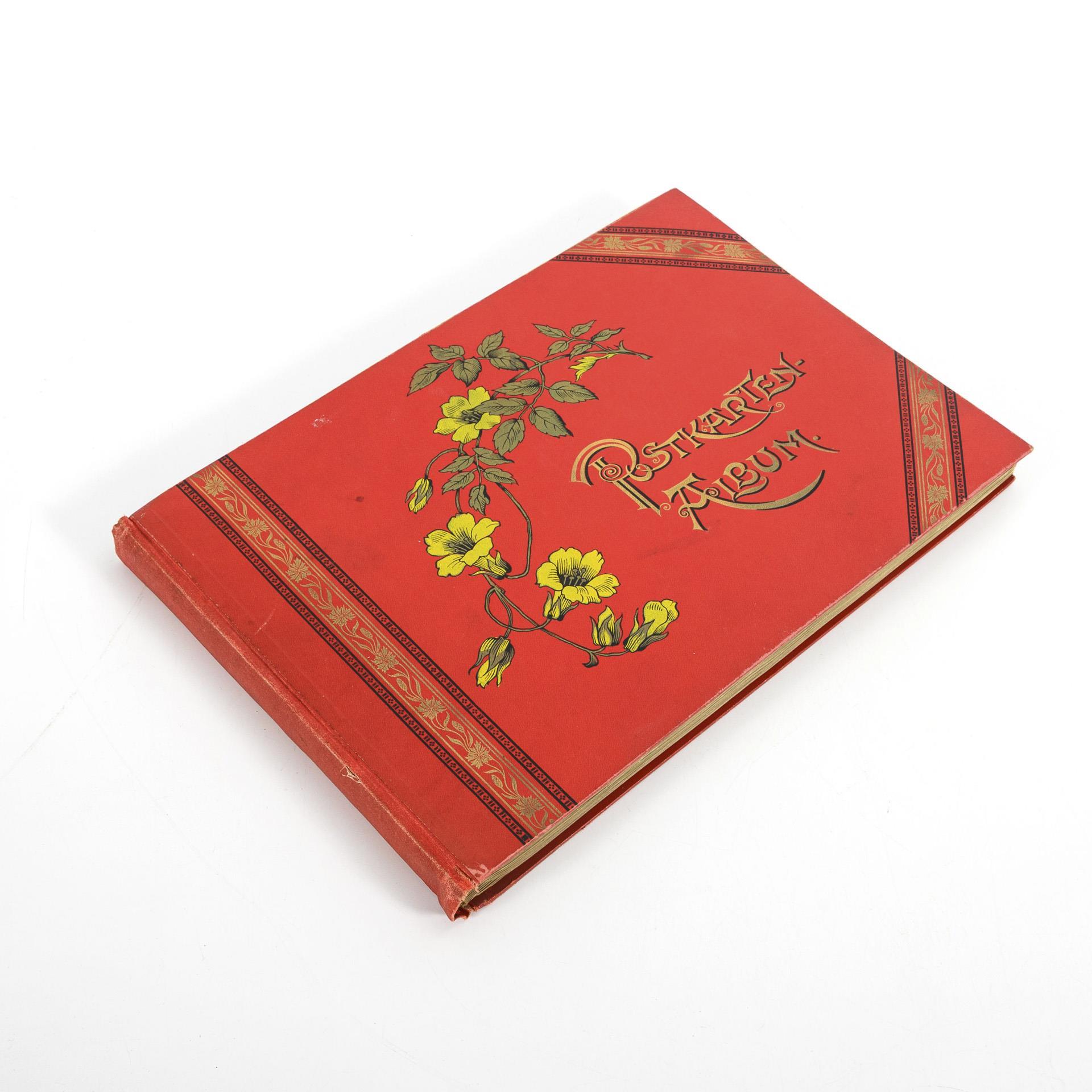 Darunter "Gruß aus ..." Karten, um 1900 - 1920, im rotem "Postkarten-Album".