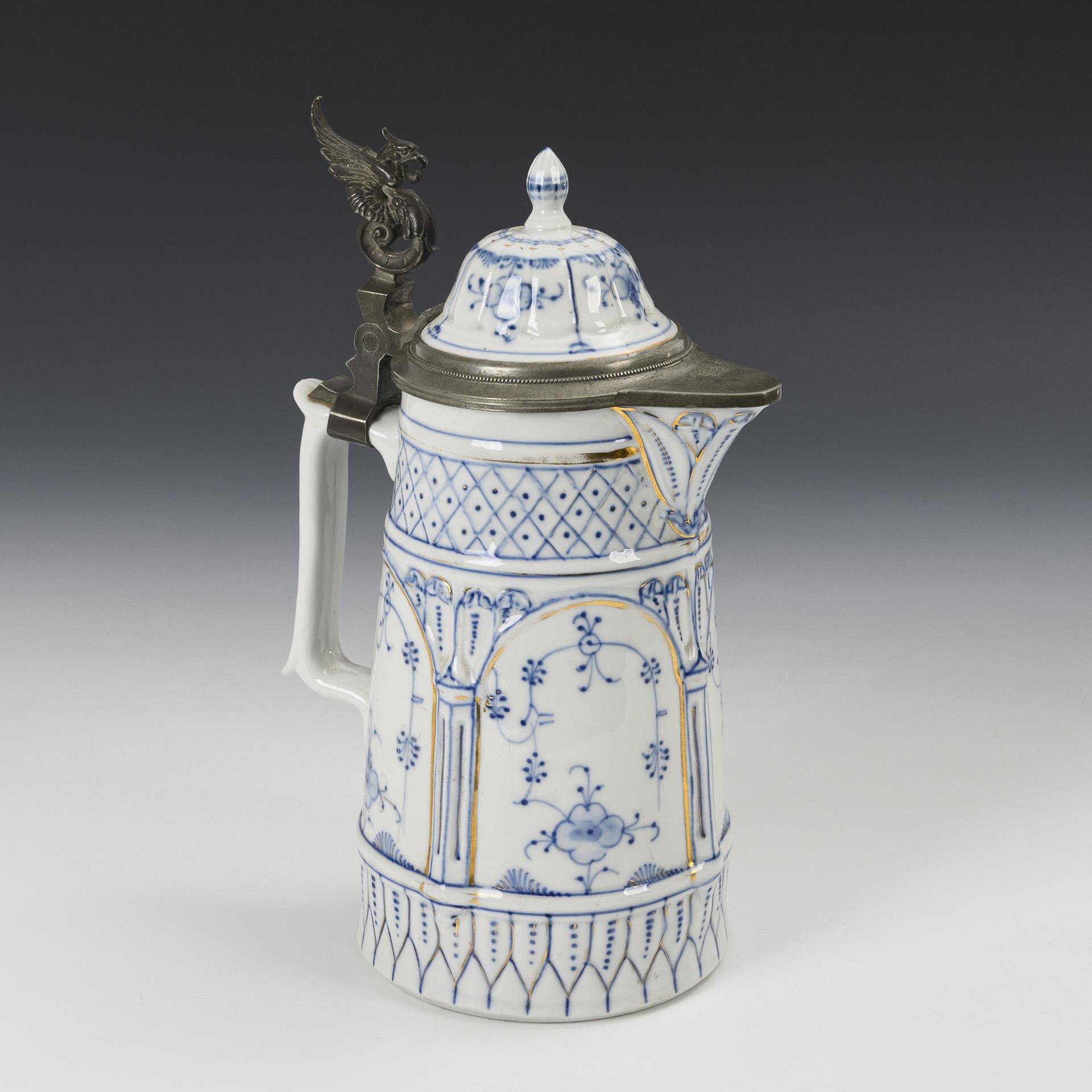 Konischer Krug mit Arkadenrelief, gewinkeltem Henkel und zinnmontiertem Scharnierdeckel mit Greifendrücker.