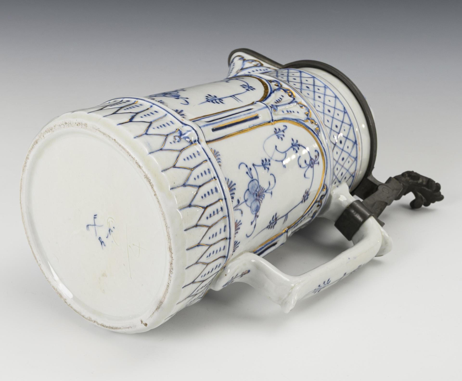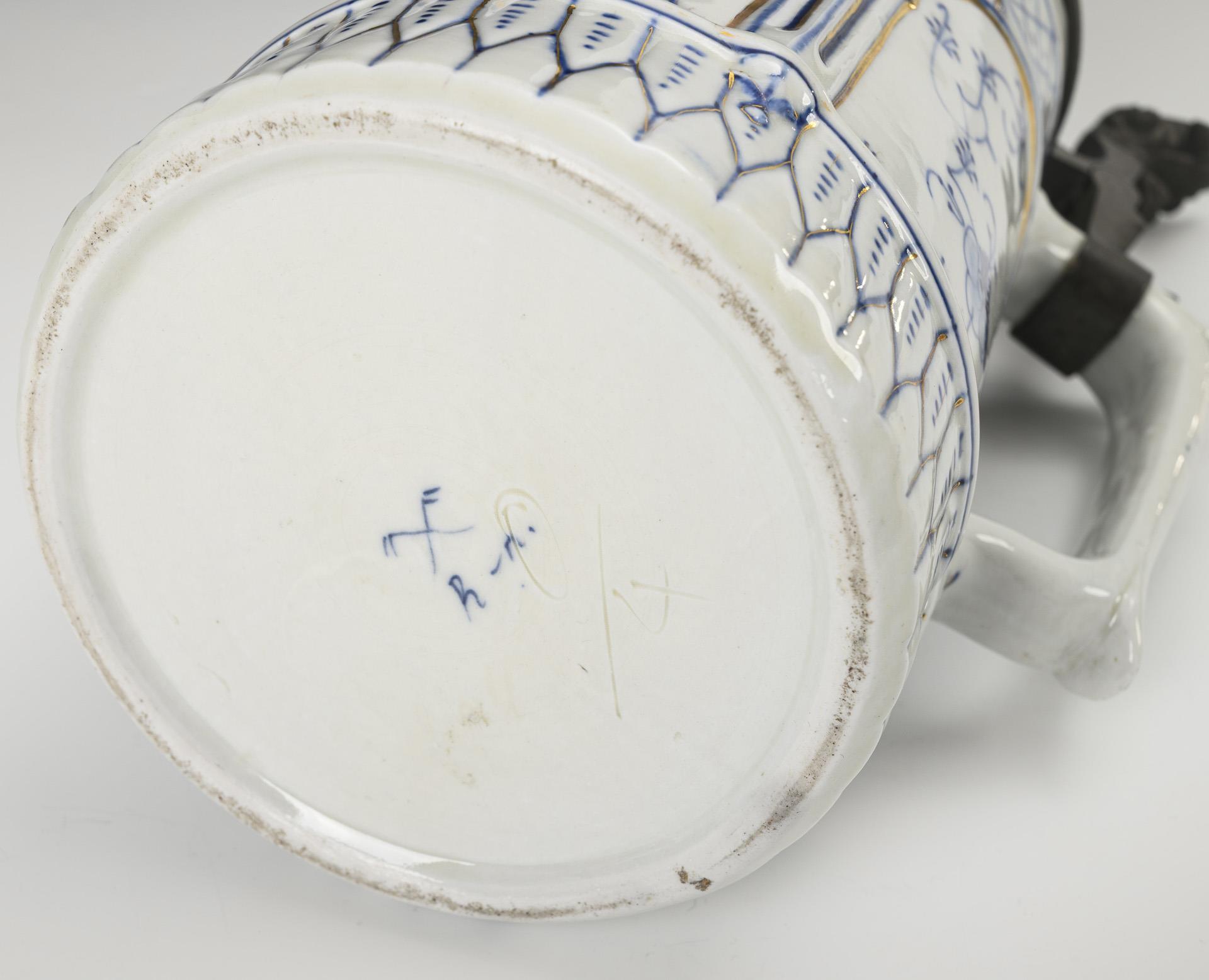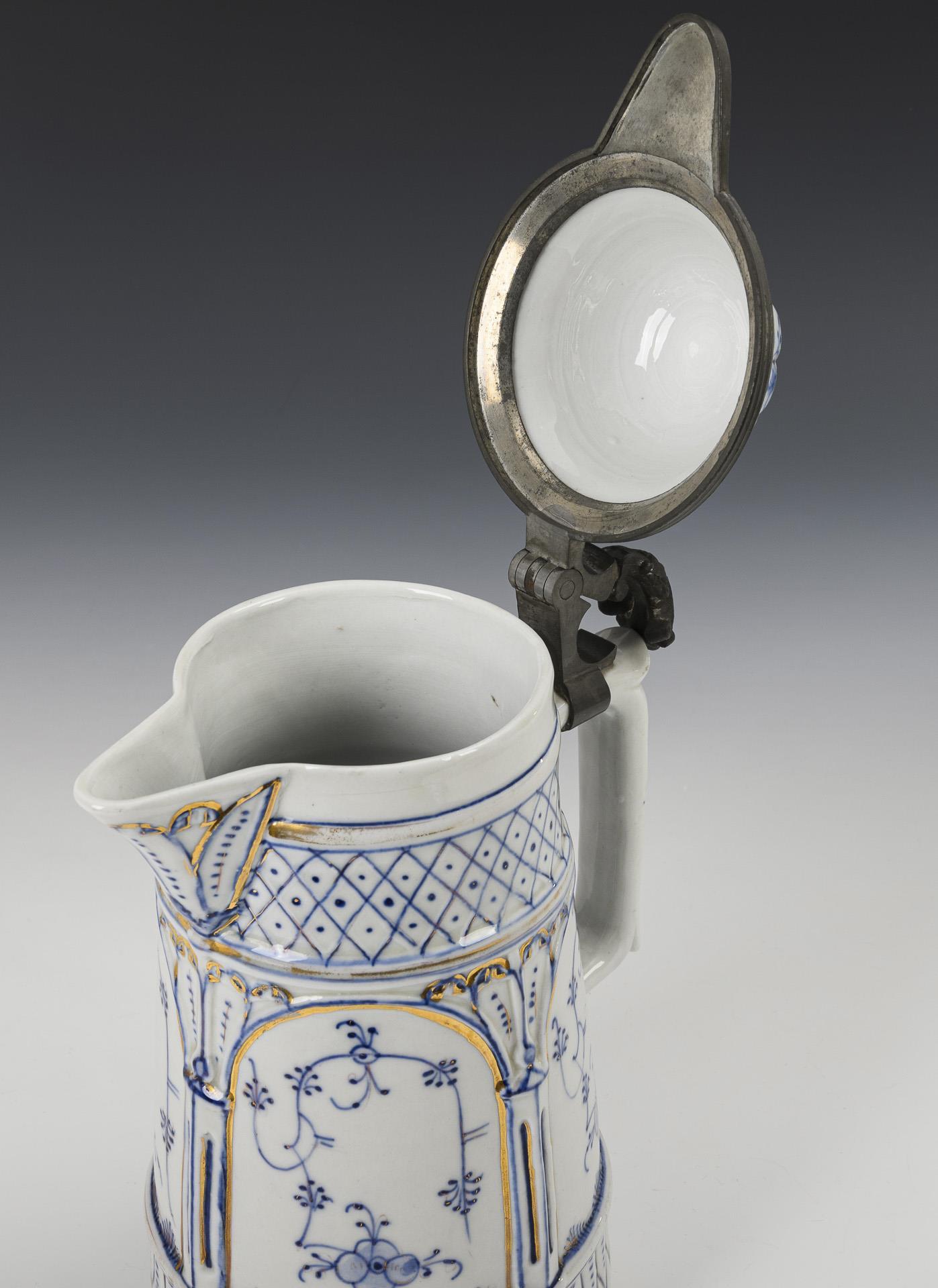 Konischer Krug mit Arkadenrelief, gewinkeltem Henkel und zinnmontiertem Scharnierdeckel mit Muscheldrücker. Partieller Goldabrieb.