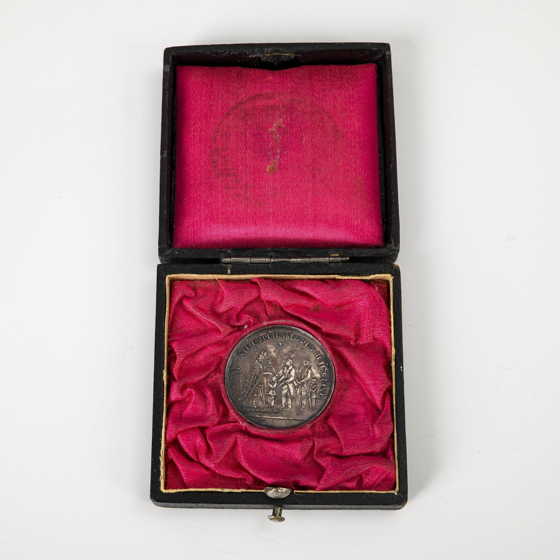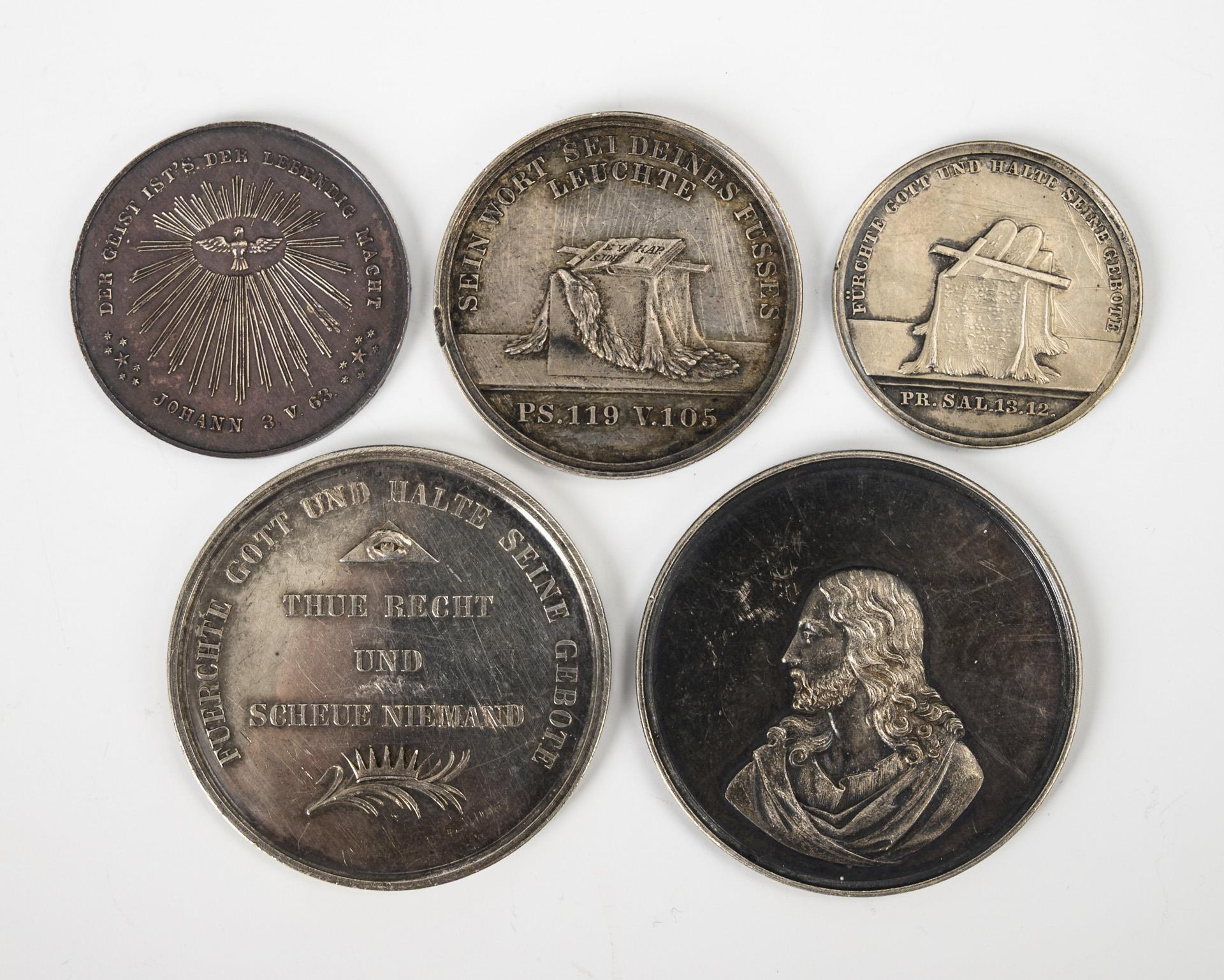 Tauftaler/Taufmedaillen 1x im originalen schwarzen Lederetui: "L W&C" gemarkte Taufszene mit Umschrift "Sie empfiengen den Heil Geist", revers Taube mit Bibelzitat. / 4 verschiedene Medaillen; alle mit Christusbildnis: Revers Taufe Christi, 2x Altar und 1x mit Sinnspruch. Je Alters-/Gebrauchsspuren, 2x stärkere.